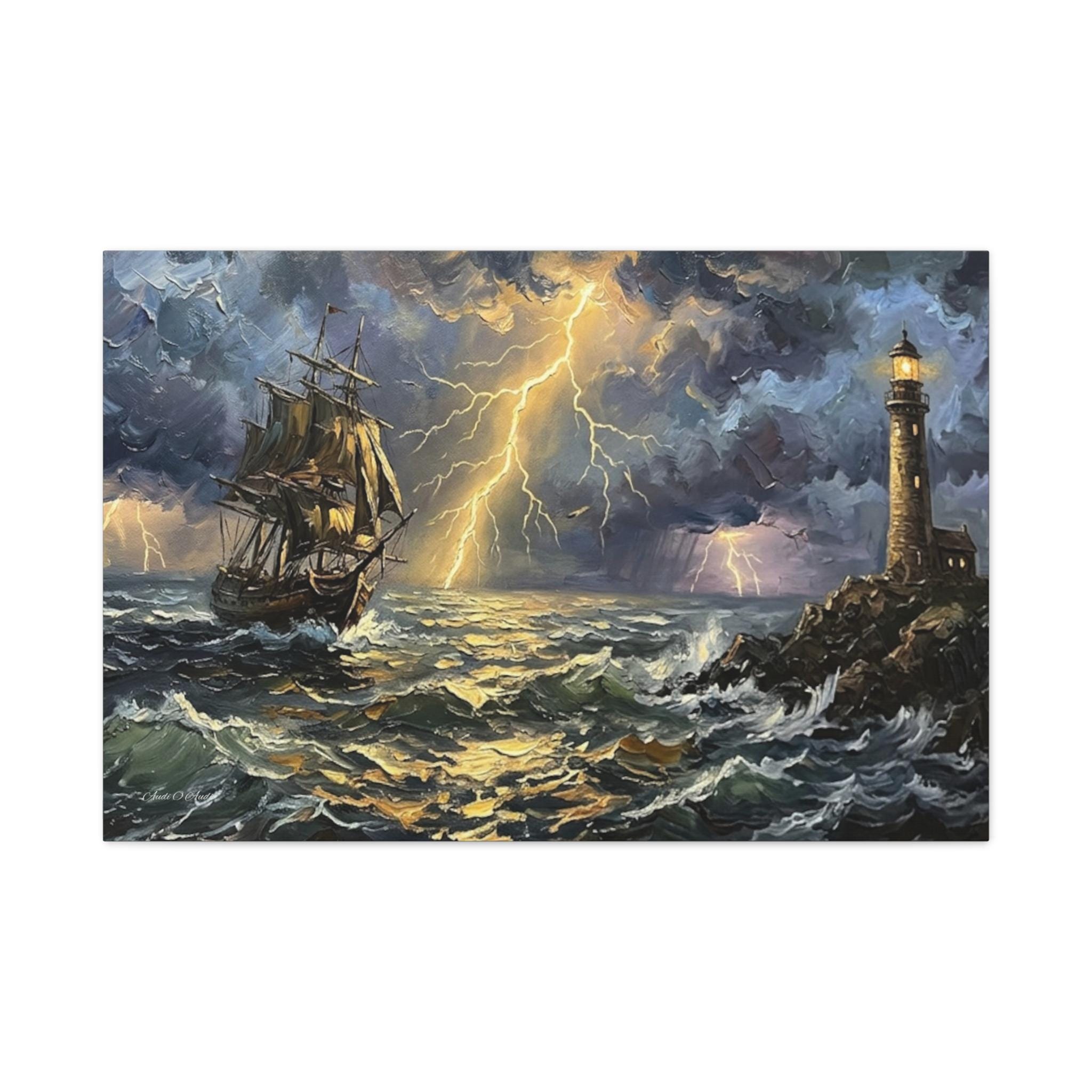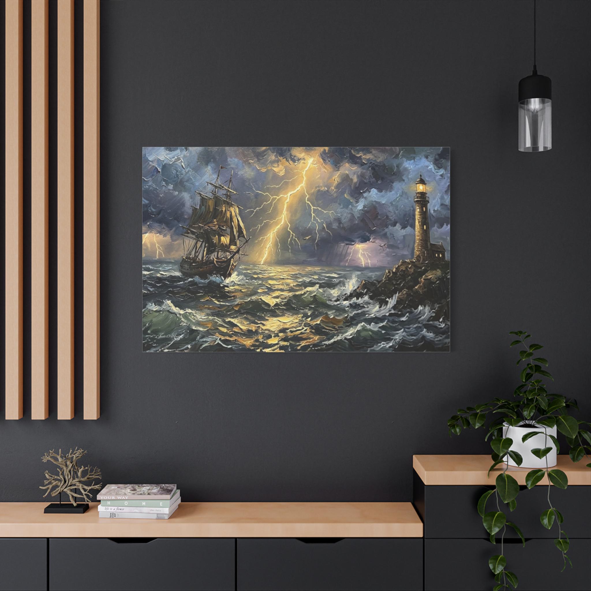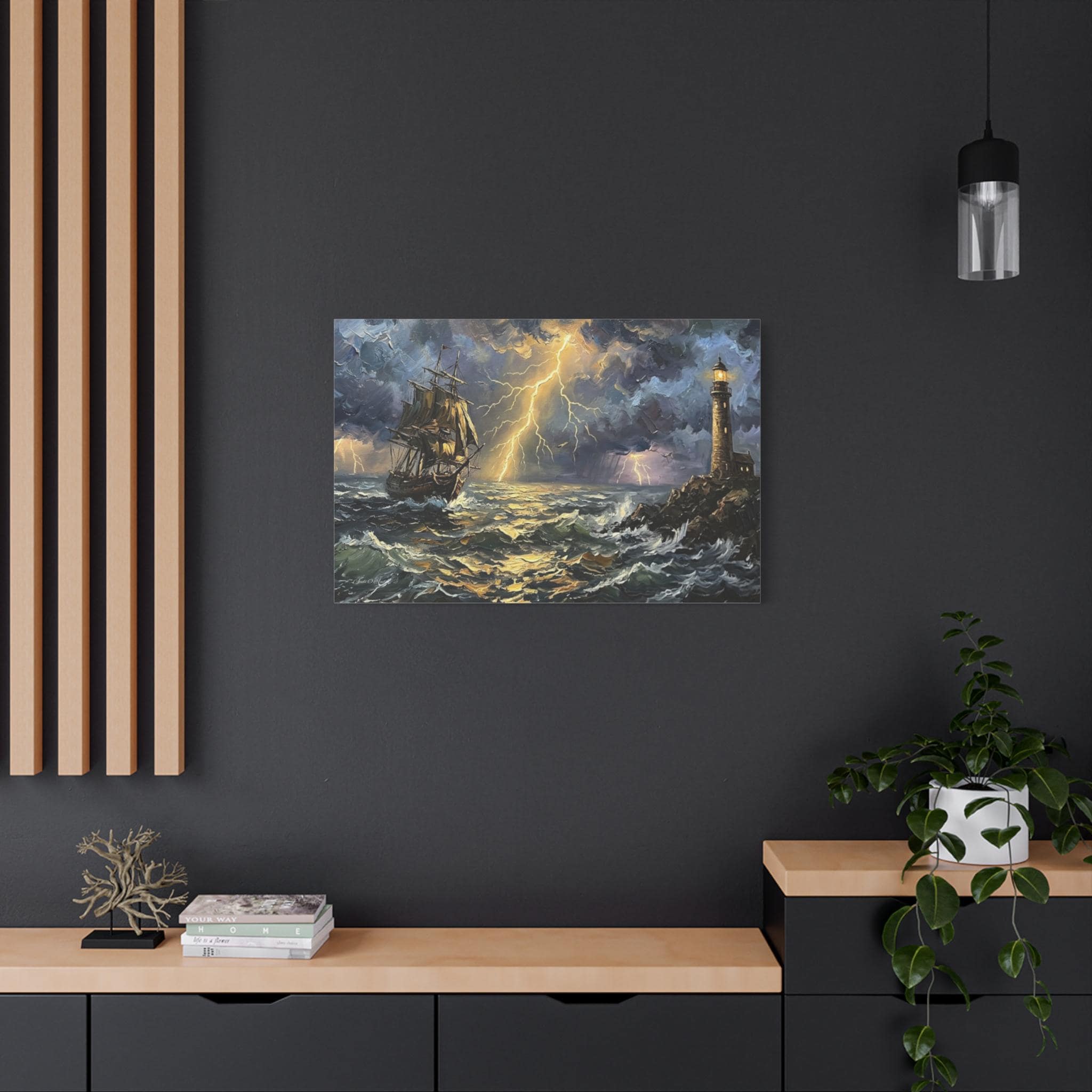 Bring the raw power, epic drama, and resilient spirit of the open ocean into your home with this stunning maritime storm canvas print. This captivating horizontal artwork features a magnificent vintage sailing ship navigating through fierce, churning waters. A brilliant, jagged strike of golden lightning tears through the heavy, brooding storm clouds, illuminating the scene and guiding the eye toward a steadfast stone lighthouse glowing warmly on the rocky coastal cliffs.