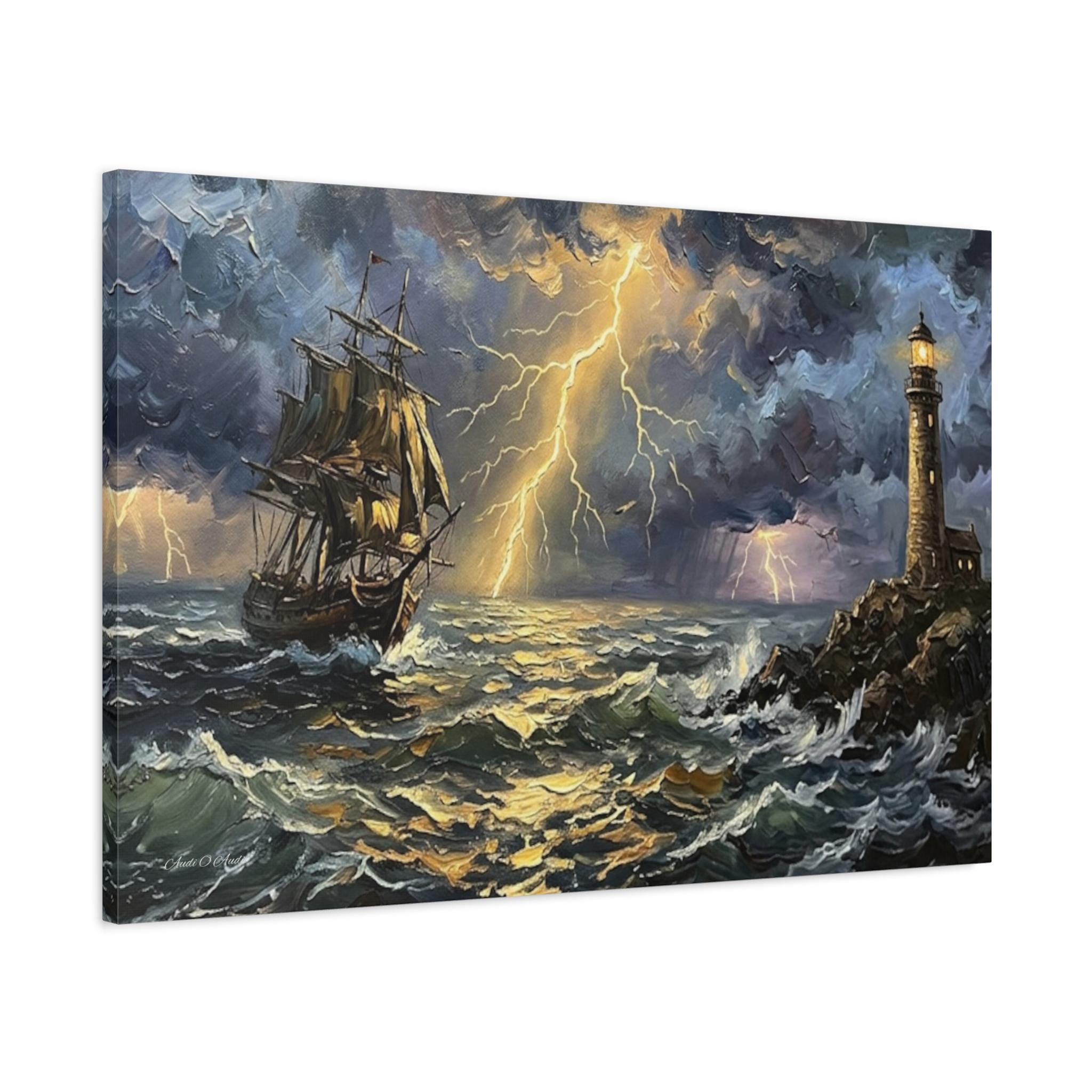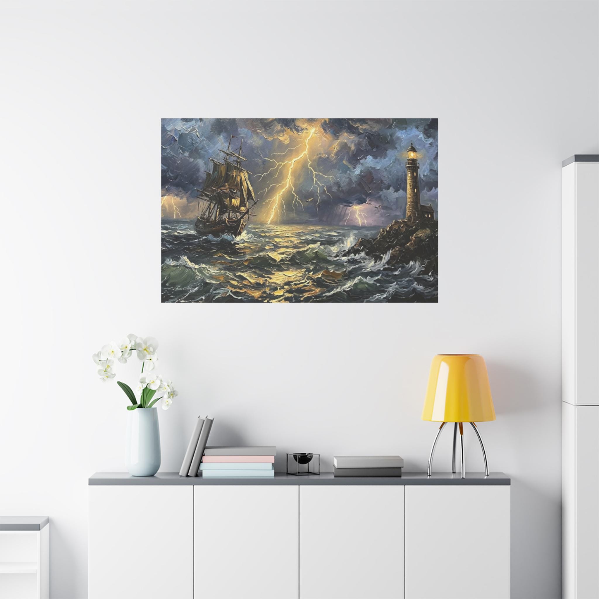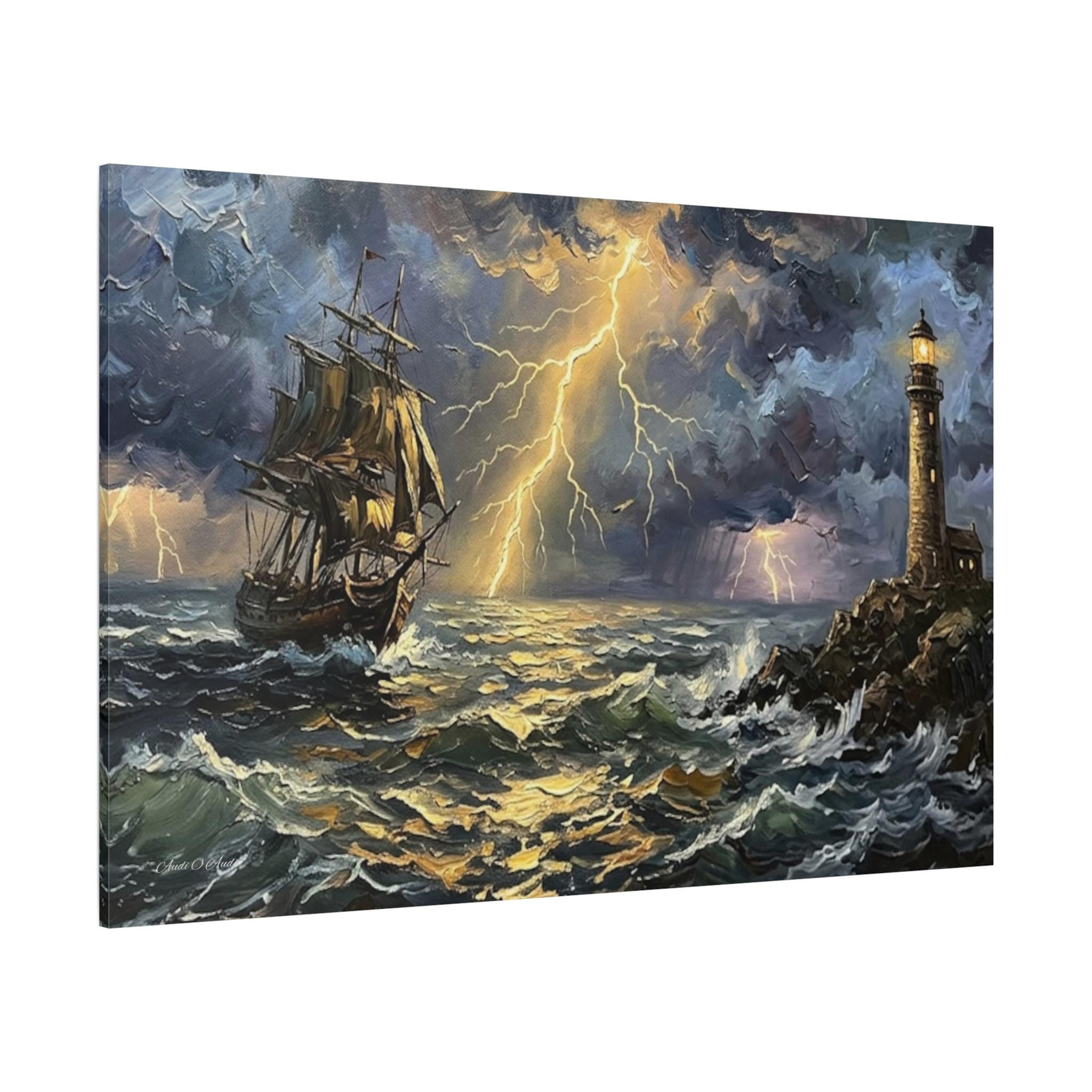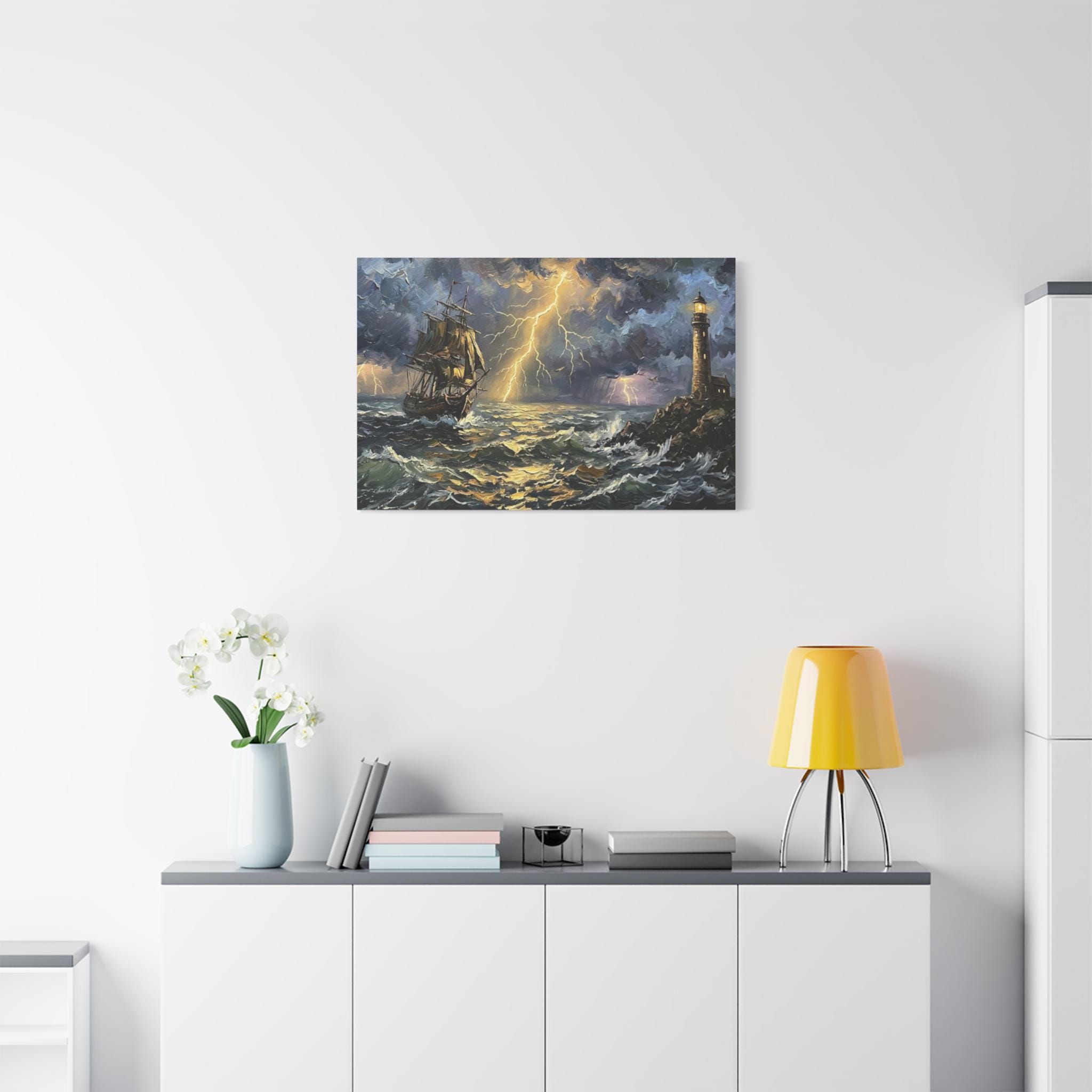 Bring the raw power, epic drama, and resilient spirit of the open ocean into your home with this stunning maritime storm canvas print. This captivating horizontal artwork features a magnificent vintage sailing ship navigating through fierce, churning waters. A brilliant, jagged strike of golden lightning tears through the heavy, brooding storm clouds, illuminating the scene and guiding the eye toward a steadfast stone lighthouse glowing warmly on the rocky coastal cliffs.
