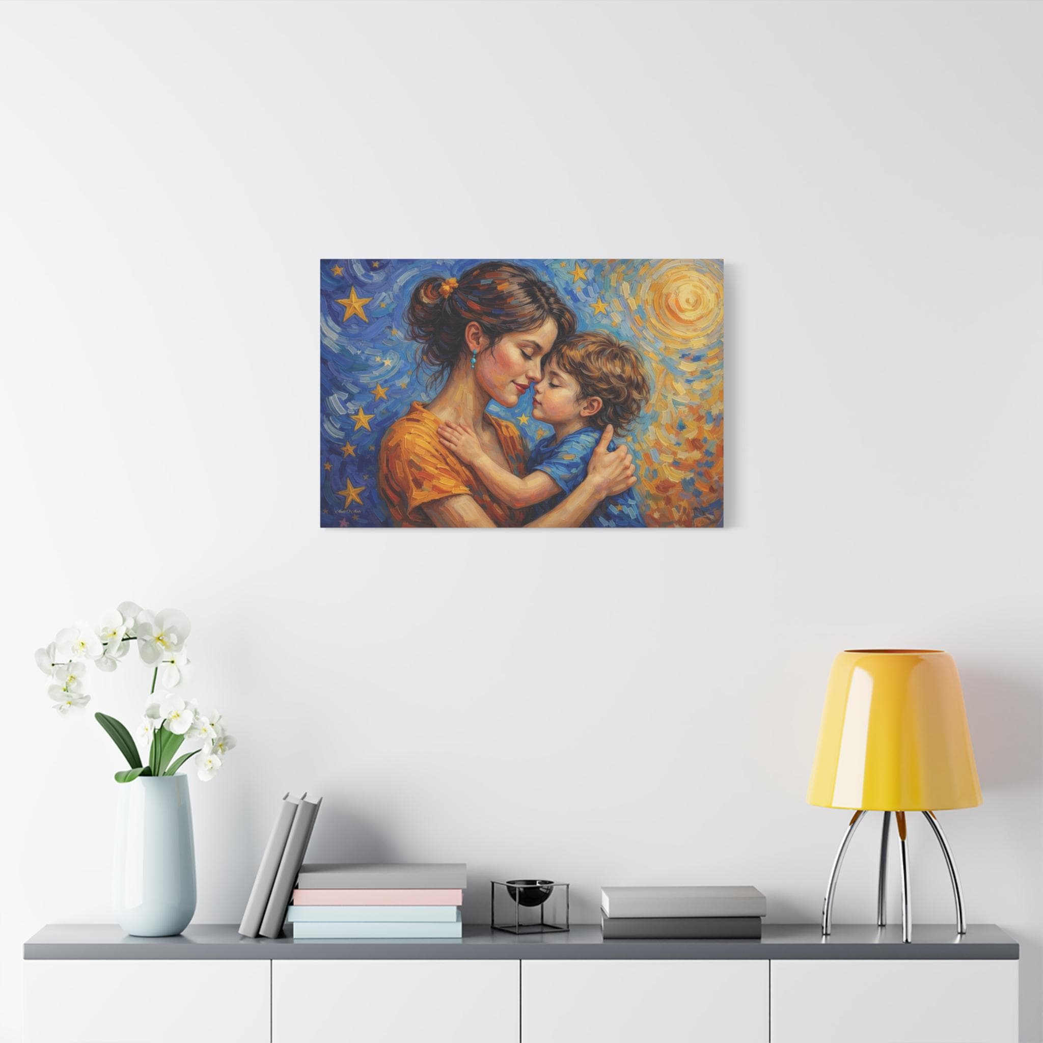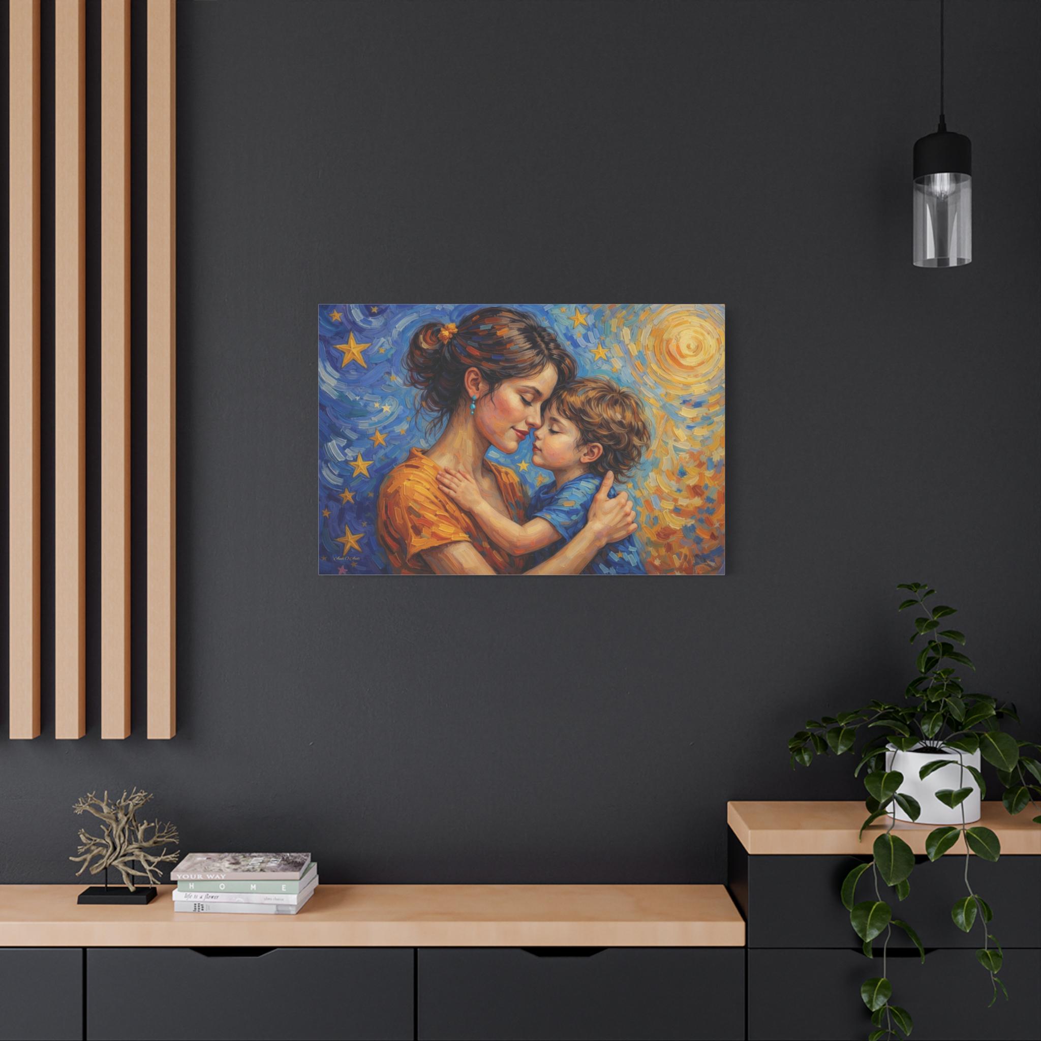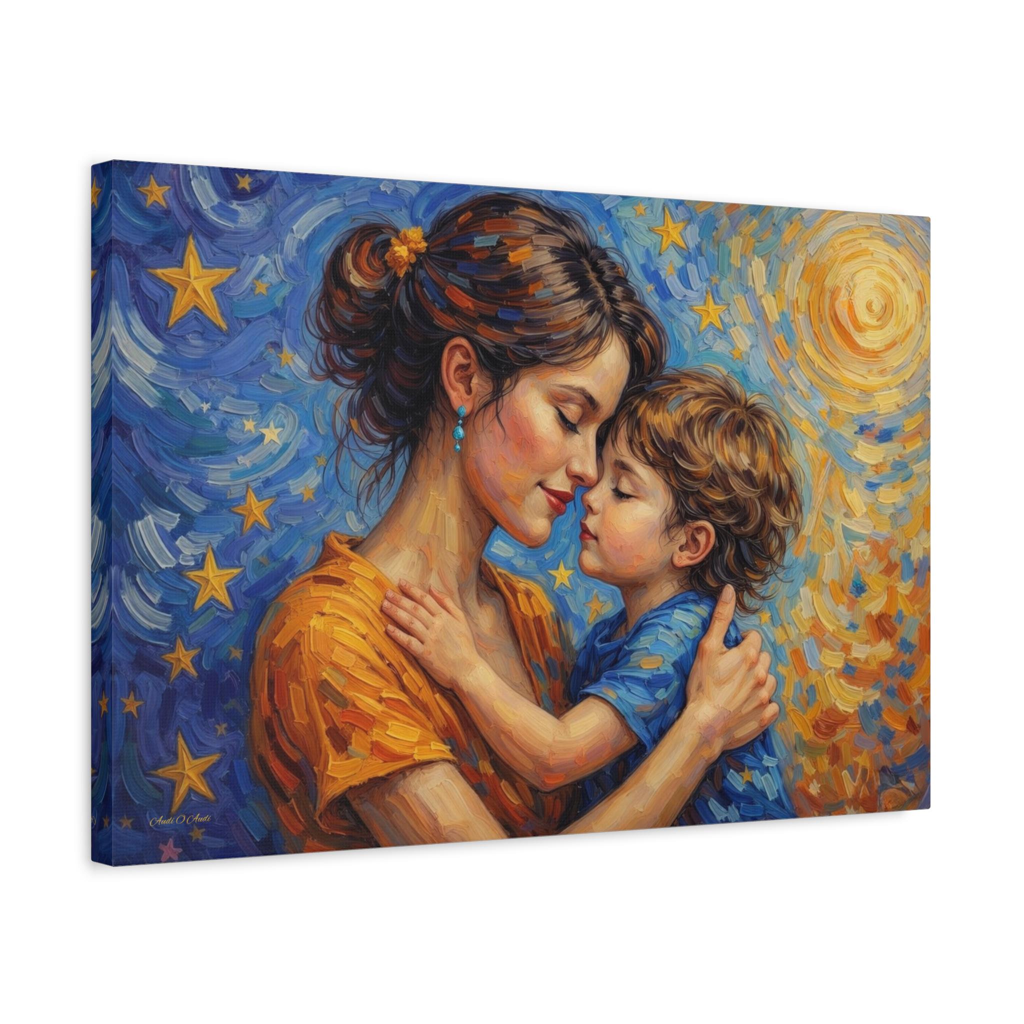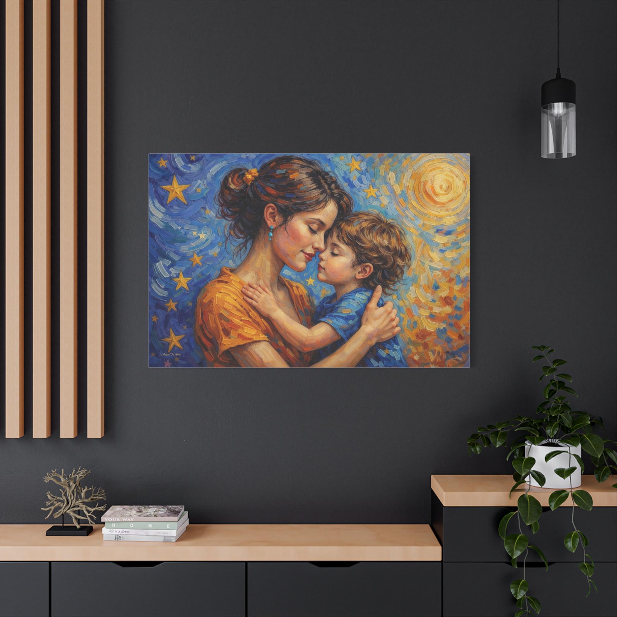 Celebrate the magical, unconditional bond of motherhood with this stunning mother and child canvas print. This captivating artwork features a tender, heartfelt embrace between a mother and her young child, set against a breathtaking, post-impressionist background. A radiant, golden sun swirls on one side, perfectly transitioning into a deep blue, starry night sky on the other, symbolizing a love that spans all hours of the day and night.