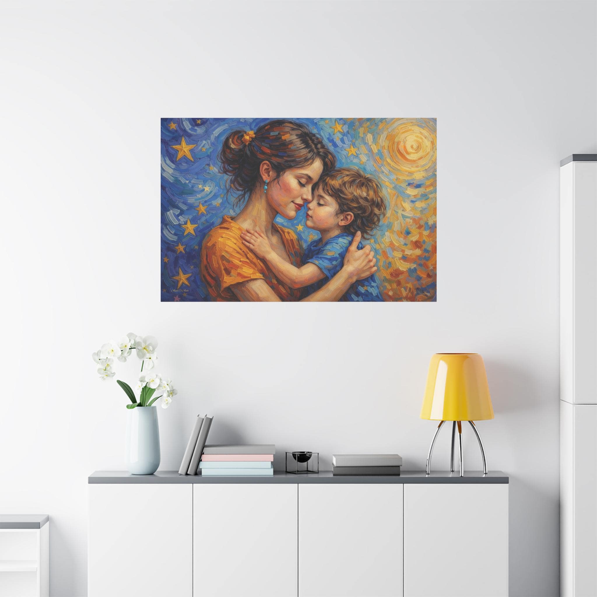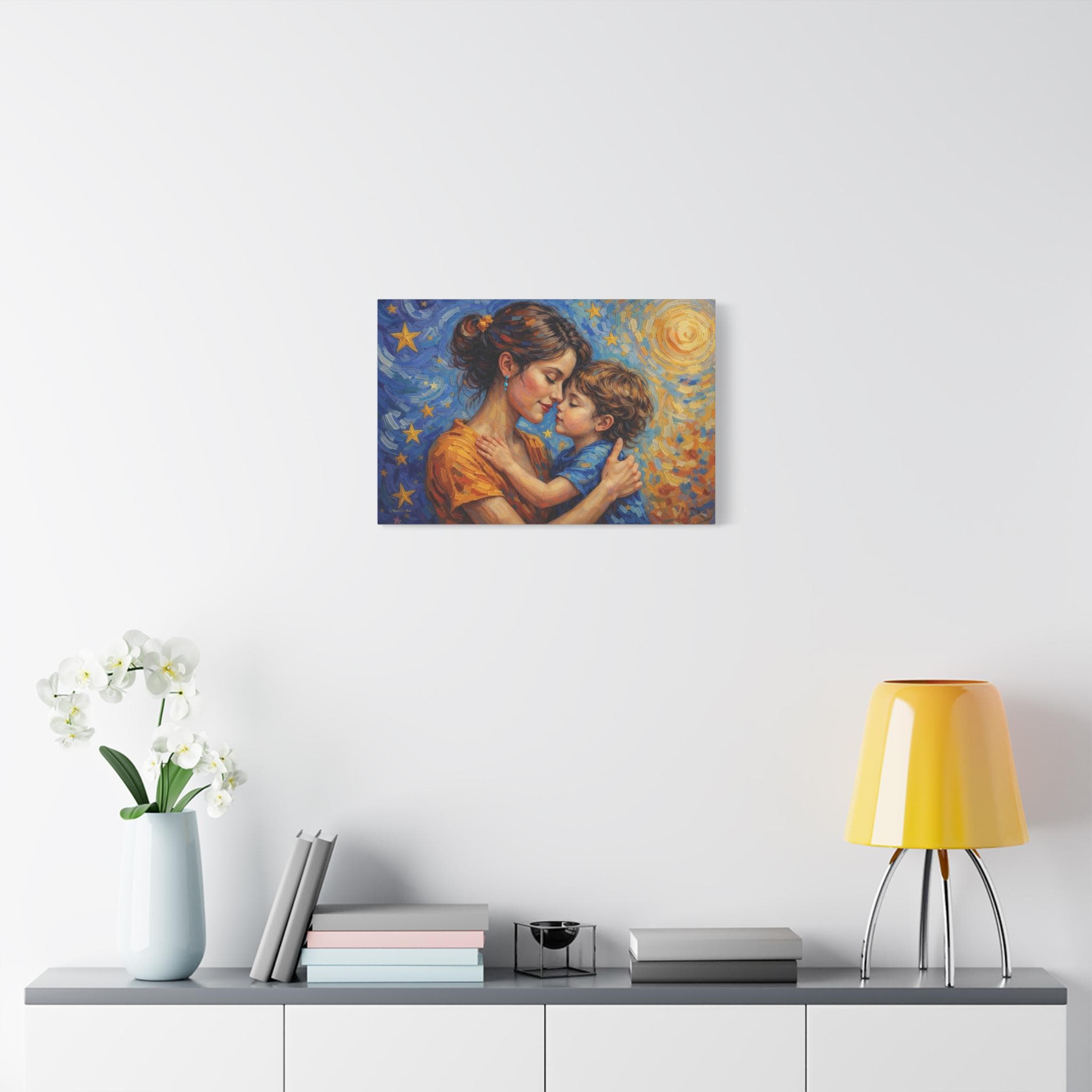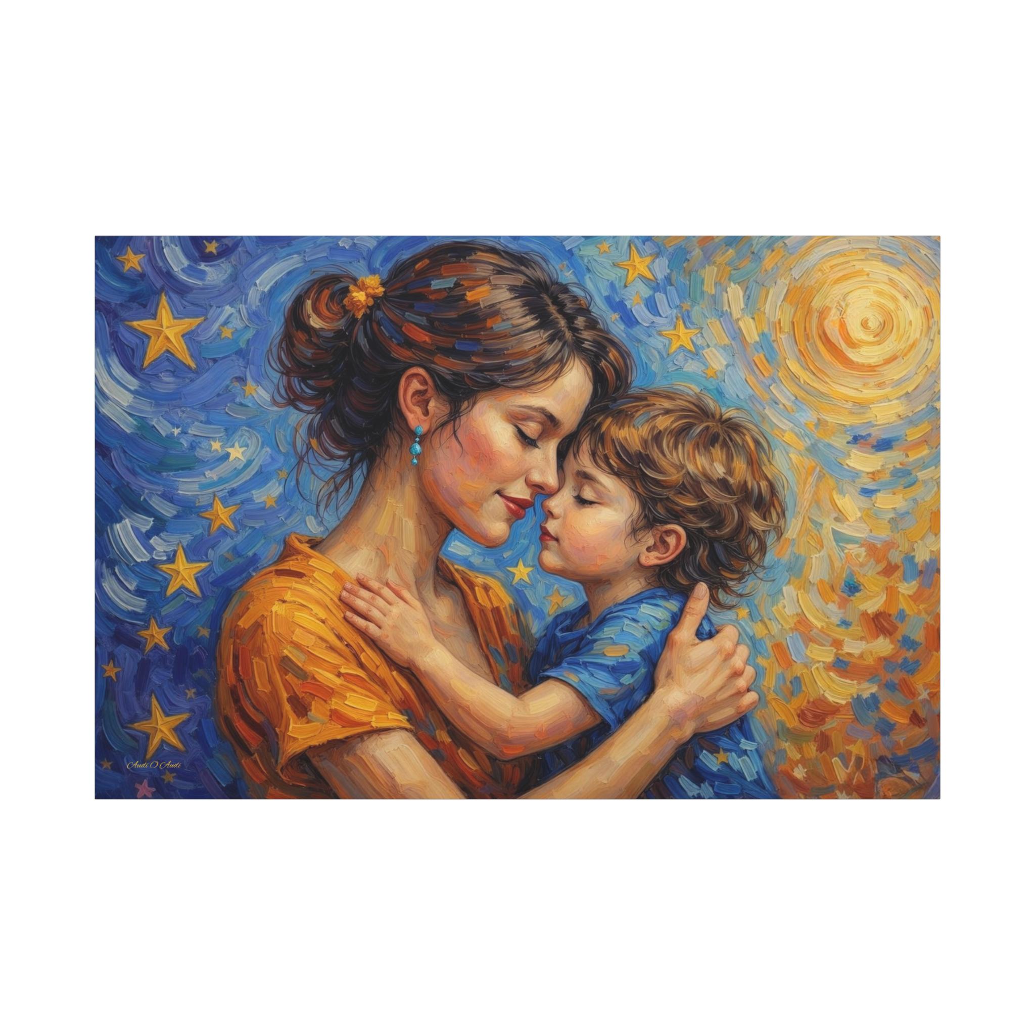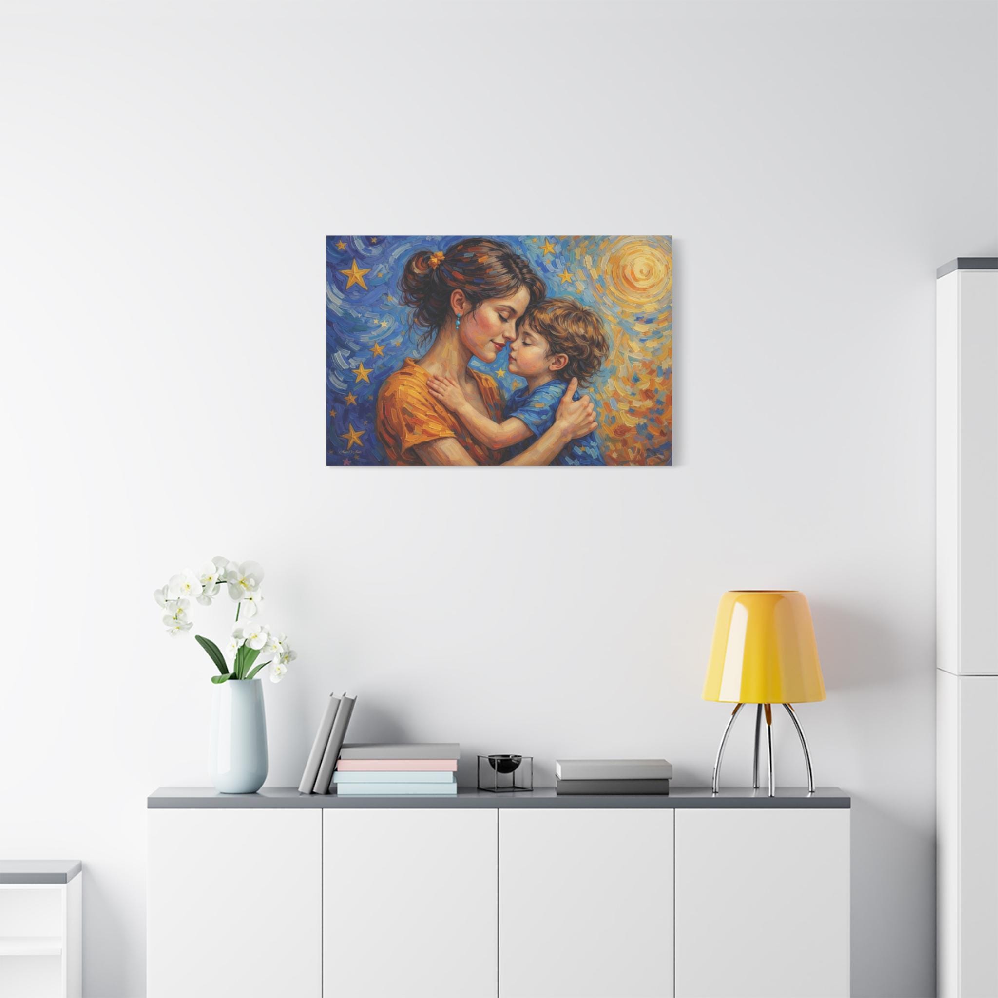 Celebrate the magical, unconditional bond of motherhood with this stunning mother and child canvas print. This captivating artwork features a tender, heartfelt embrace between a mother and her young child, set against a breathtaking, post-impressionist background. A radiant, golden sun swirls on one side, perfectly transitioning into a deep blue, starry night sky on the other, symbolizing a love that spans all hours of the day and night.