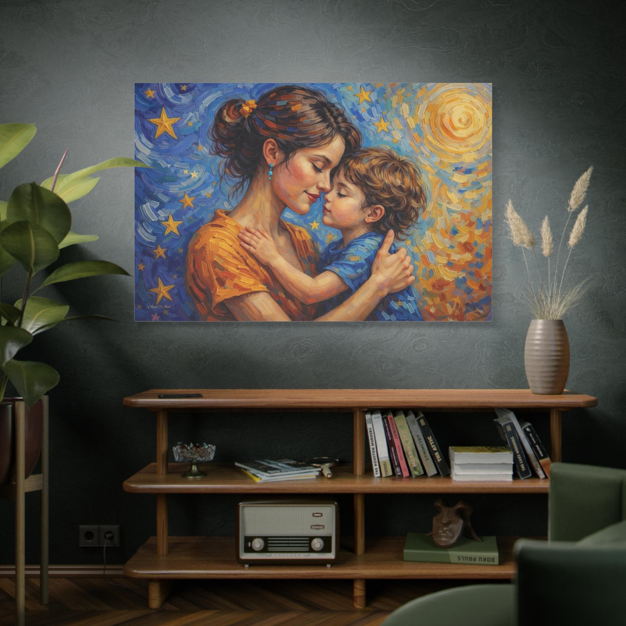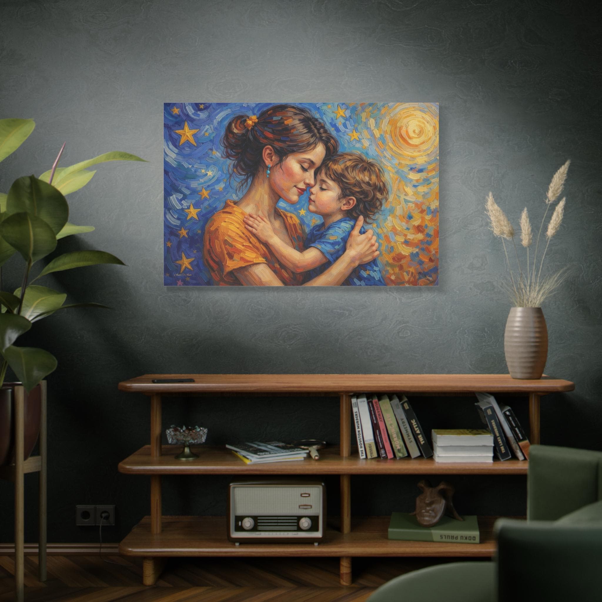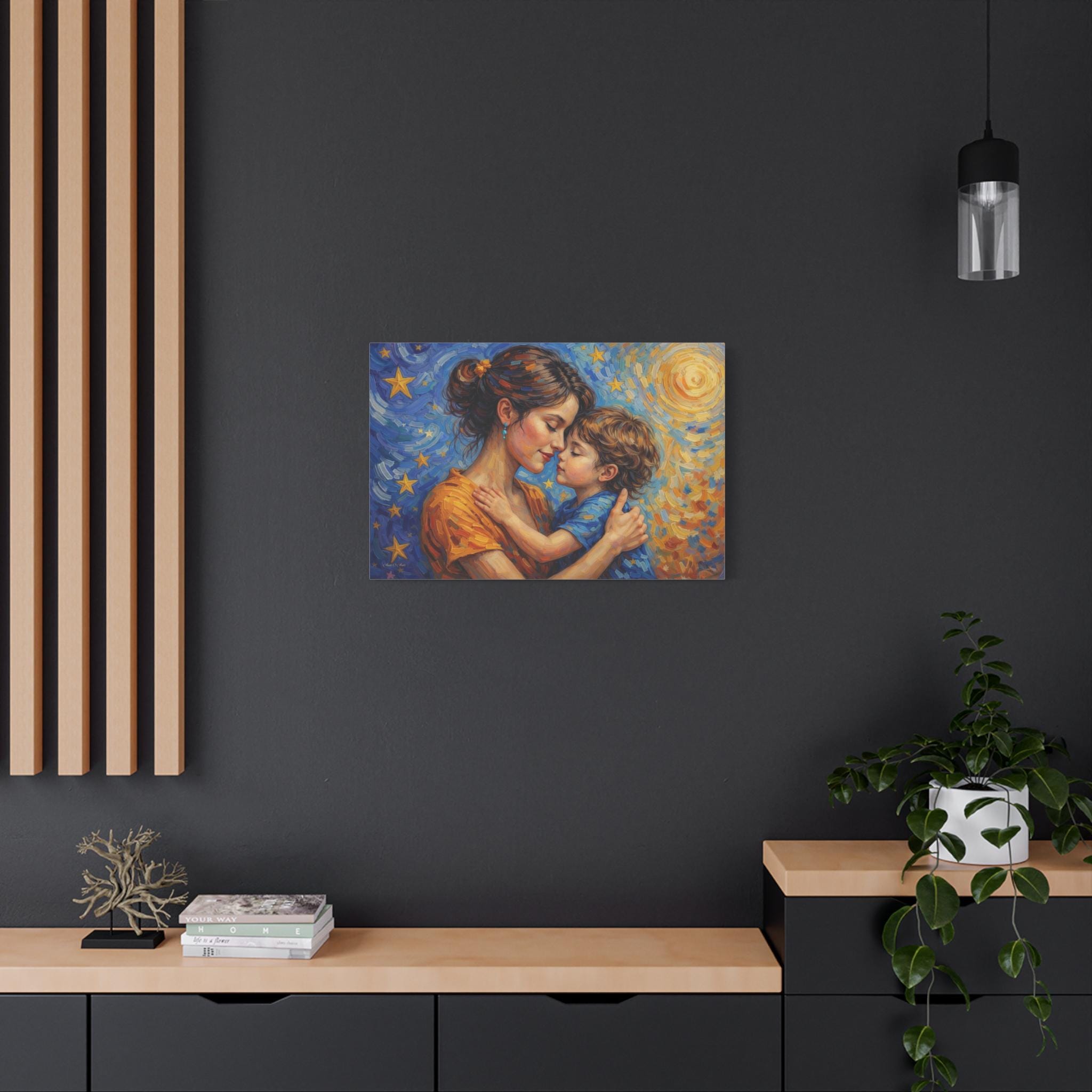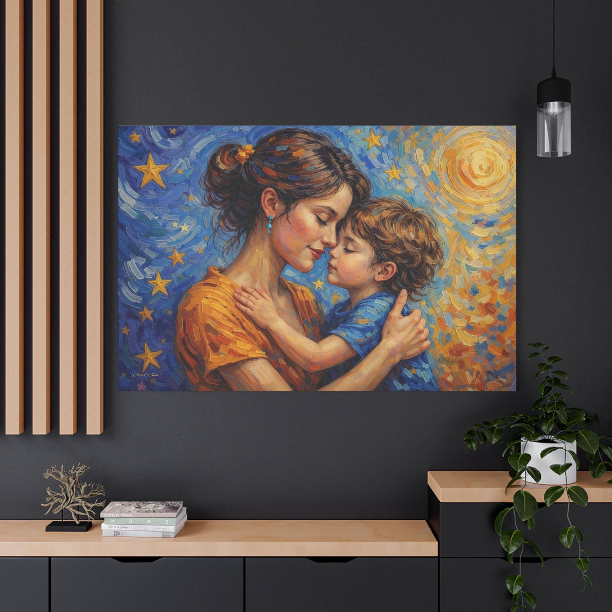 Celebrate the magical, unconditional bond of motherhood with this stunning mother and child canvas print. This captivating artwork features a tender, heartfelt embrace between a mother and her young child, set against a breathtaking, post-impressionist background. A radiant, golden sun swirls on one side, perfectly transitioning into a deep blue, starry night sky on the other, symbolizing a love that spans all hours of the day and night.