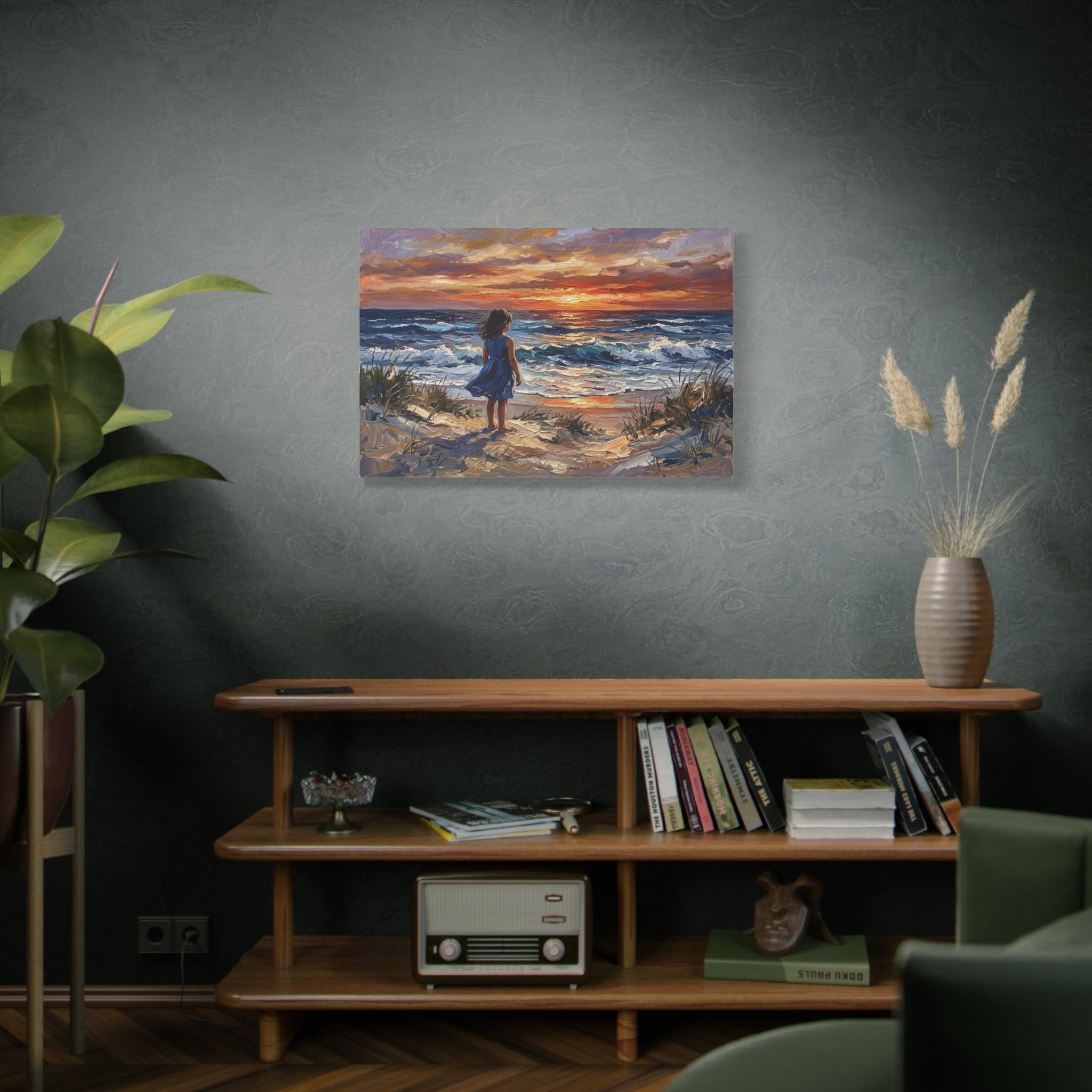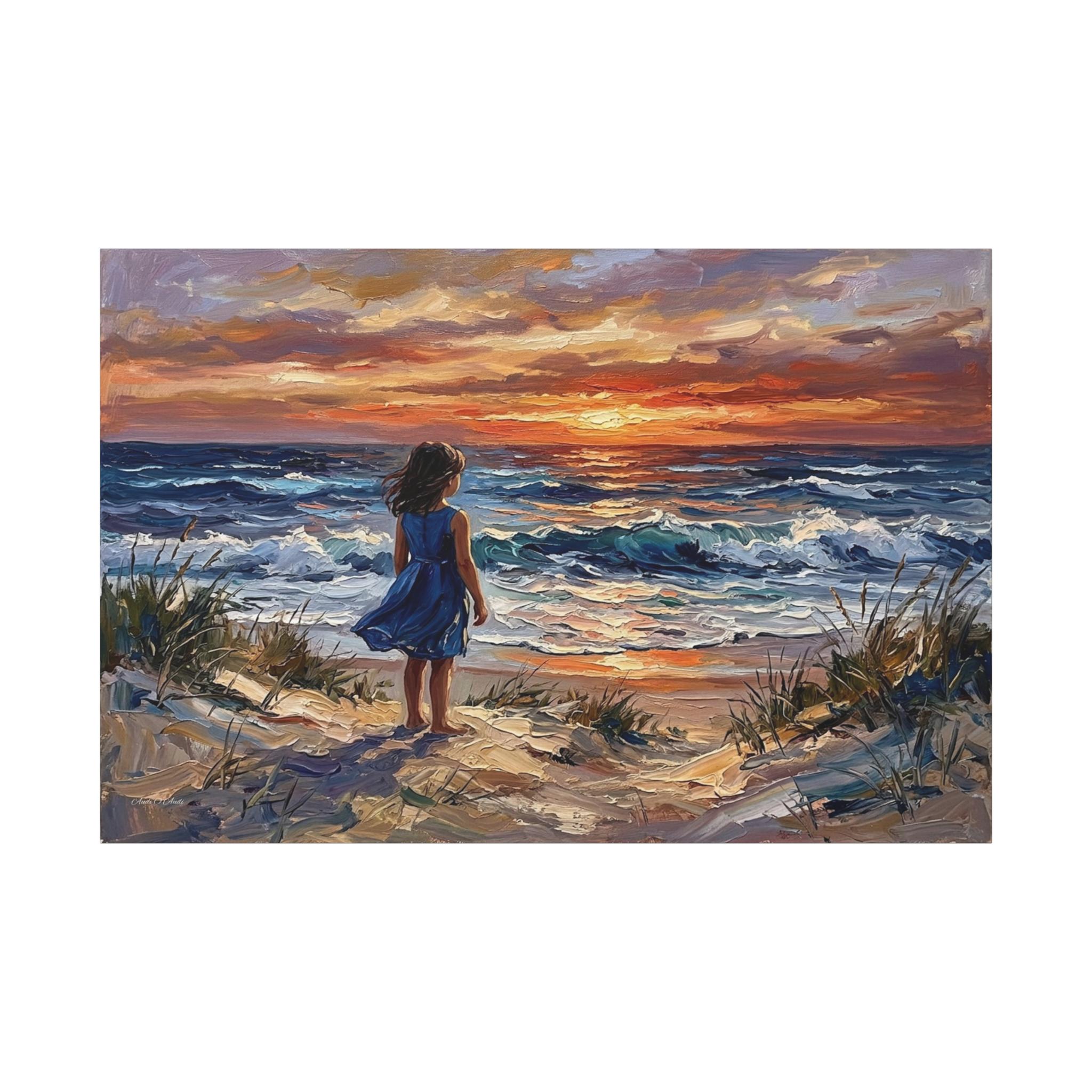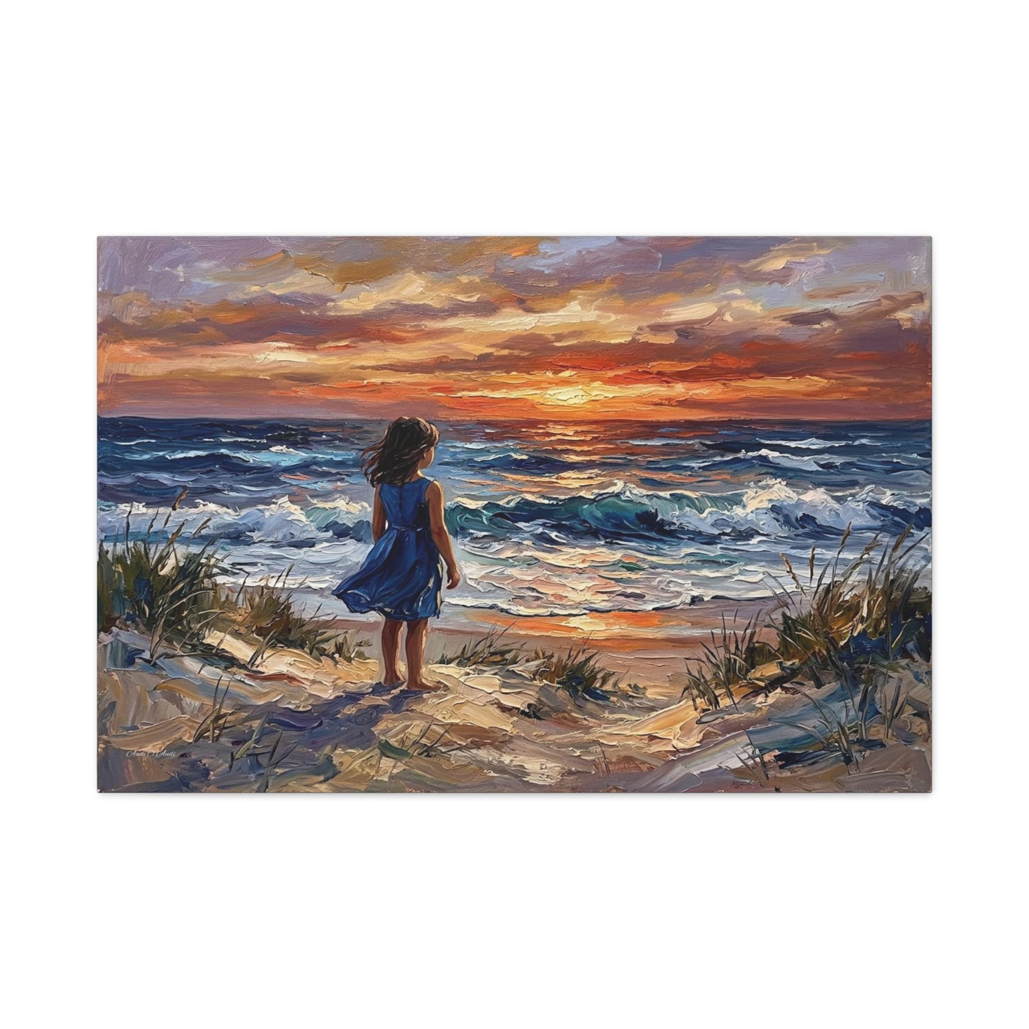 Bring the peaceful serenity, breathtaking colors, and nostalgic wonder of the seaside into your home with this stunning coastal sunset canvas print. This captivating horizontal artwork features a little girl in a vibrant blue dress standing barefoot among the sandy dunes and sea grass, gazing out at the rolling ocean waves under a fiery, luminous sunset.