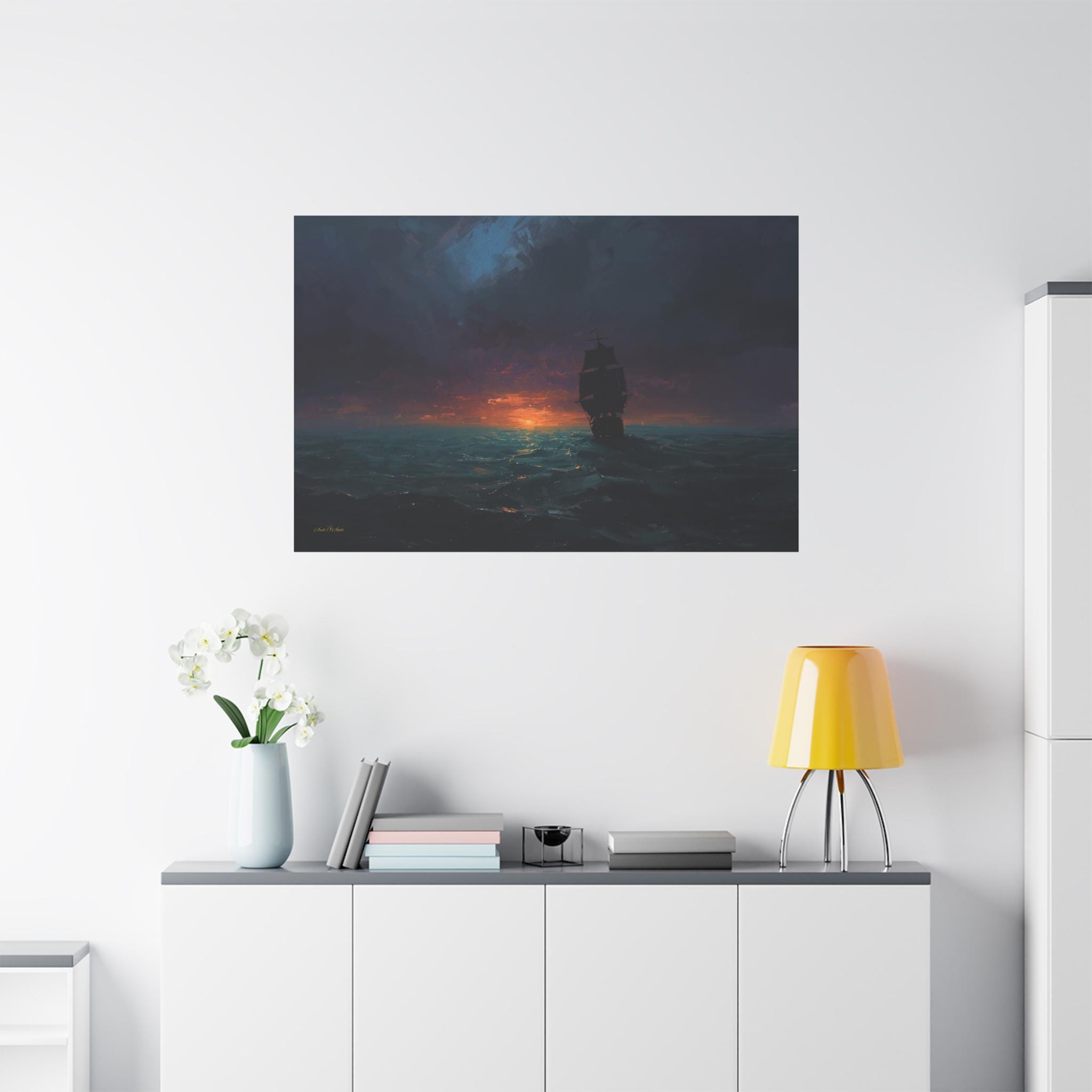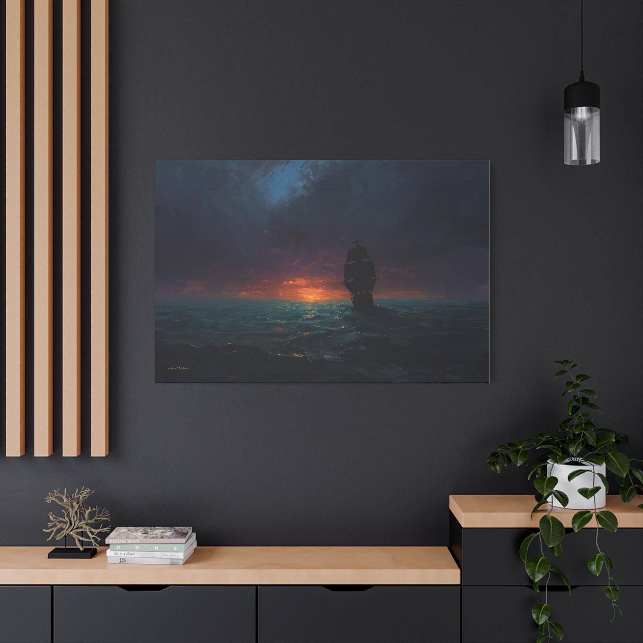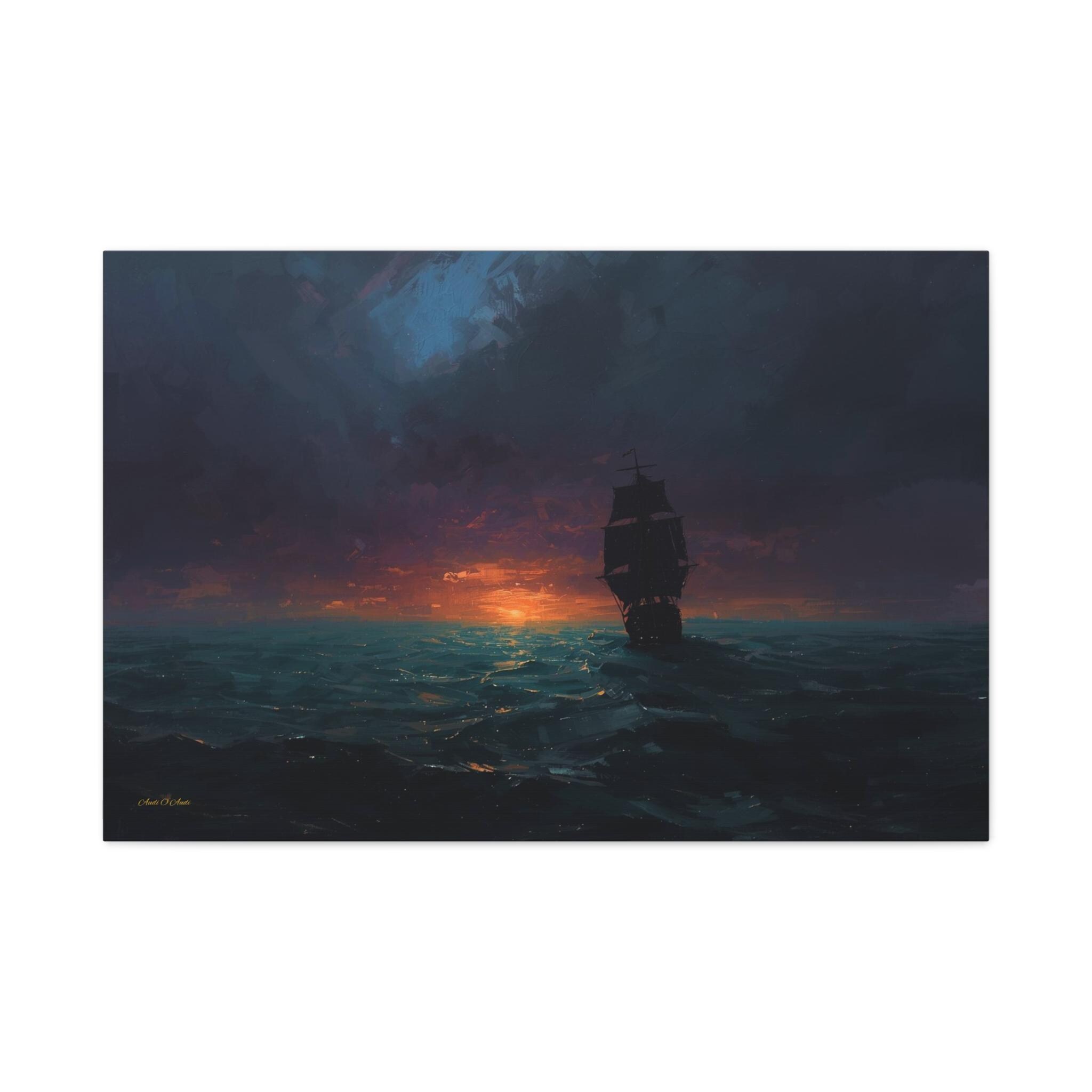 Bring the quiet power, cinematic mystery, and epic adventure of the open sea into your home with this stunning moody maritime canvas print. This captivating horizontal artwork features the striking, pitch-black silhouette of a classic sailing ship navigating through dark, rolling ocean waves. Above, a heavy, brooding sky of deep indigos and plums gives way to a brilliant, fiery sunset that casts a mesmerizing golden glow across the water.