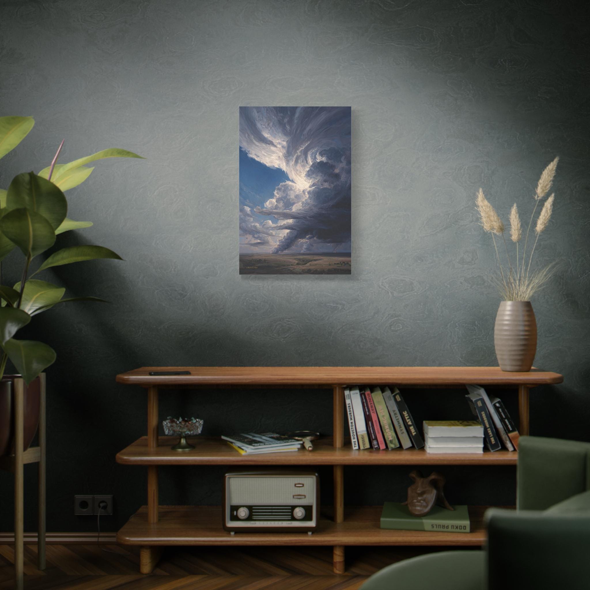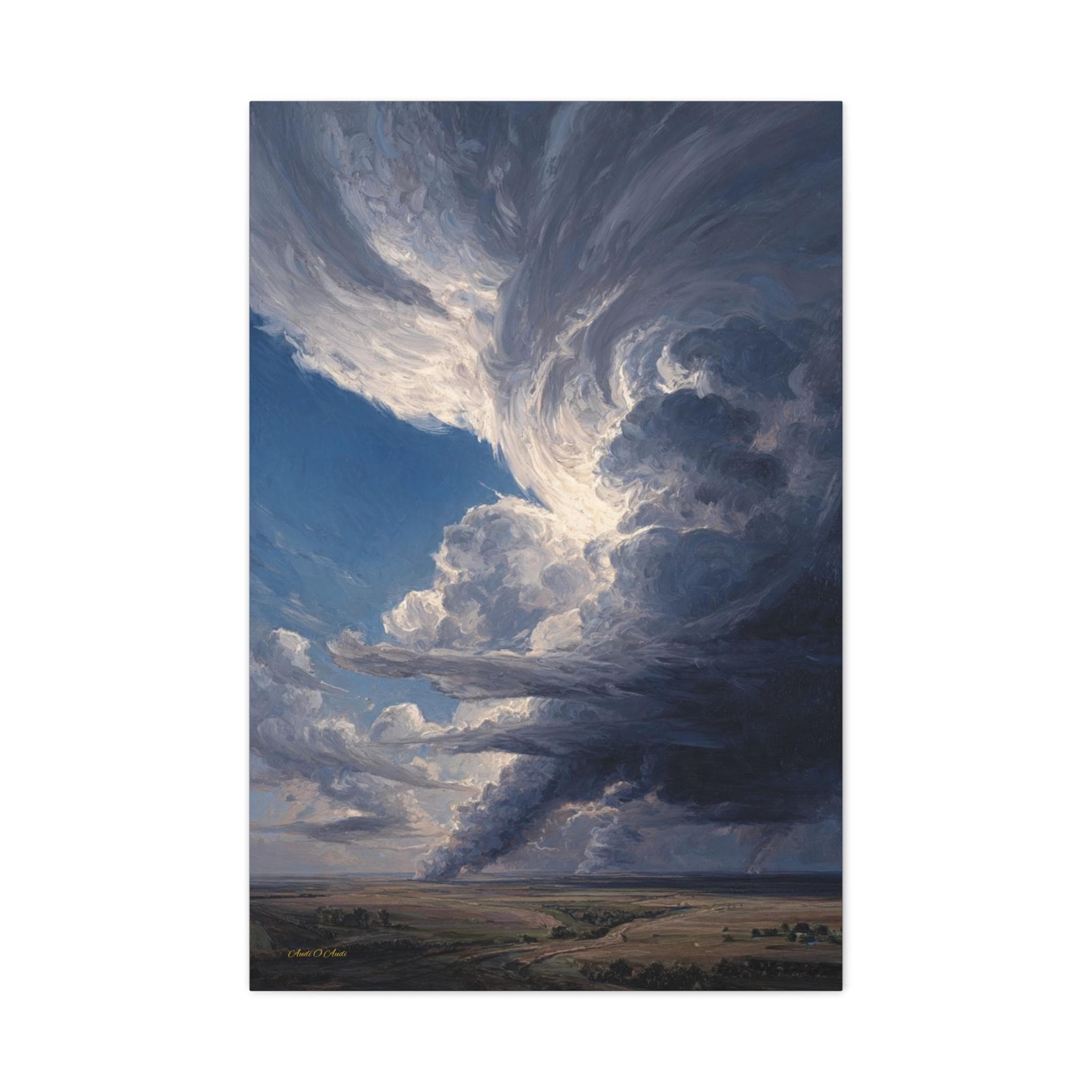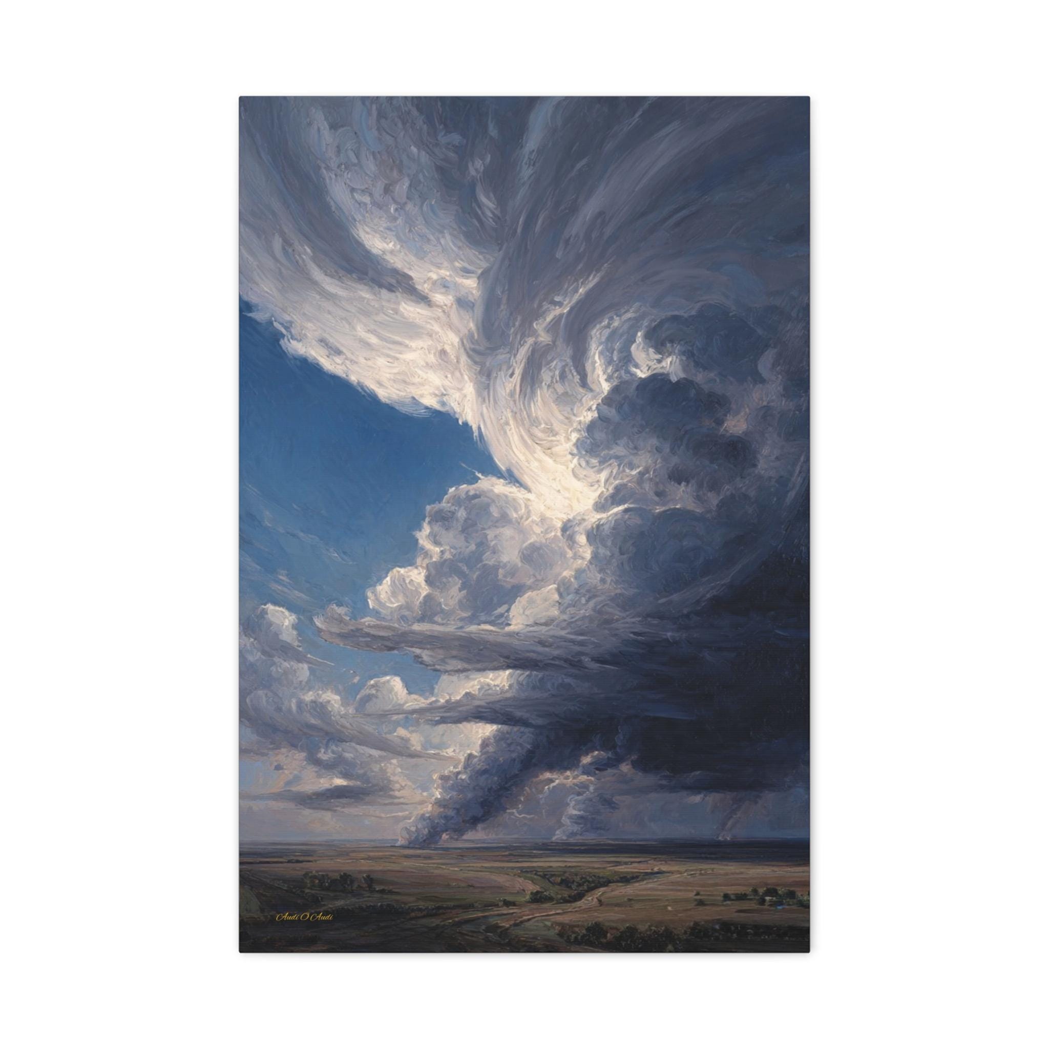 Bring the awe-inspiring majesty, untamed power, and cinematic drama of the open sky into your home with this stunning dramatic storm canvas print. This captivating vertical artwork features a massive, towering supercell storm cloud swirling above a vast, peaceful rural landscape. The intense contrast between the bright, sunlit peaks of the clouds and the dark, brooding rainbands below creates a breathtaking sense of elemental energy and movement.