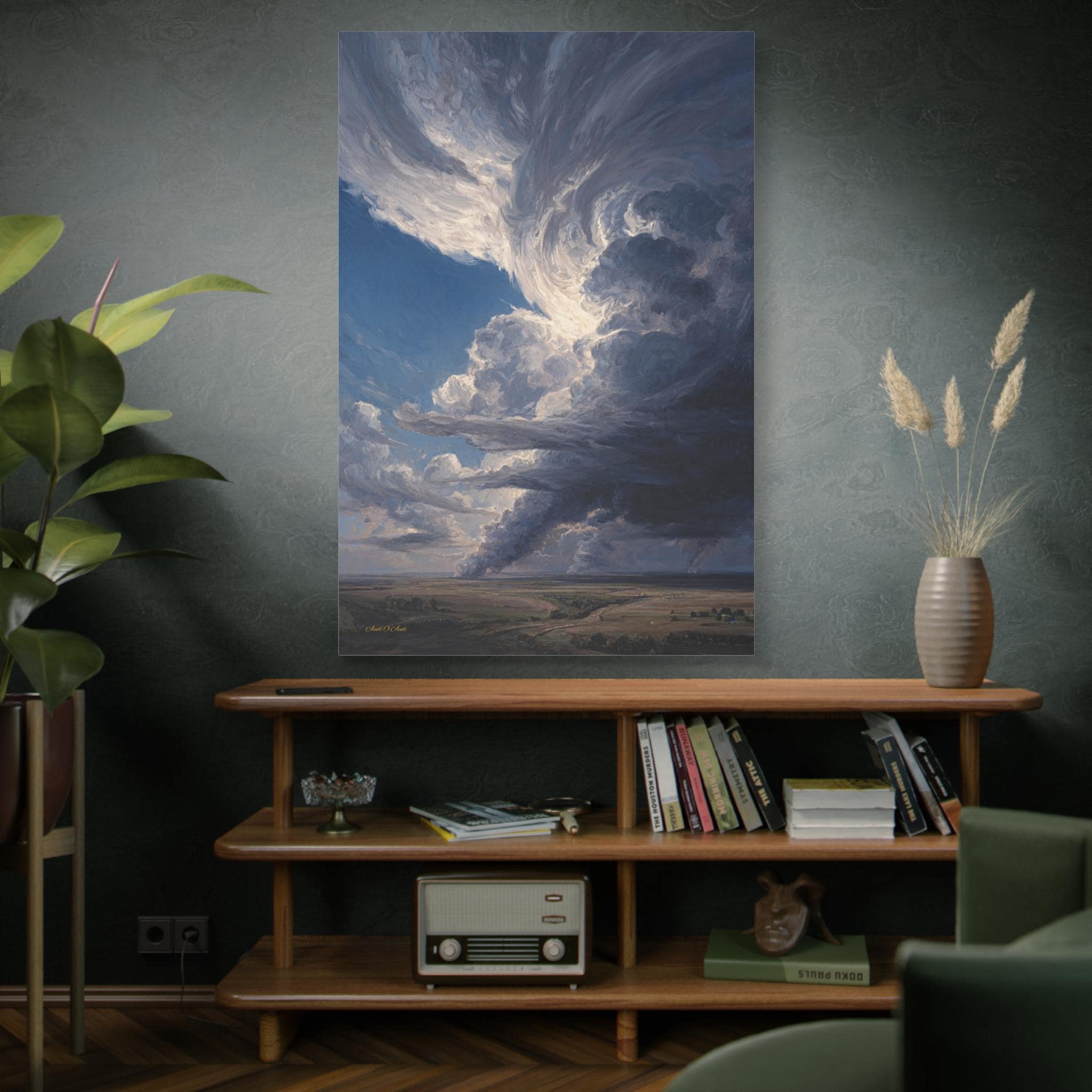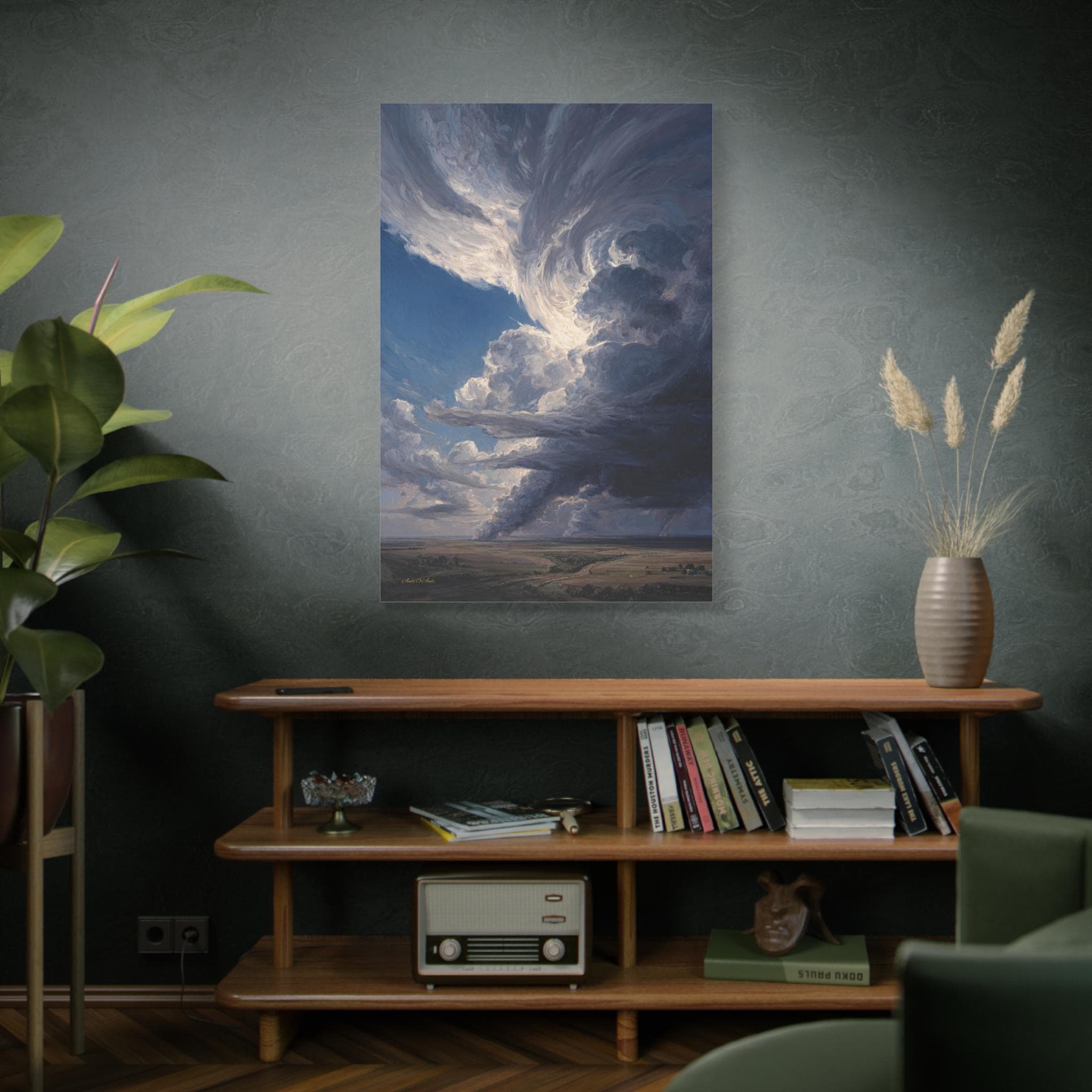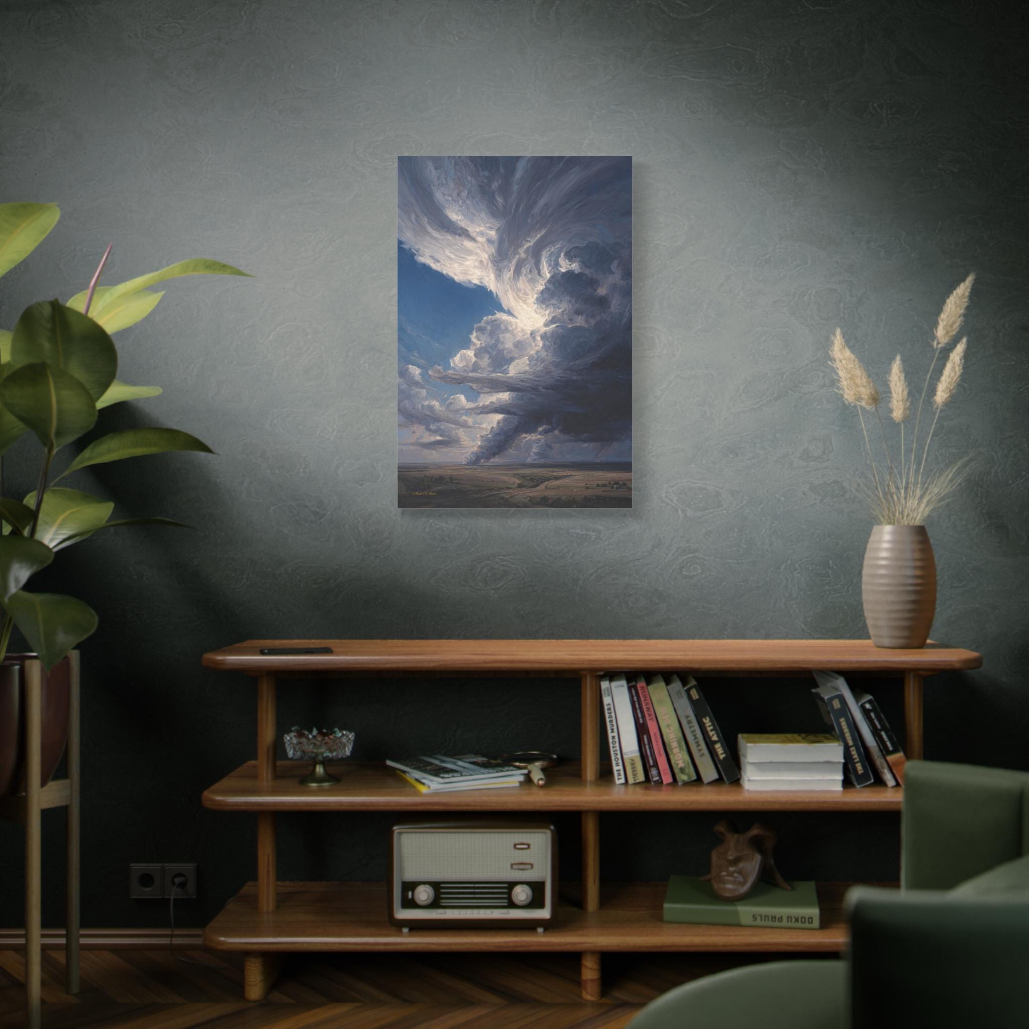 Bring the awe-inspiring majesty, untamed power, and cinematic drama of the open sky into your home with this stunning dramatic storm canvas print. This captivating vertical artwork features a massive, towering supercell storm cloud swirling above a vast, peaceful rural landscape. The intense contrast between the bright, sunlit peaks of the clouds and the dark, brooding rainbands below creates a breathtaking sense of elemental energy and movement.