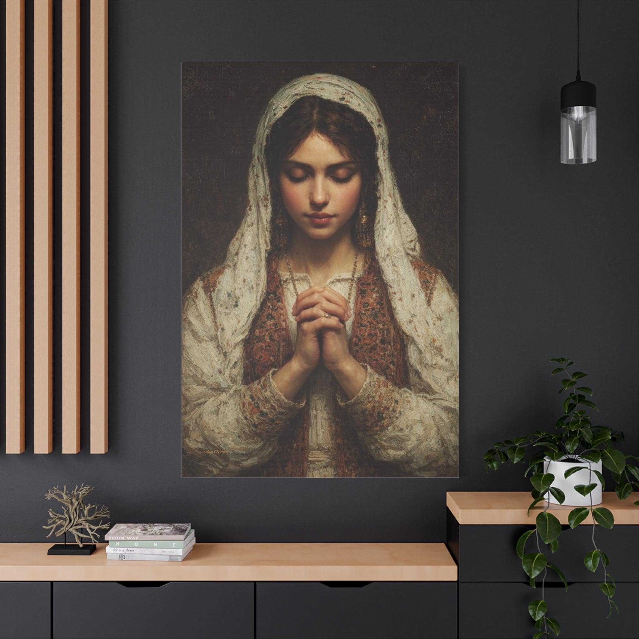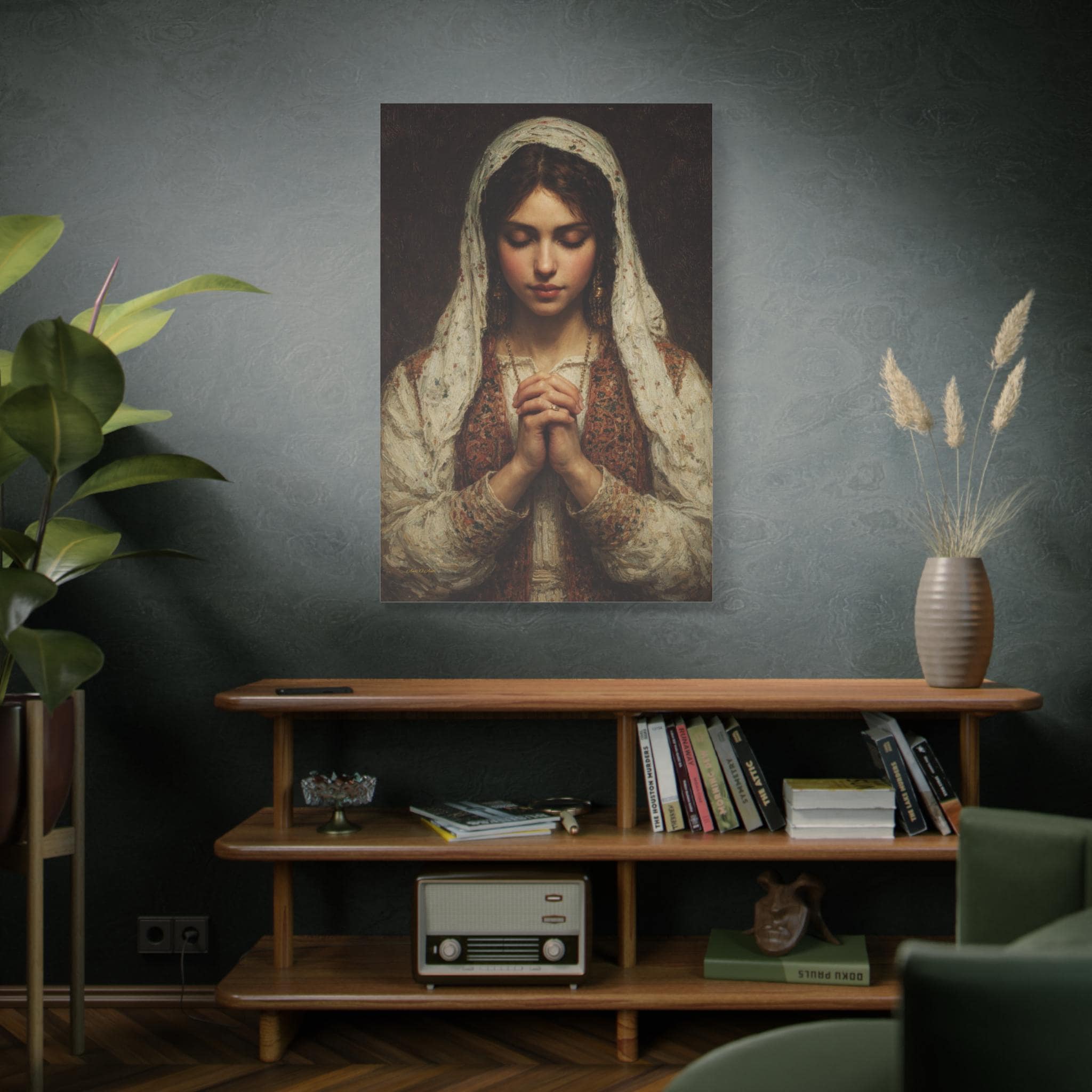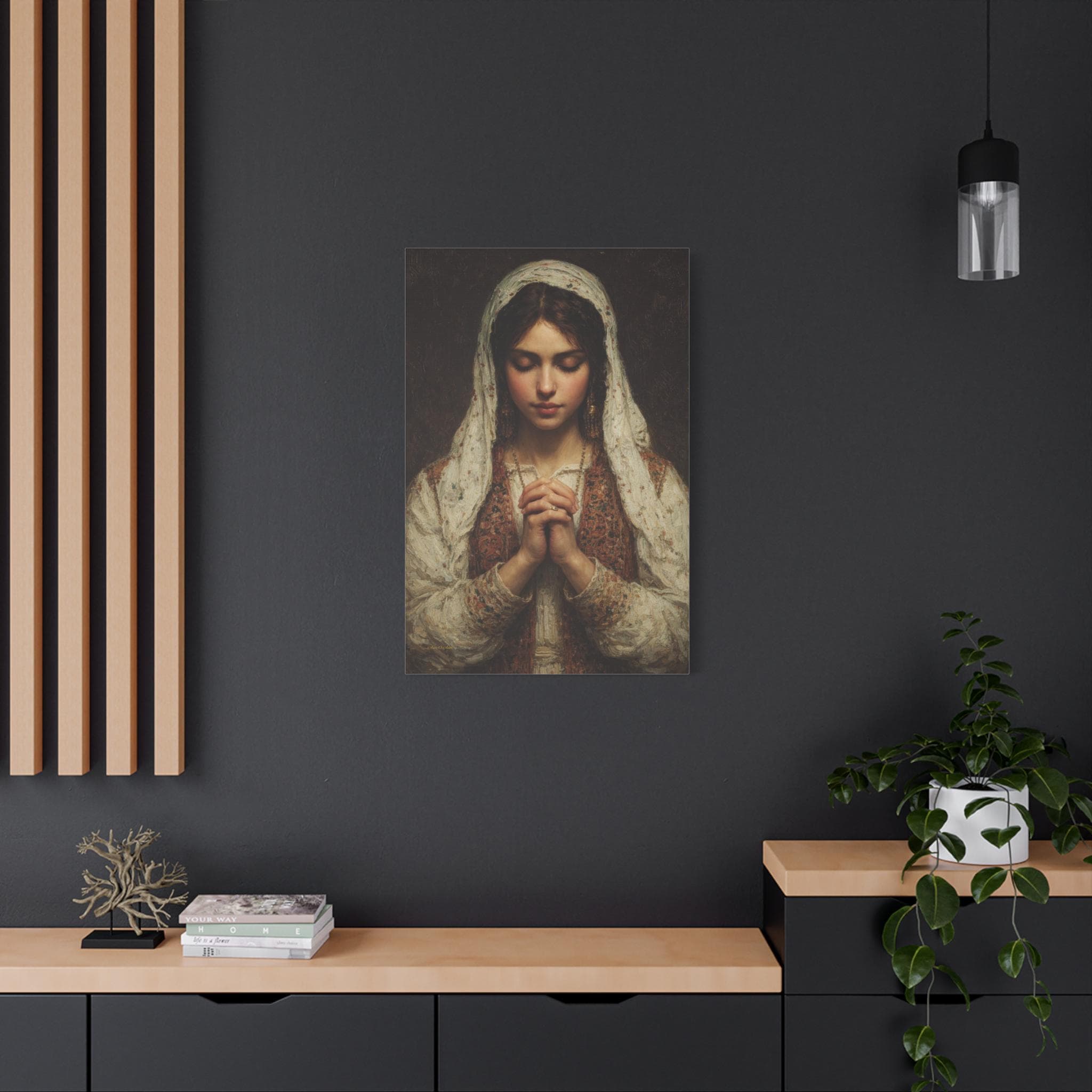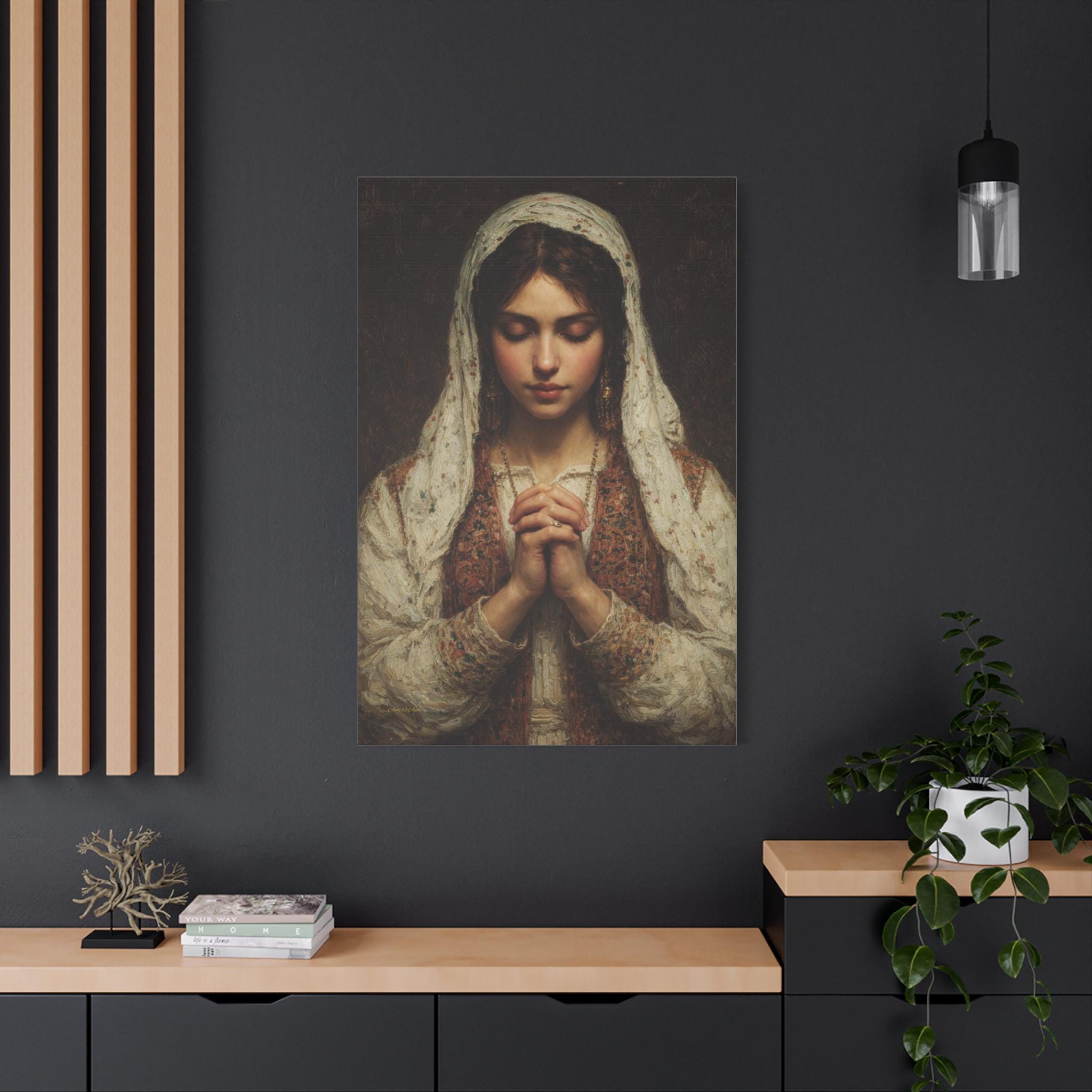 Bring profound peace, quiet reverence, and the breathtaking beauty of classical fine art into your home with this stunning spiritual portrait canvas print. This captivating vertical artwork features a beautiful young woman with her eyes closed and hands gently clasped in deep prayer. She wears a delicately draped, highly textured lace veil and a richly patterned traditional vest, set against a moody, earthy background that perfectly highlights her serene expression.