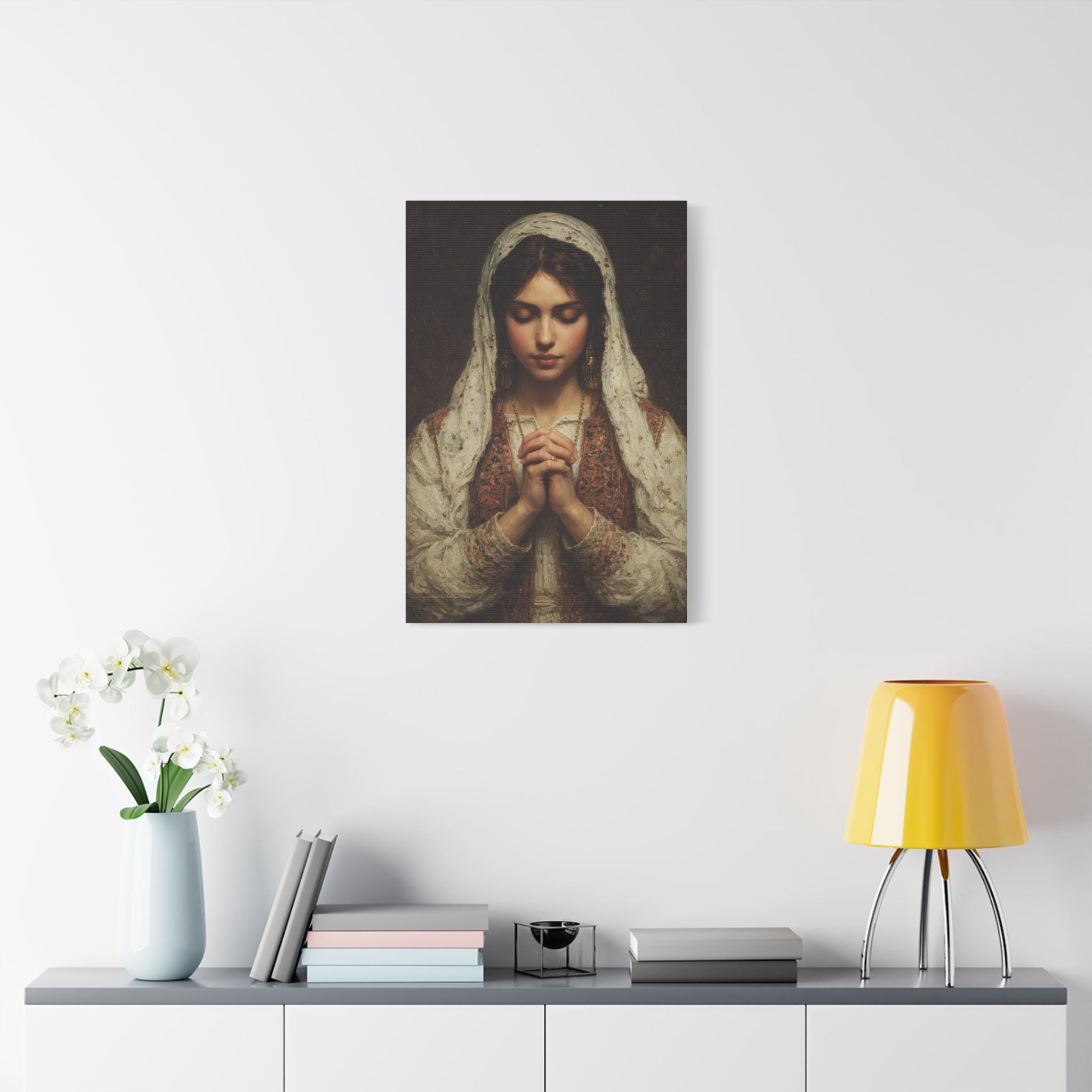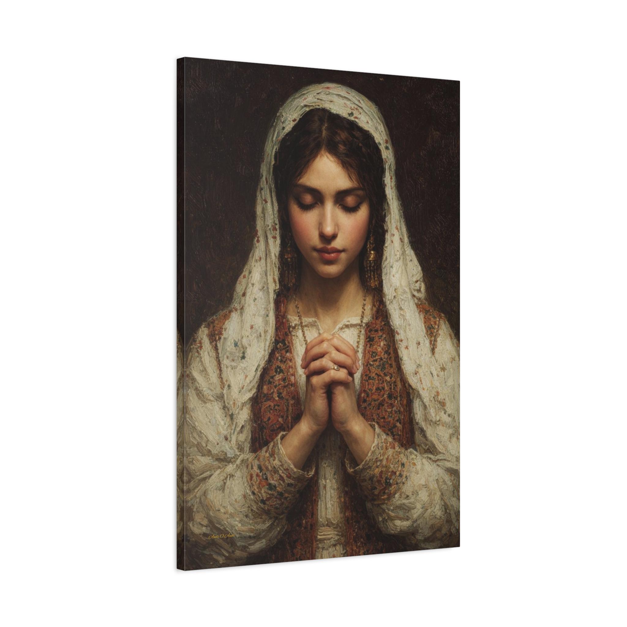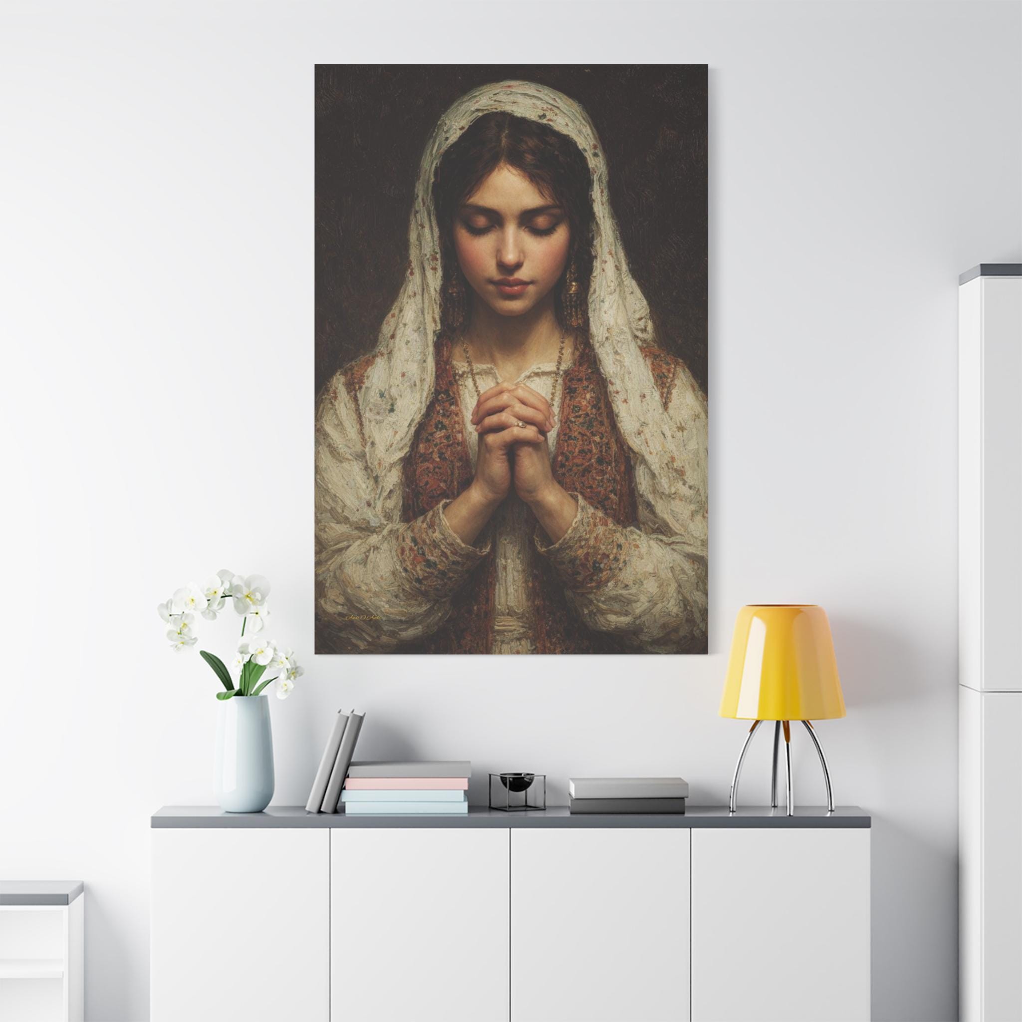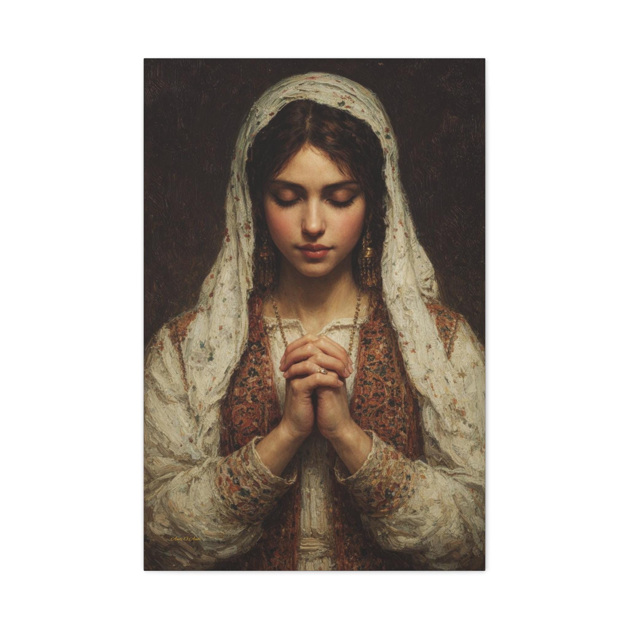 Bring profound peace, quiet reverence, and the breathtaking beauty of classical fine art into your home with this stunning spiritual portrait canvas print. This captivating vertical artwork features a beautiful young woman with her eyes closed and hands gently clasped in deep prayer. She wears a delicately draped, highly textured lace veil and a richly patterned traditional vest, set against a moody, earthy background that perfectly highlights her serene expression.