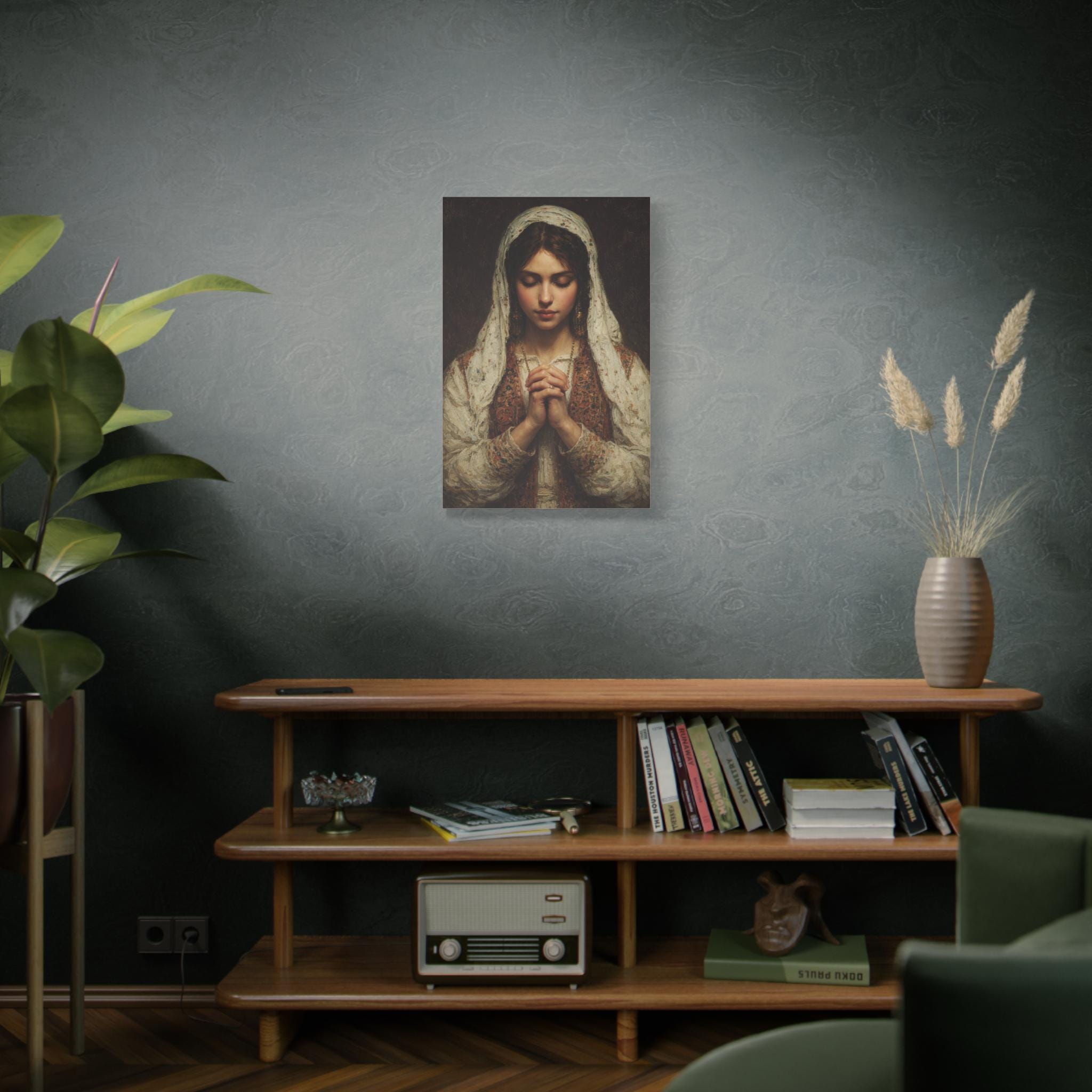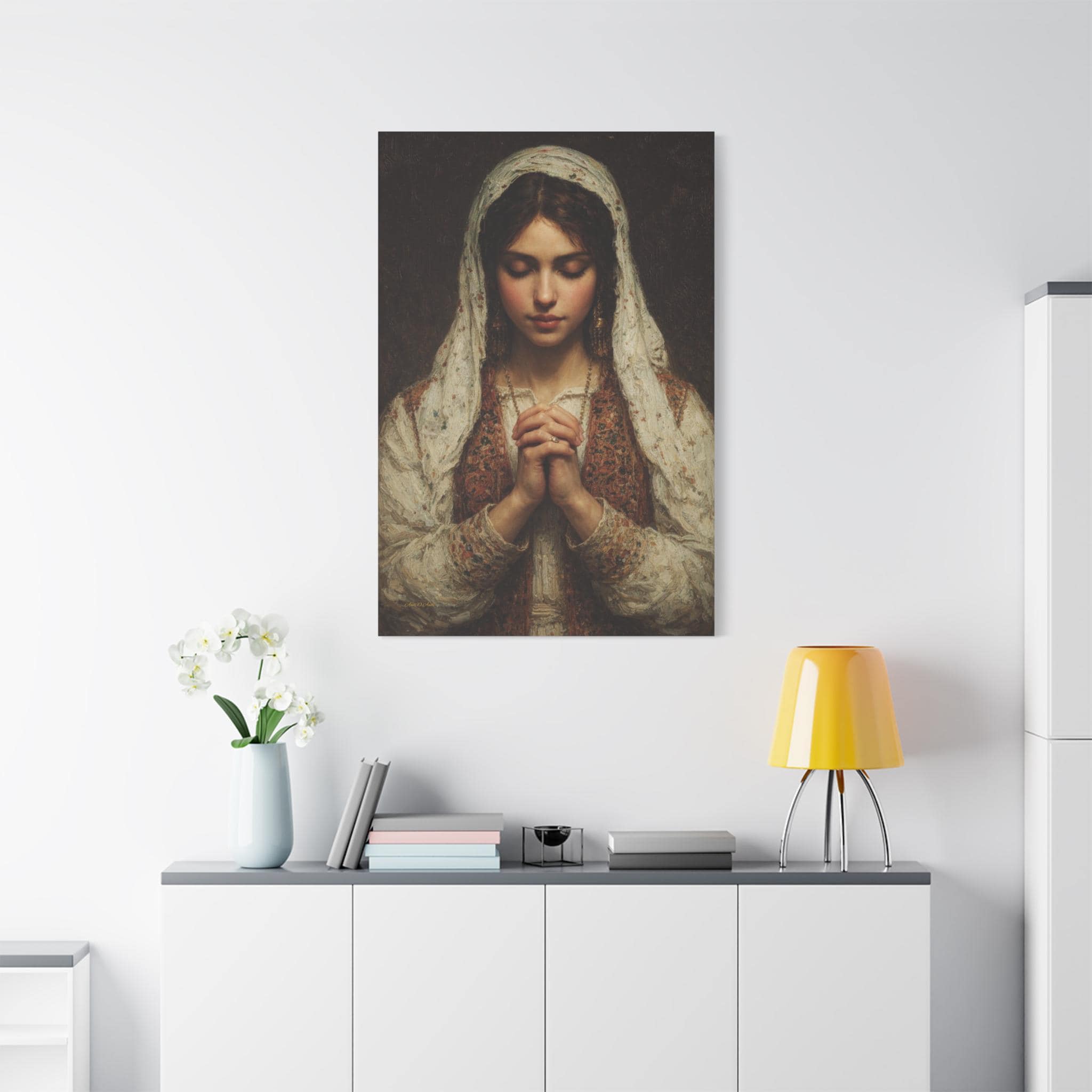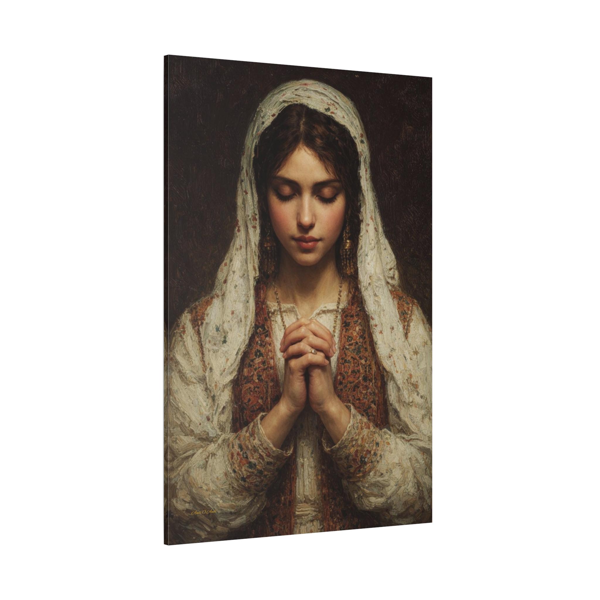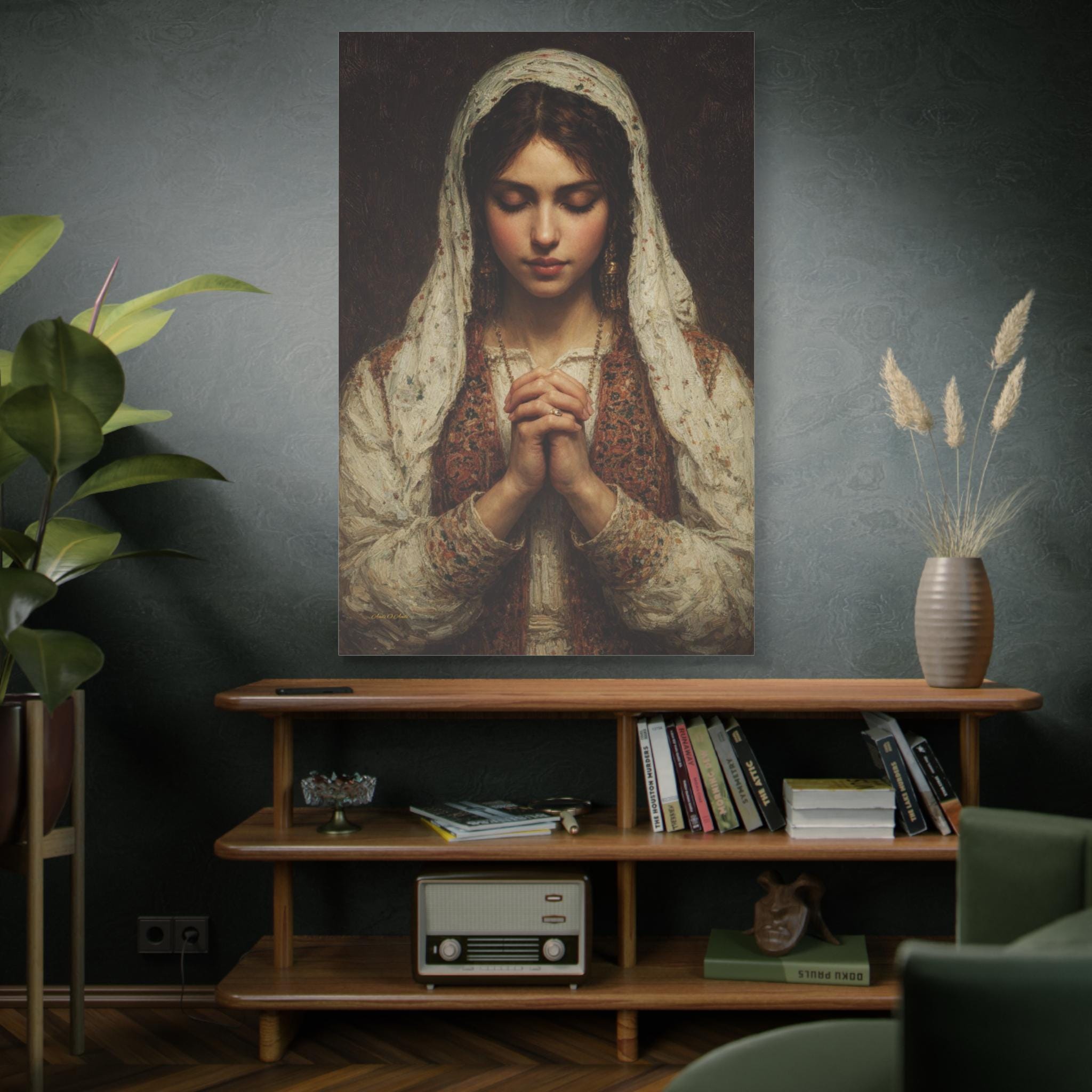 Bring profound peace, quiet reverence, and the breathtaking beauty of classical fine art into your home with this stunning spiritual portrait canvas print. This captivating vertical artwork features a beautiful young woman with her eyes closed and hands gently clasped in deep prayer. She wears a delicately draped, highly textured lace veil and a richly patterned traditional vest, set against a moody, earthy background that perfectly highlights her serene expression.