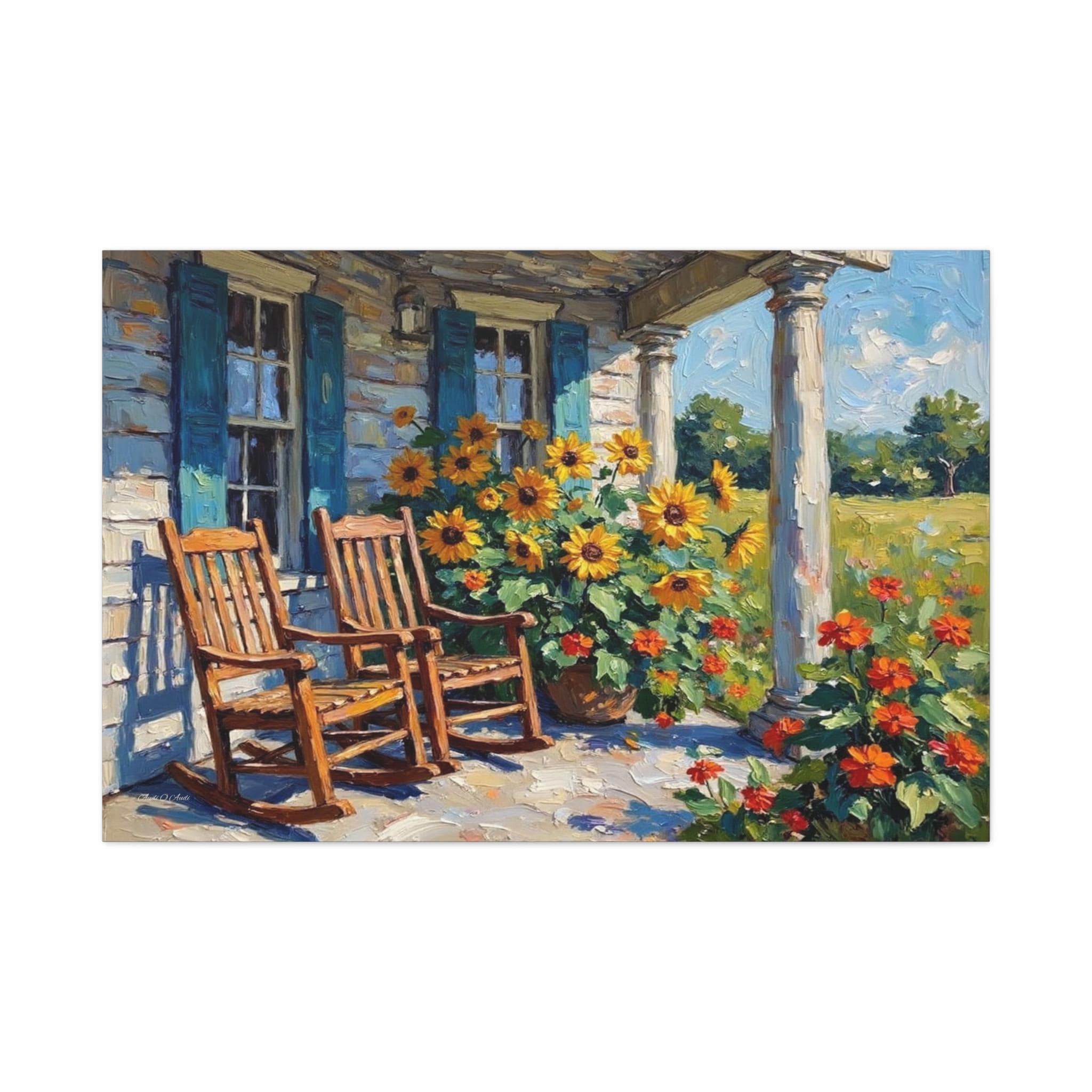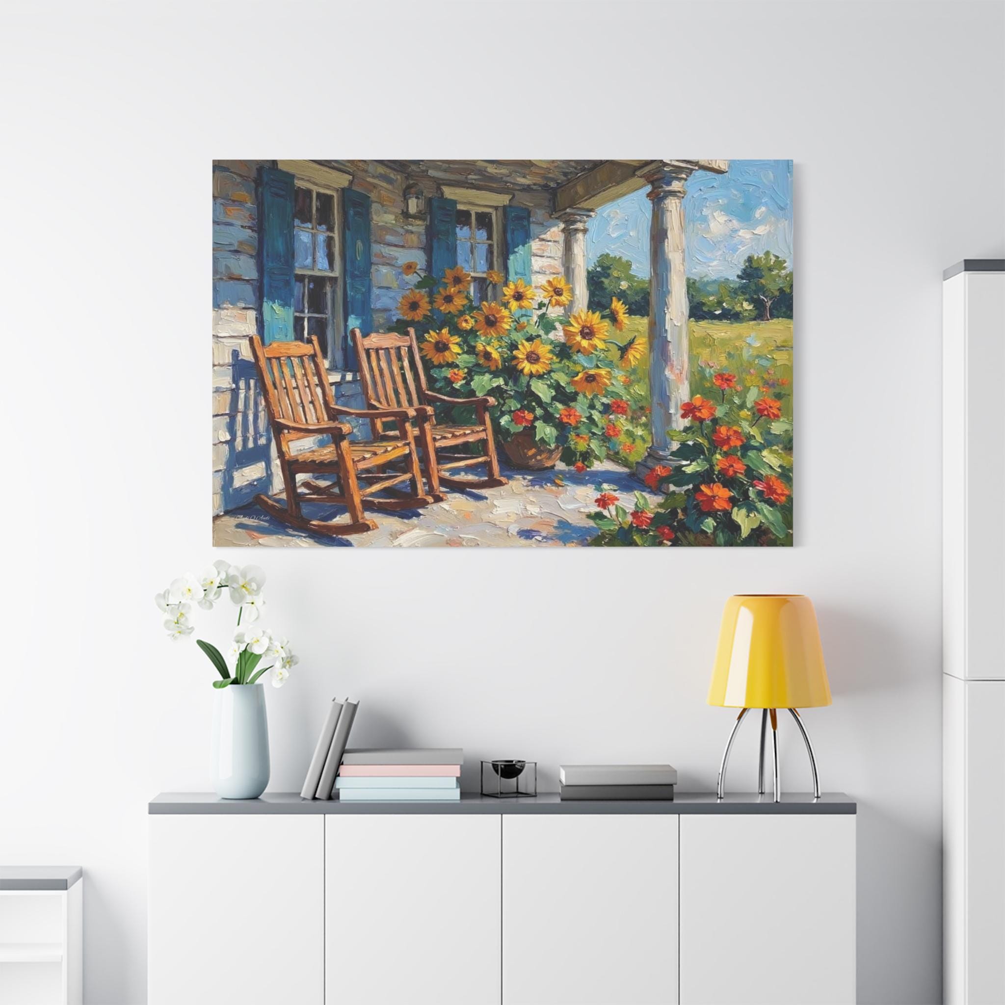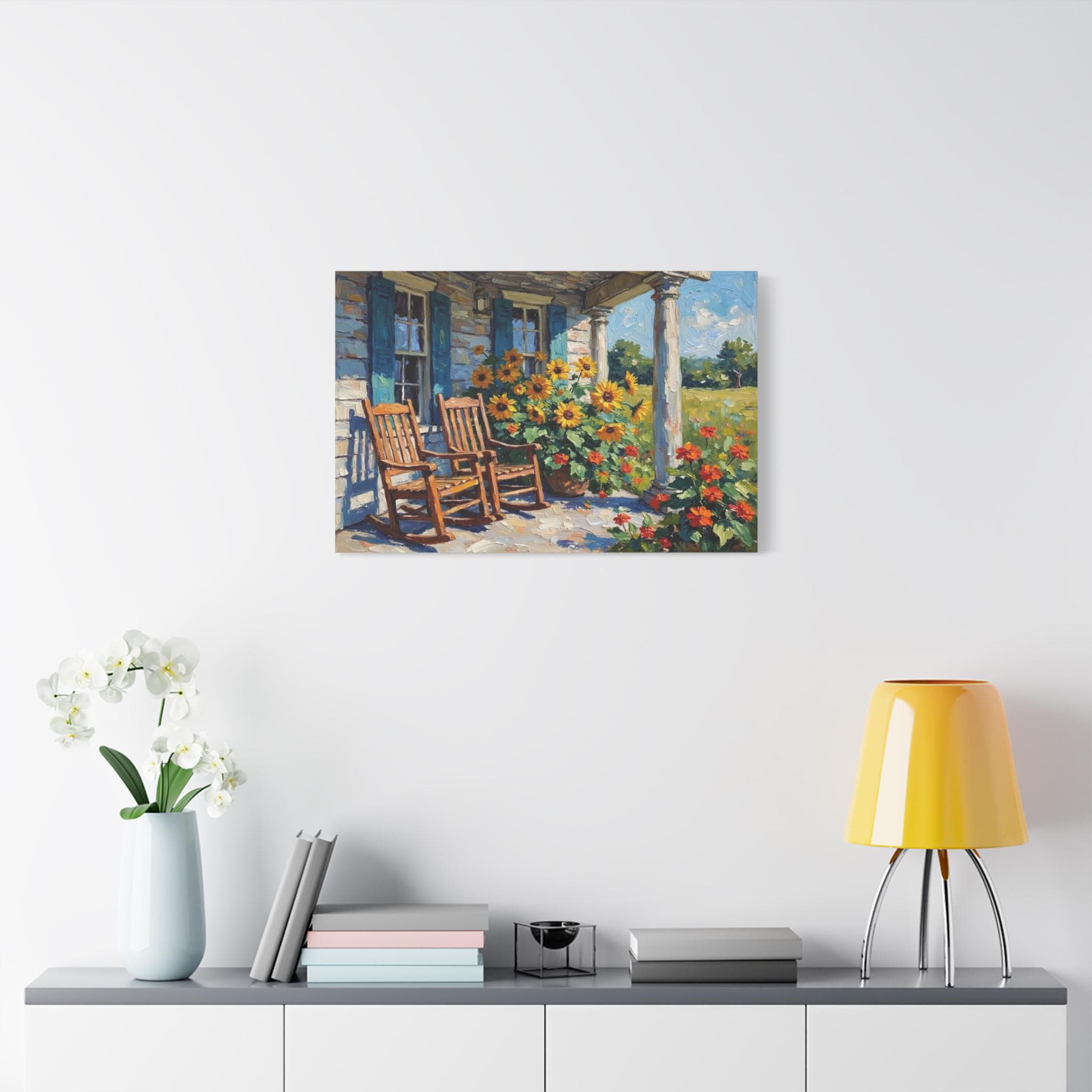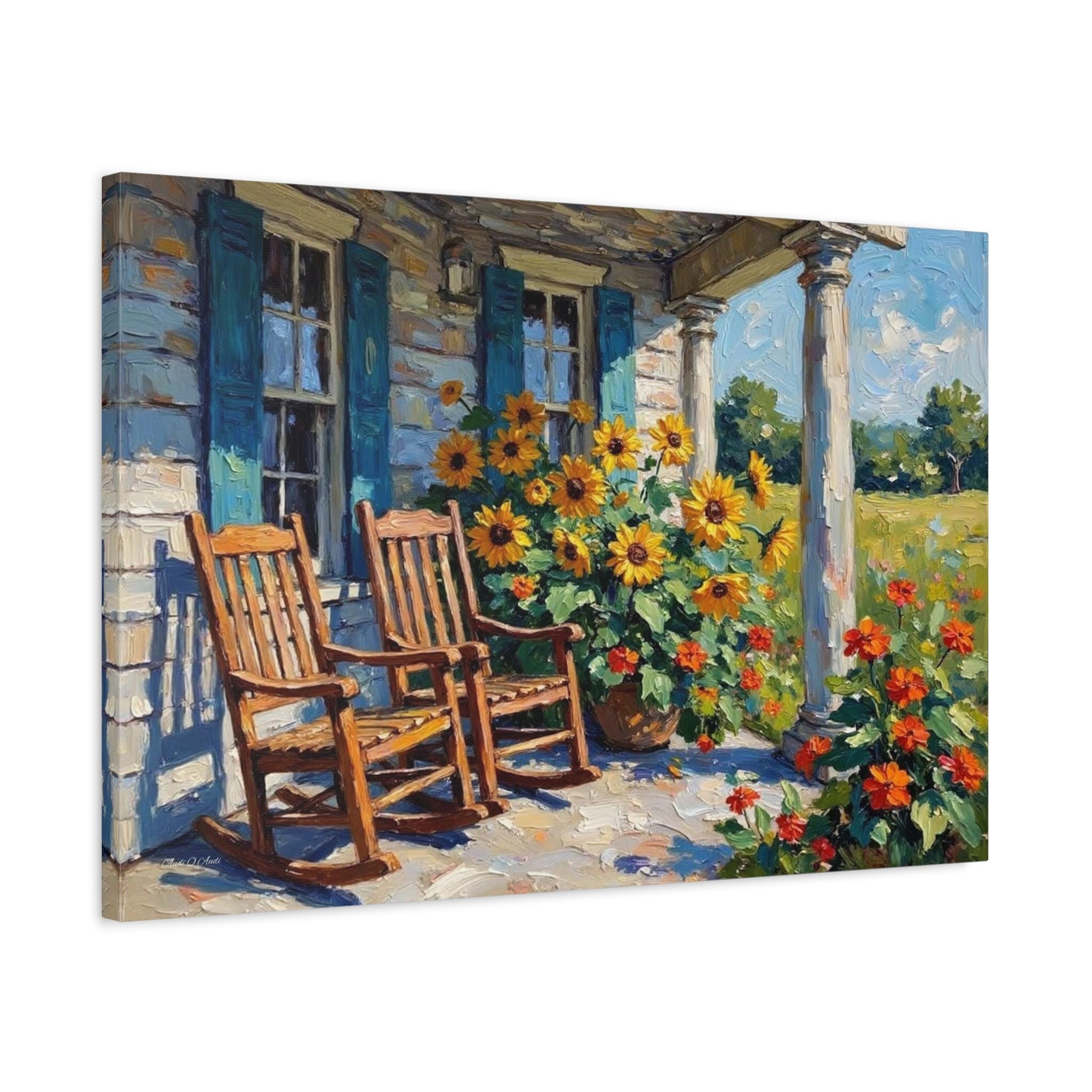 Bring the warm hospitality, bright colors, and peaceful nostalgia of country living into your home with this stunning farmhouse porch canvas print. This captivating horizontal artwork features a classic rustic porch scene complete with two inviting wooden rocking chairs, weathered blue window shutters, and towering white columns. The space is brought to life by a magnificent, sun-drenched display of bright yellow sunflowers and vibrant orange blooms set against a lush green meadow.
