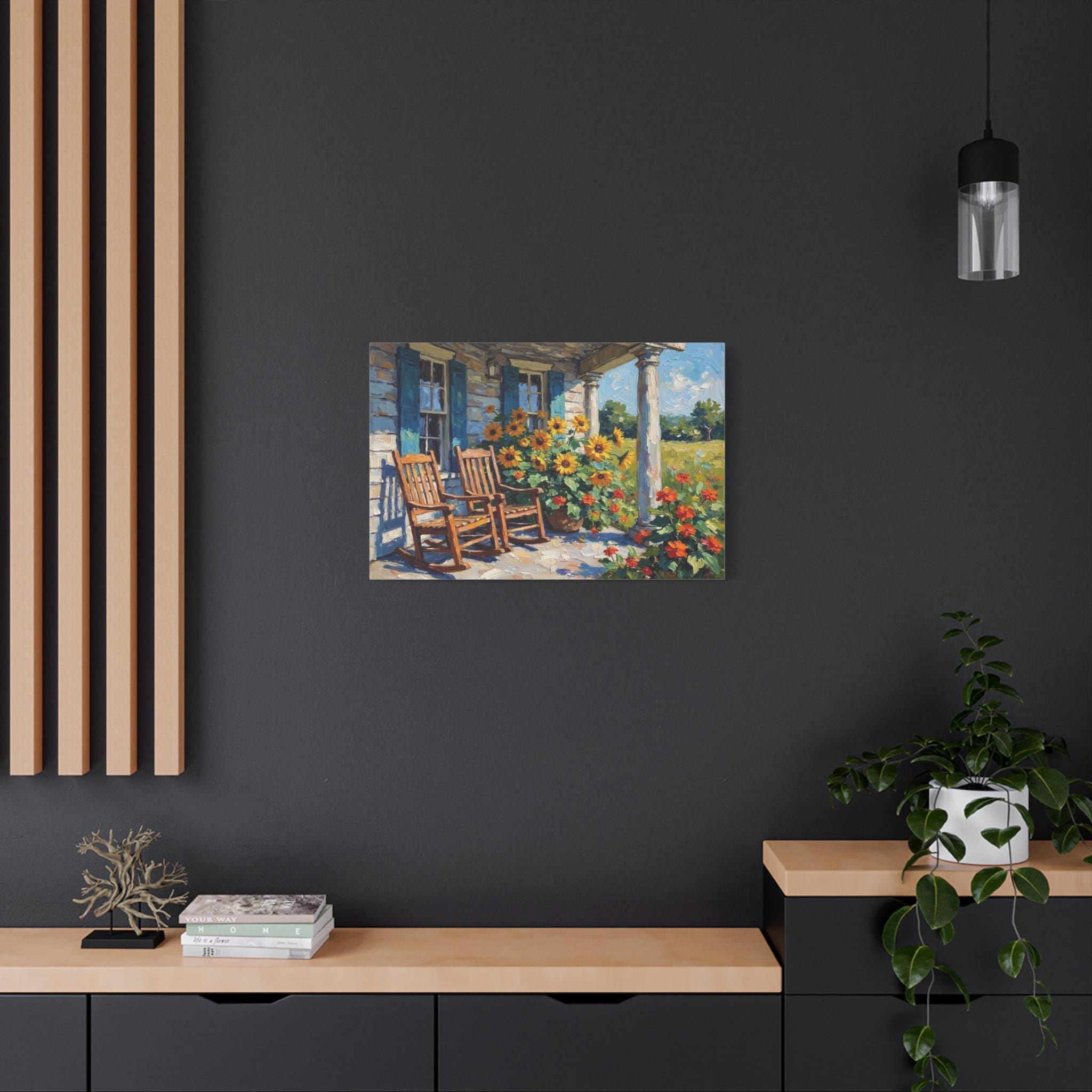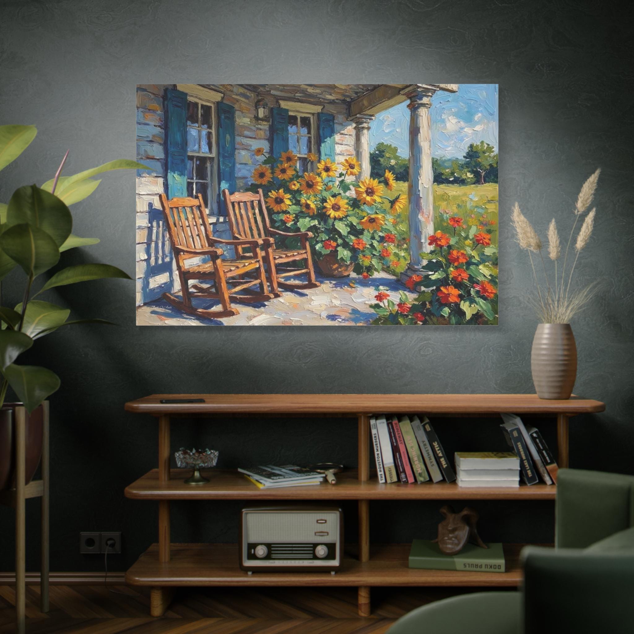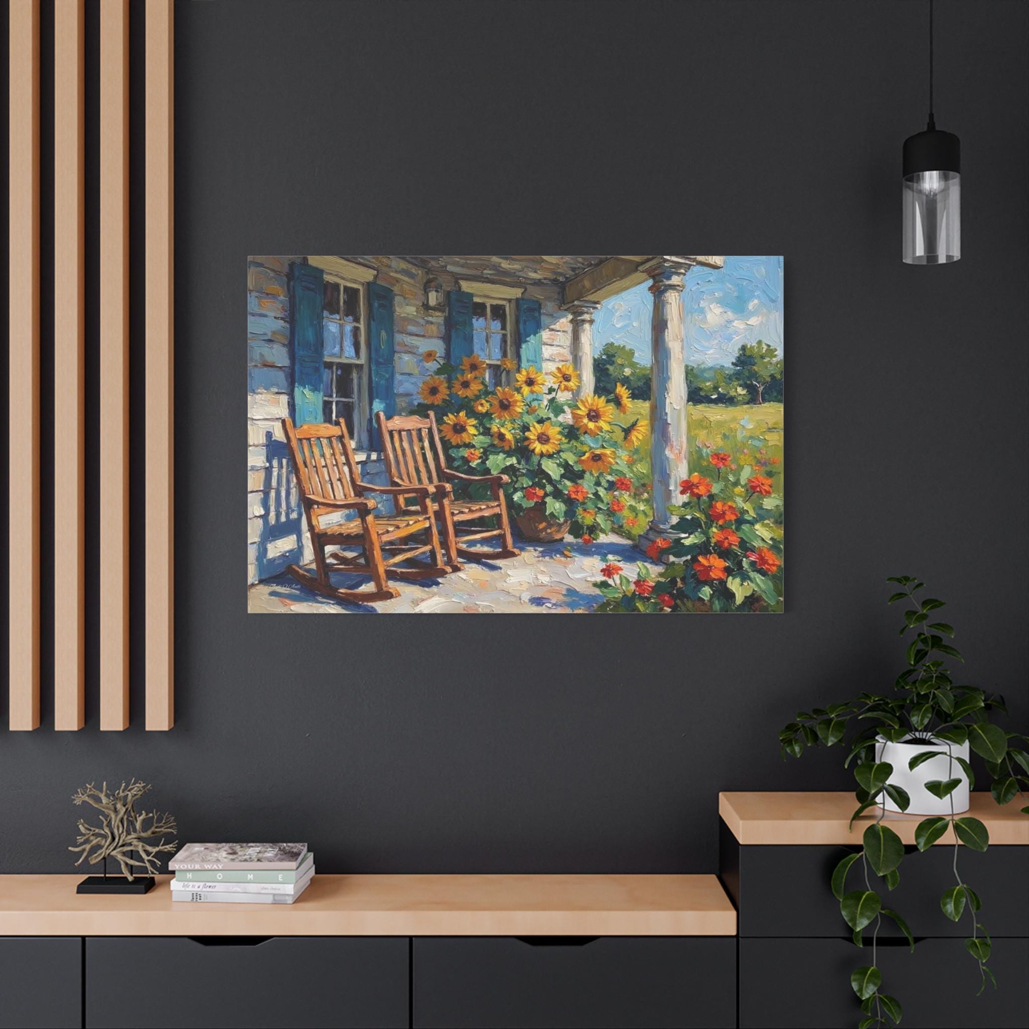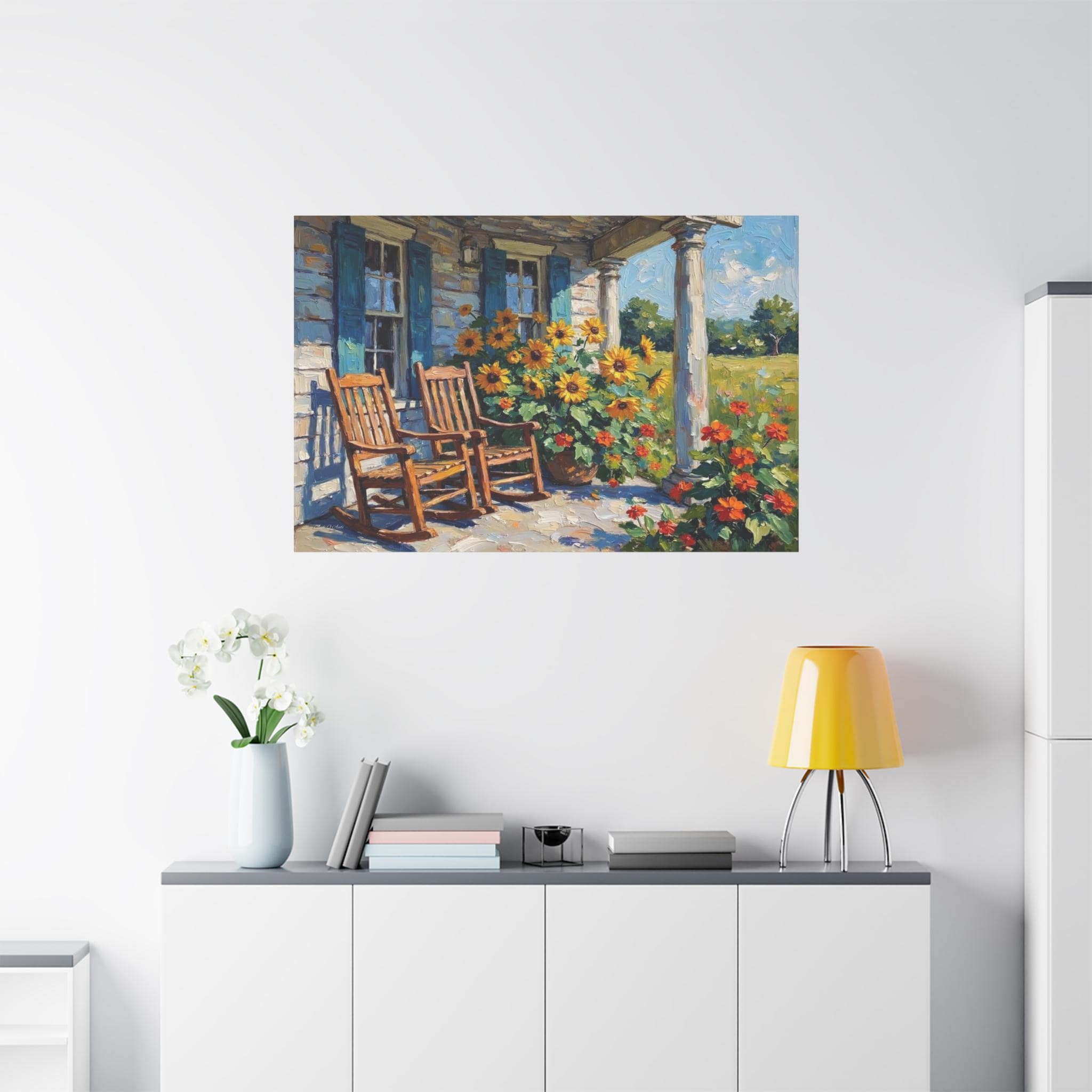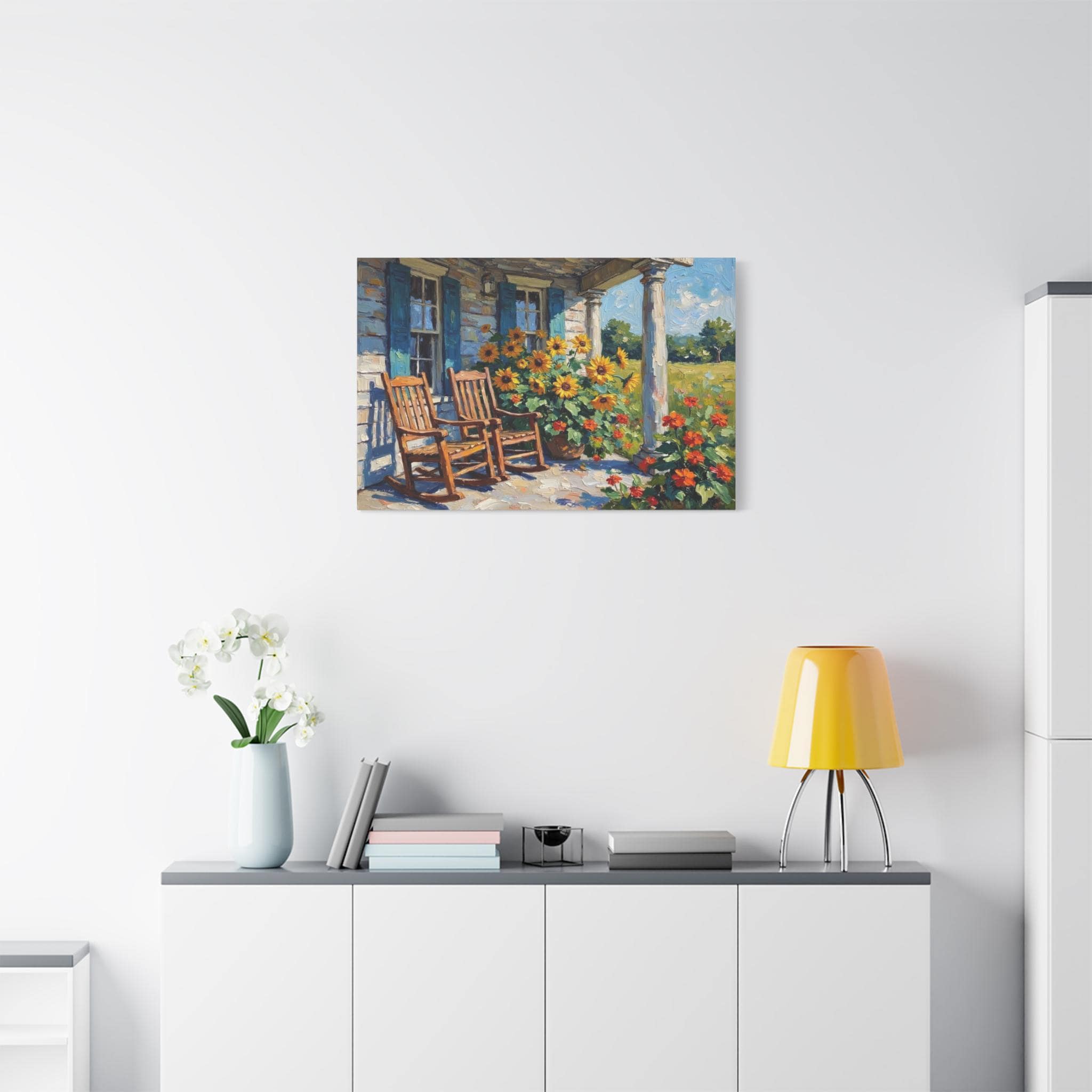 Bring the warm hospitality, bright colors, and peaceful nostalgia of country living into your home with this stunning farmhouse porch canvas print. This captivating horizontal artwork features a classic rustic porch scene complete with two inviting wooden rocking chairs, weathered blue window shutters, and towering white columns. The space is brought to life by a magnificent, sun-drenched display of bright yellow sunflowers and vibrant orange blooms set against a lush green meadow.