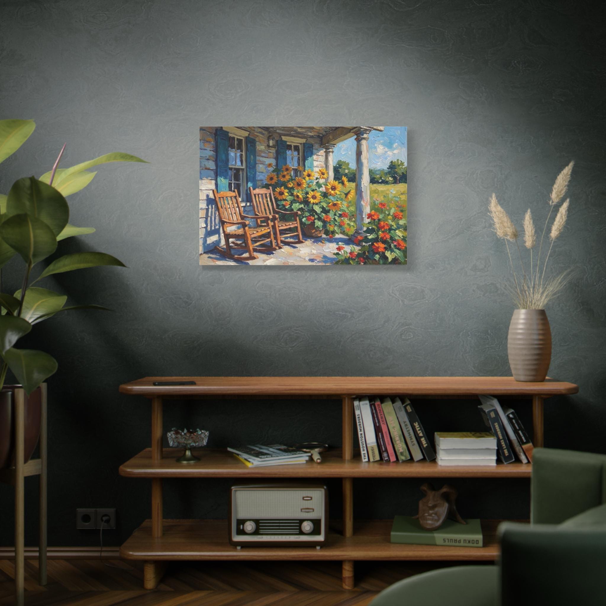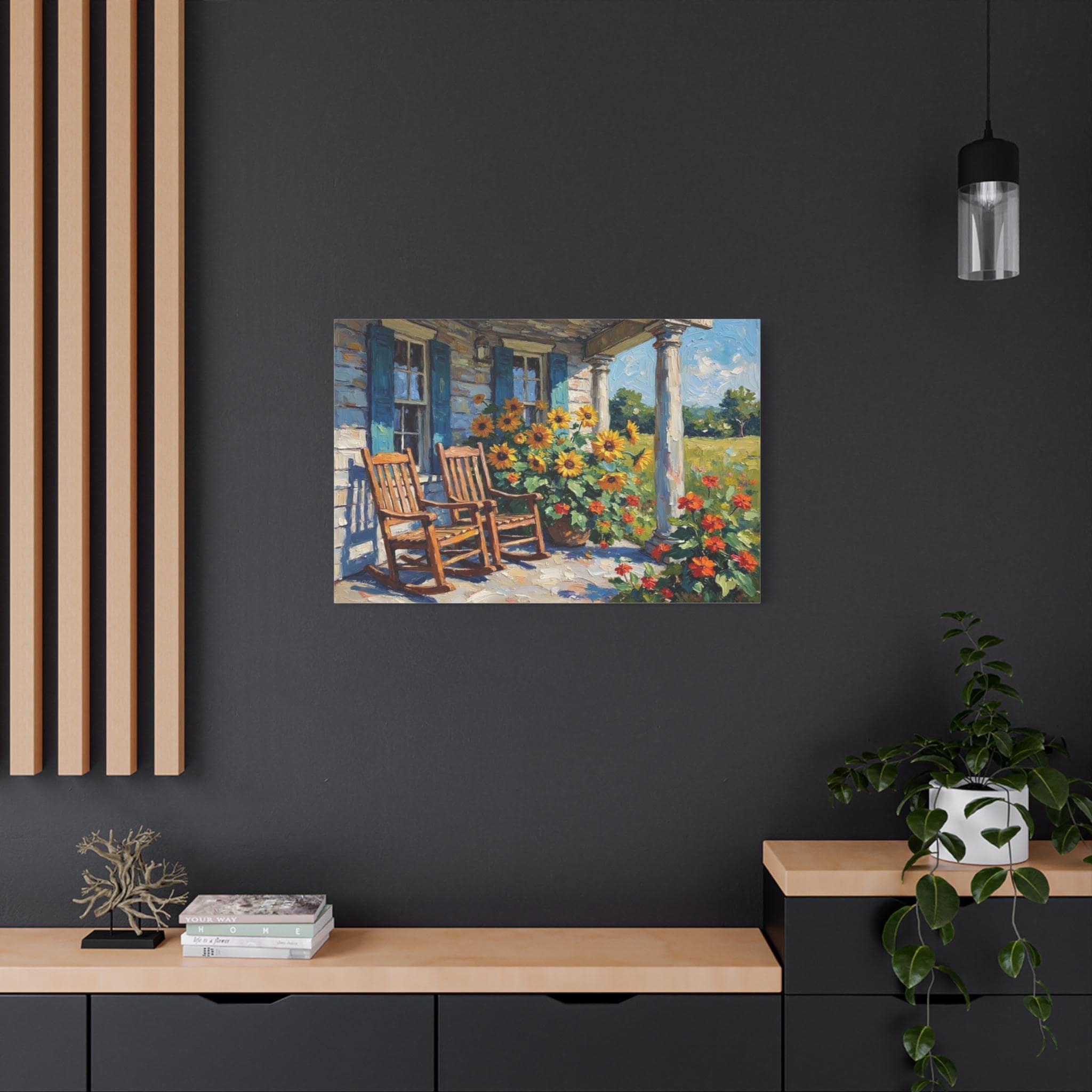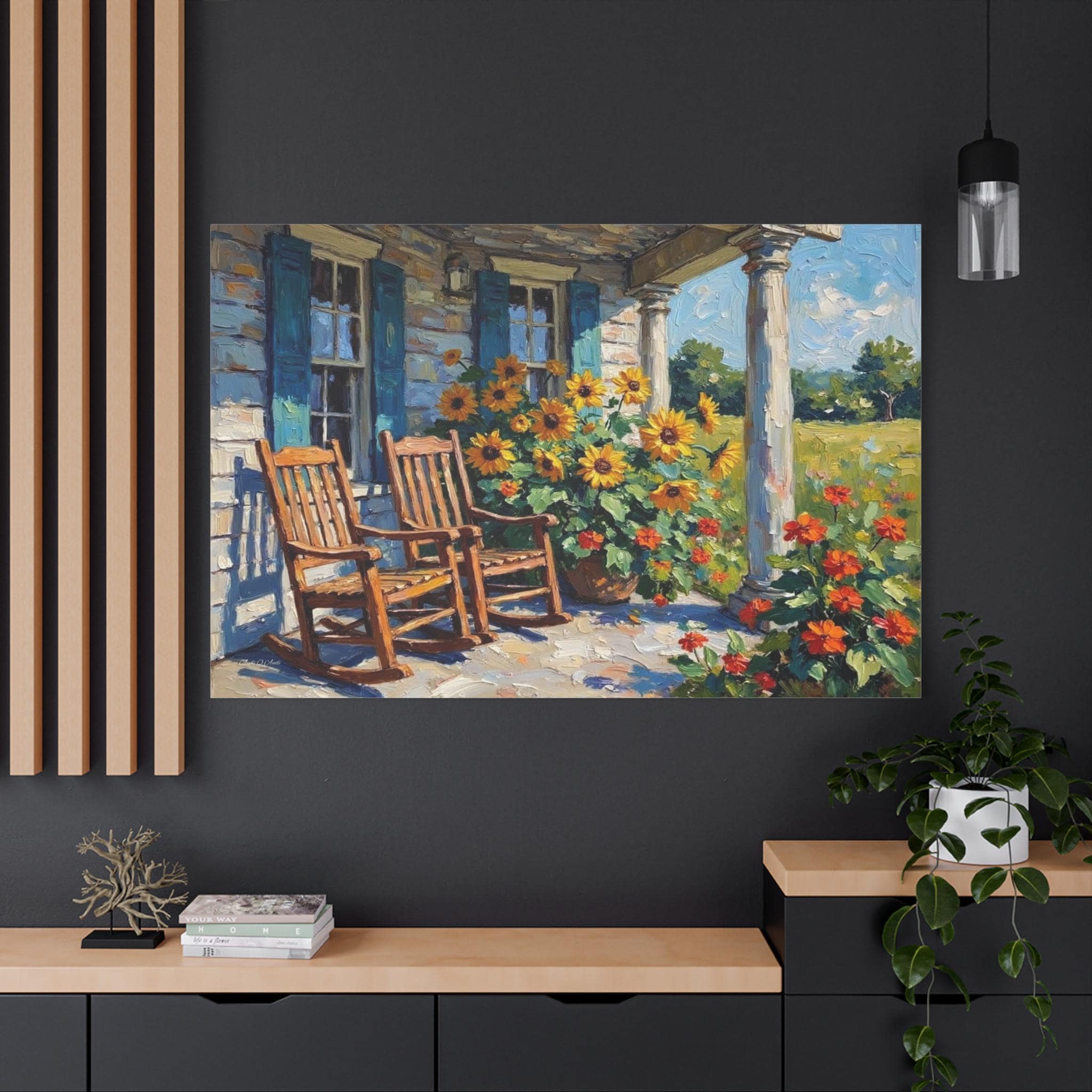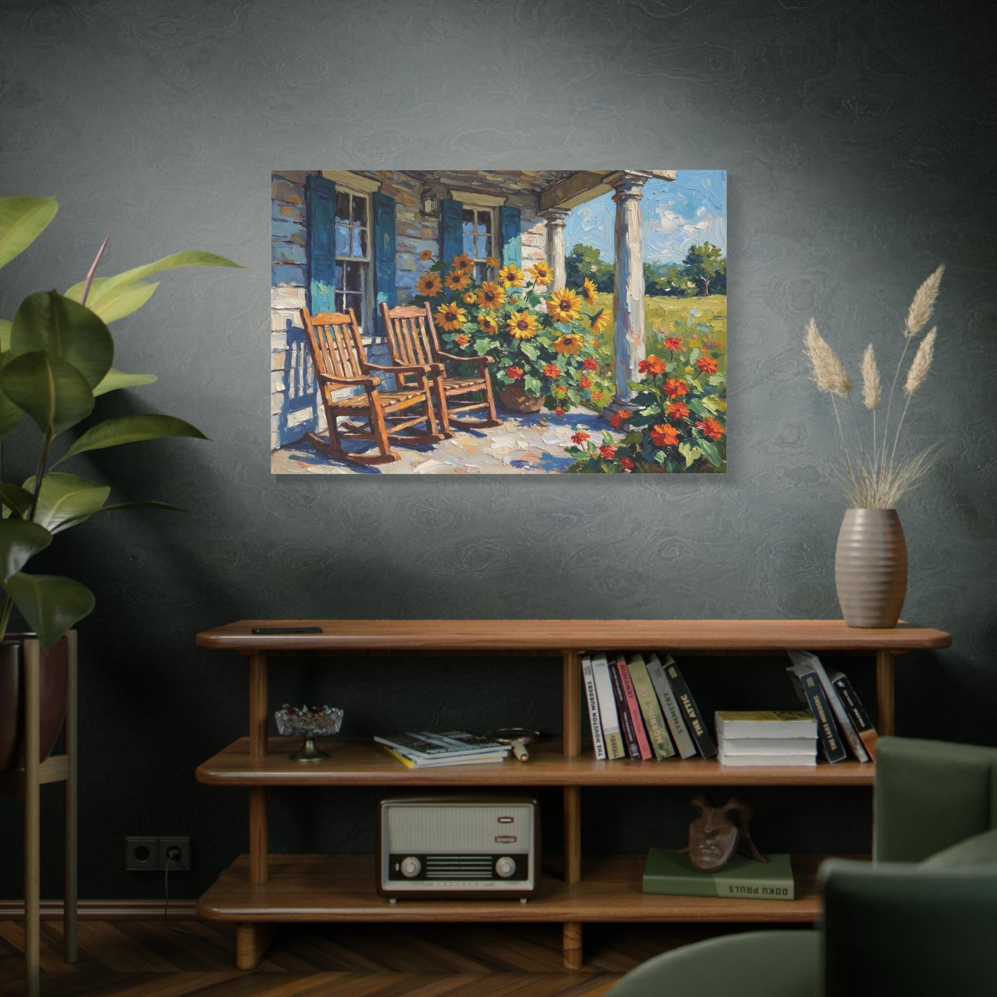 Bring the warm hospitality, bright colors, and peaceful nostalgia of country living into your home with this stunning farmhouse porch canvas print. This captivating horizontal artwork features a classic rustic porch scene complete with two inviting wooden rocking chairs, weathered blue window shutters, and towering white columns. The space is brought to life by a magnificent, sun-drenched display of bright yellow sunflowers and vibrant orange blooms set against a lush green meadow.
