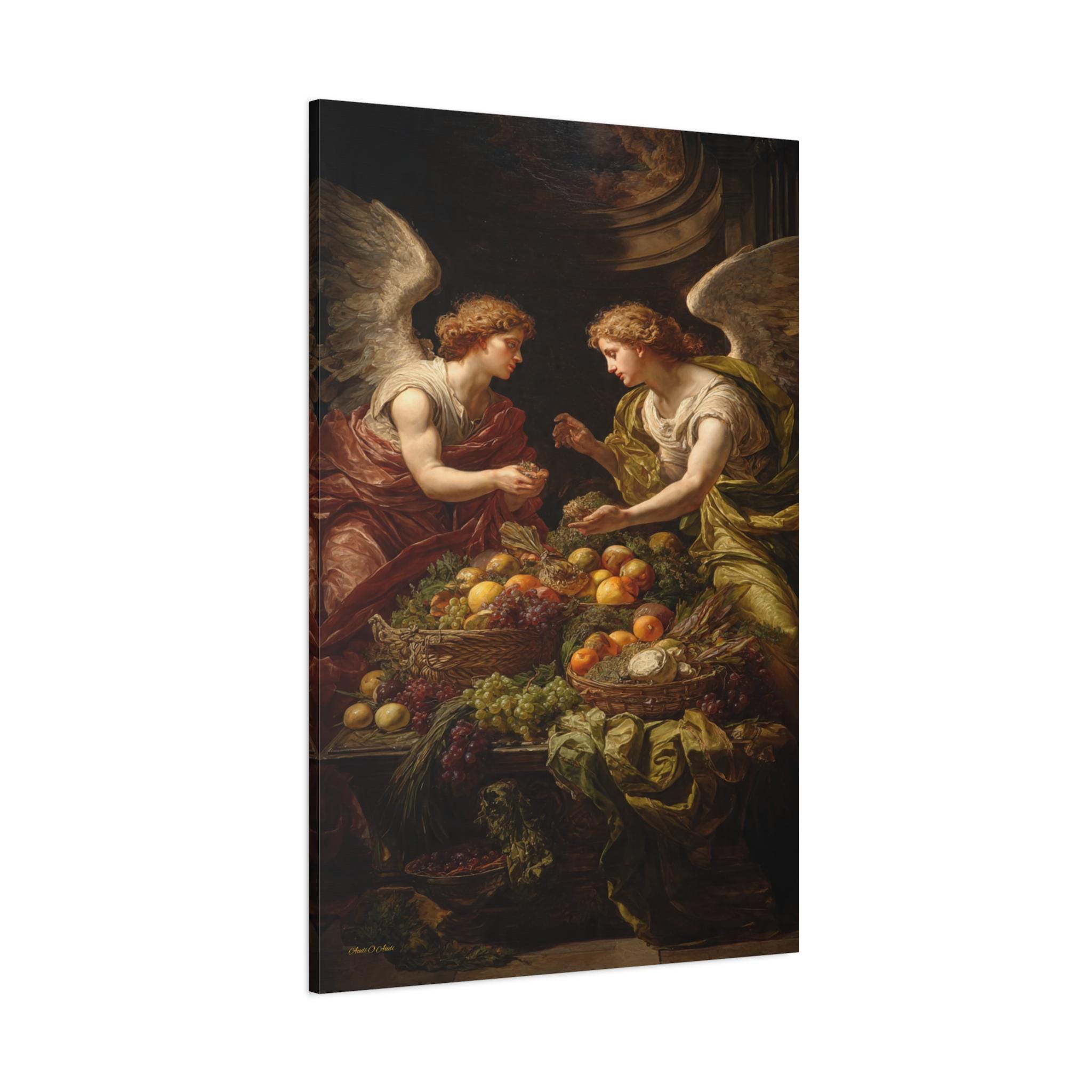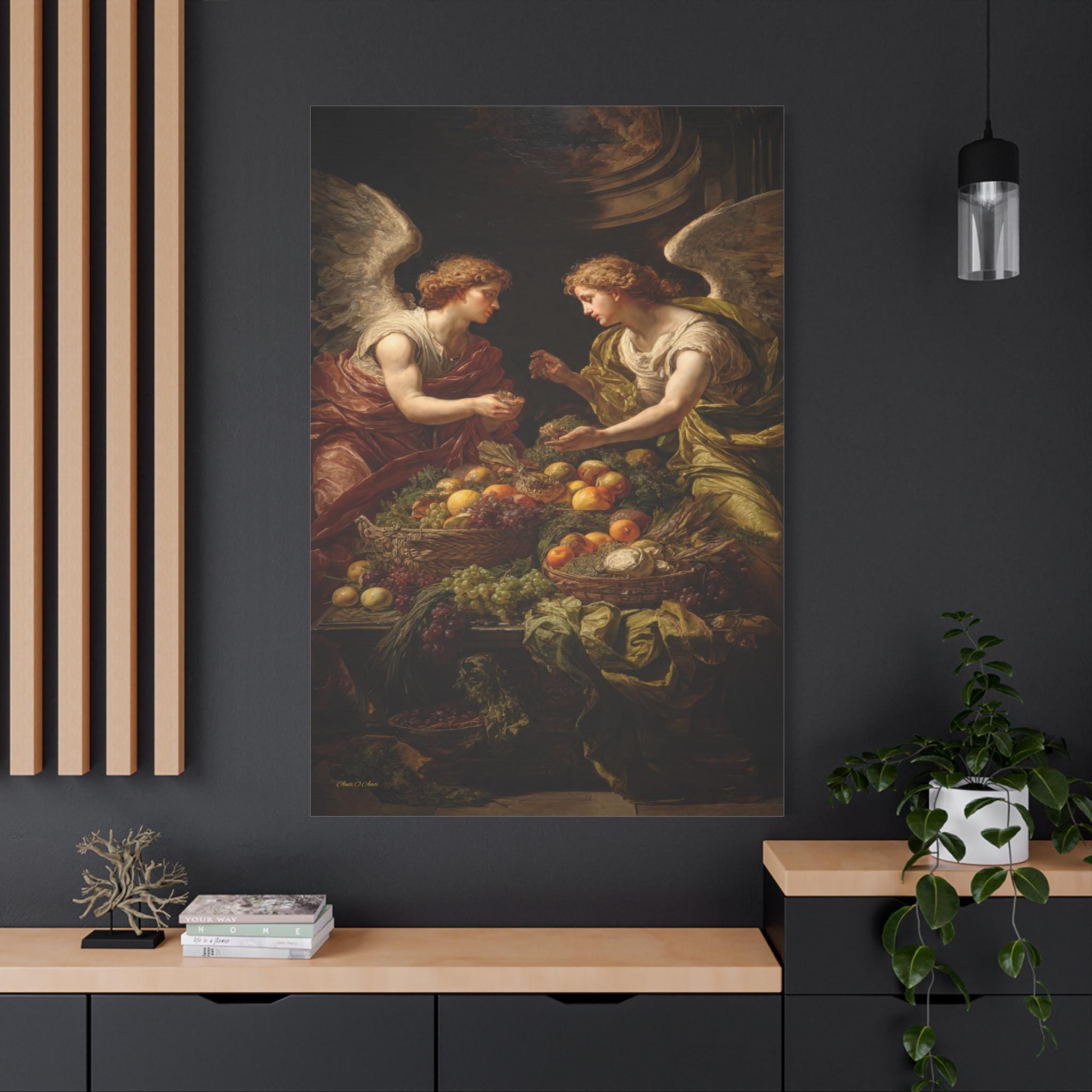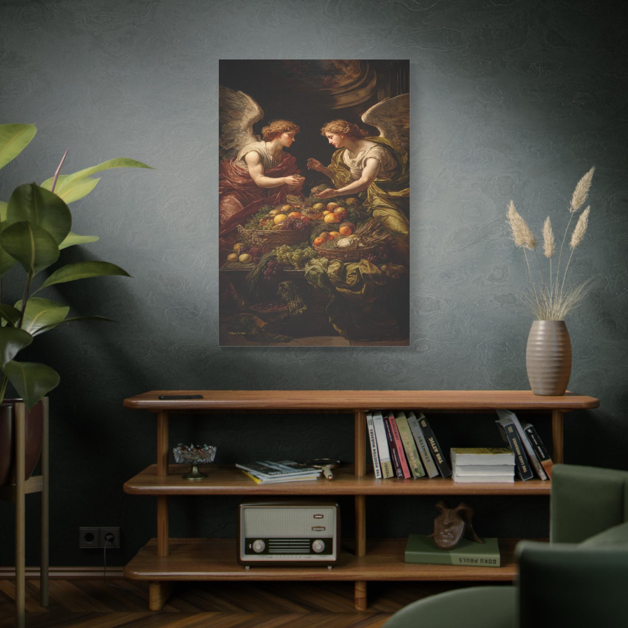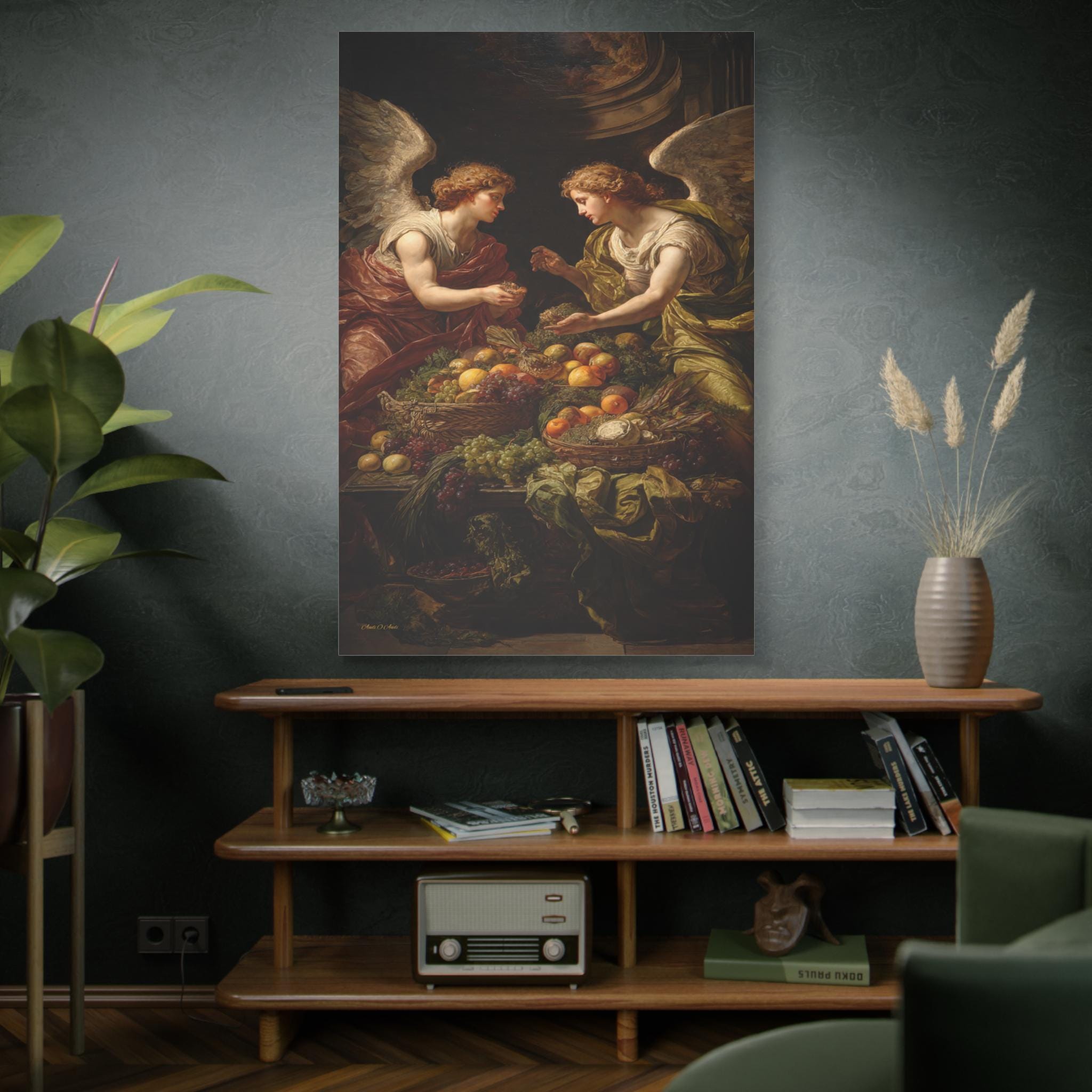 Bring the divine elegance, opulent drama, and classical beauty of a museum masterpiece into your home with this stunning Renaissance-style angel and harvest canvas print. This captivating vertical artwork features two graceful angels with magnificent wings, draped in rich crimson and olive silk robes. They lean together over an incredibly lavish, detailed feast of fresh fruits, grapes, and rich leafy greens, beautifully illuminated by dramatic, moody lighting.