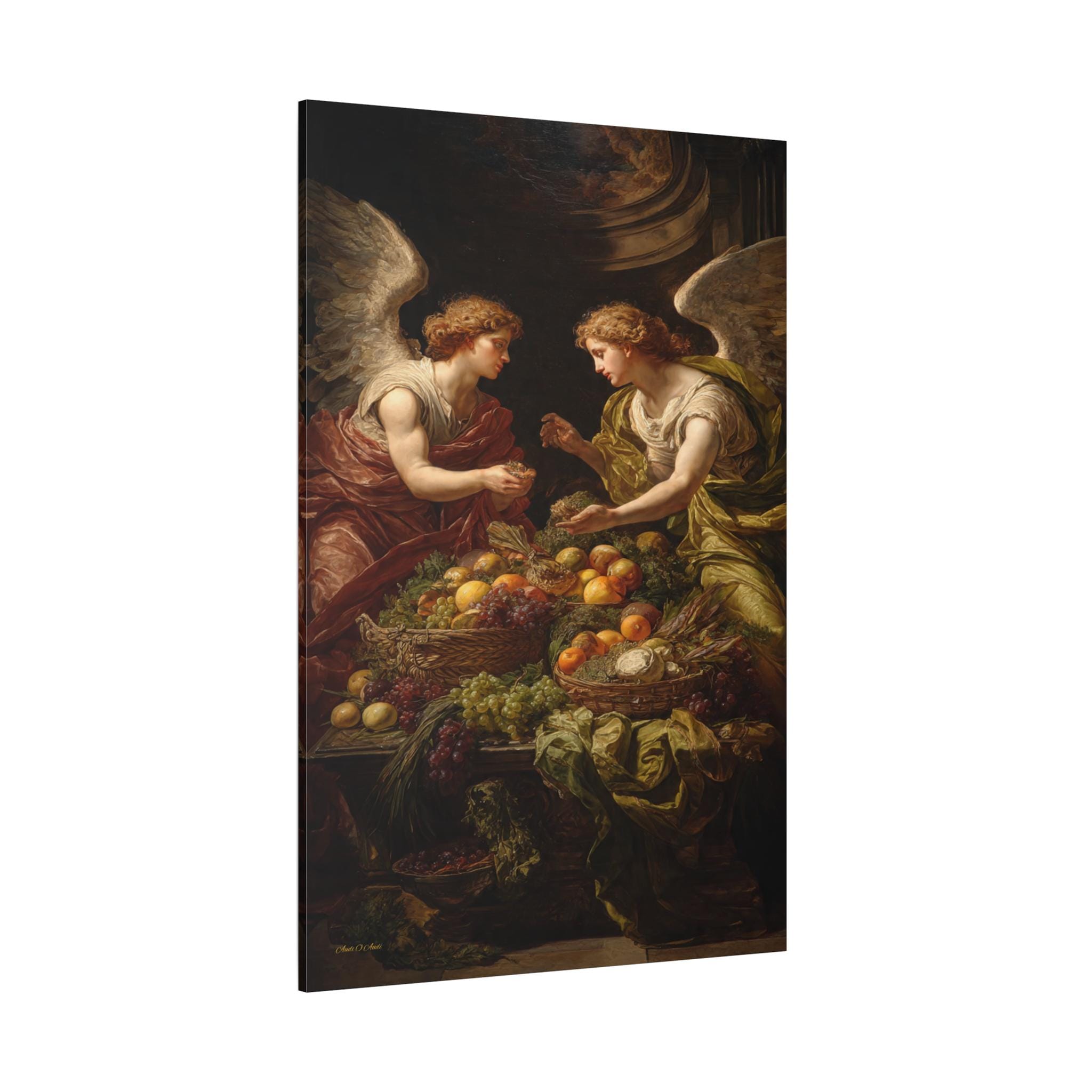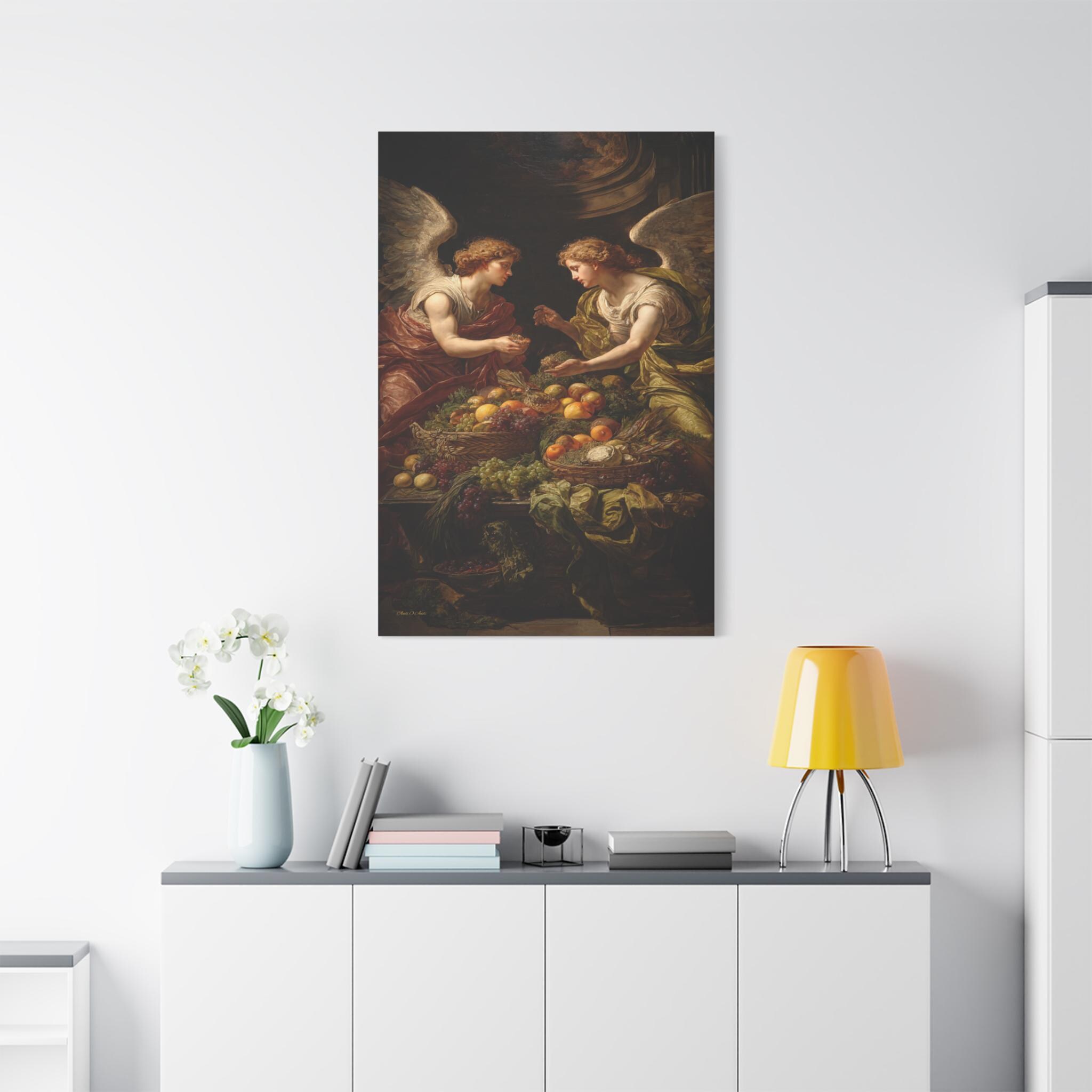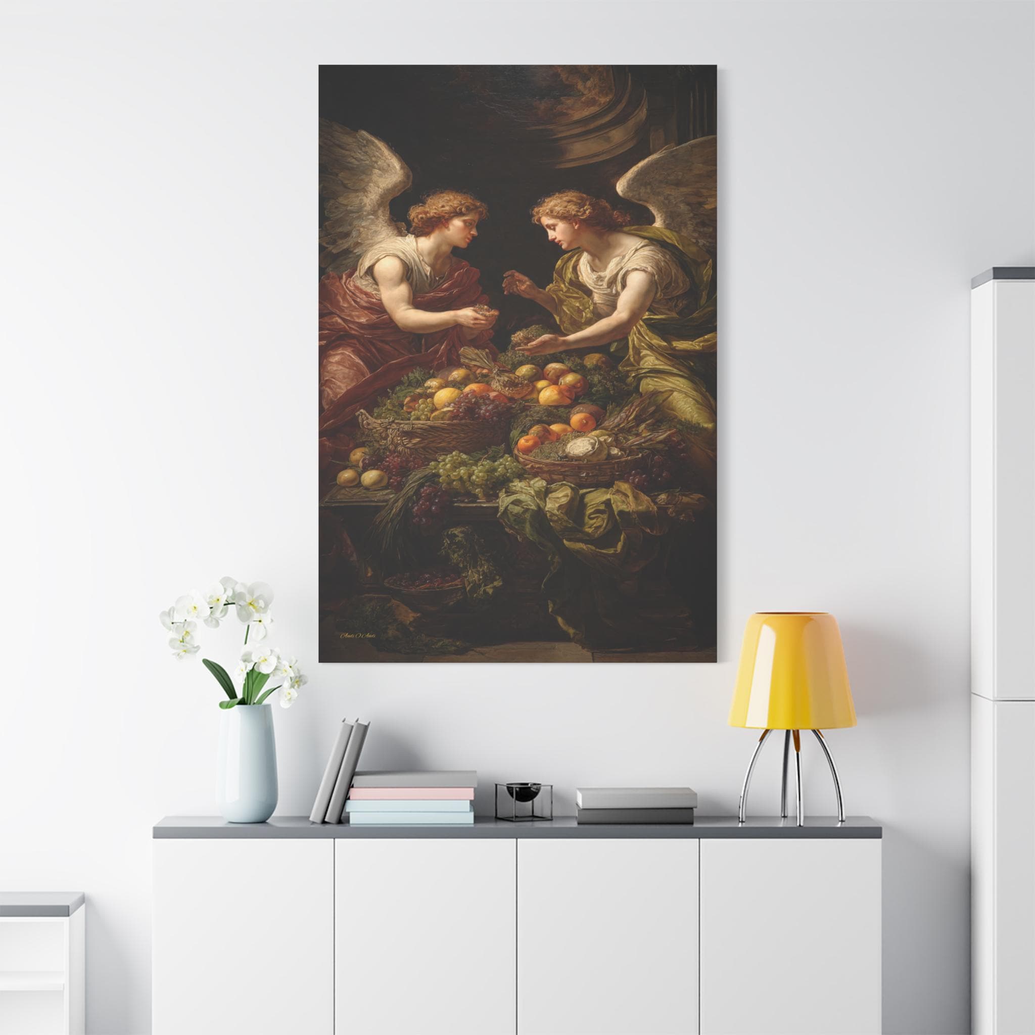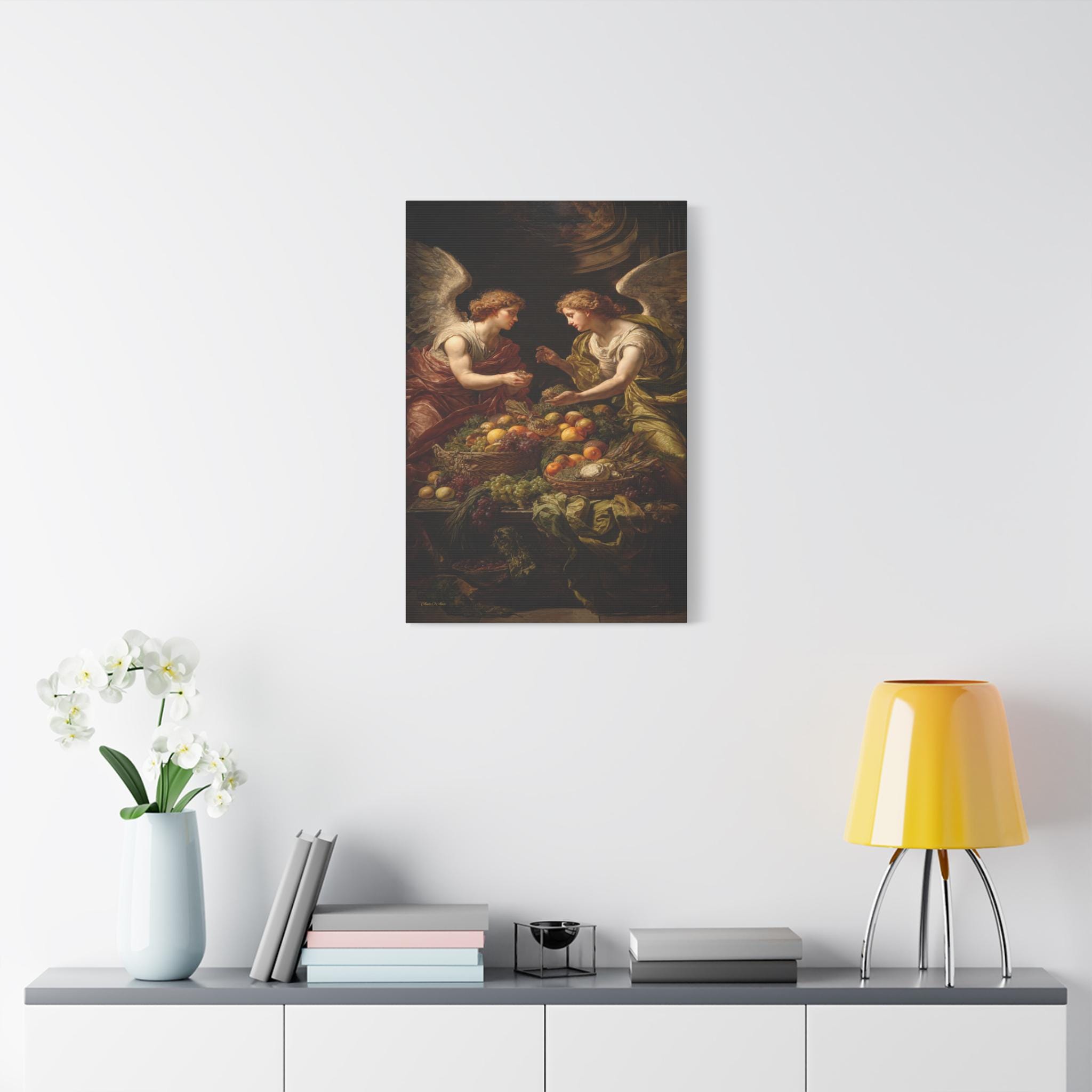 Bring the divine elegance, opulent drama, and classical beauty of a museum masterpiece into your home with this stunning Renaissance-style angel and harvest canvas print. This captivating vertical artwork features two graceful angels with magnificent wings, draped in rich crimson and olive silk robes. They lean together over an incredibly lavish, detailed feast of fresh fruits, grapes, and rich leafy greens, beautifully illuminated by dramatic, moody lighting.
