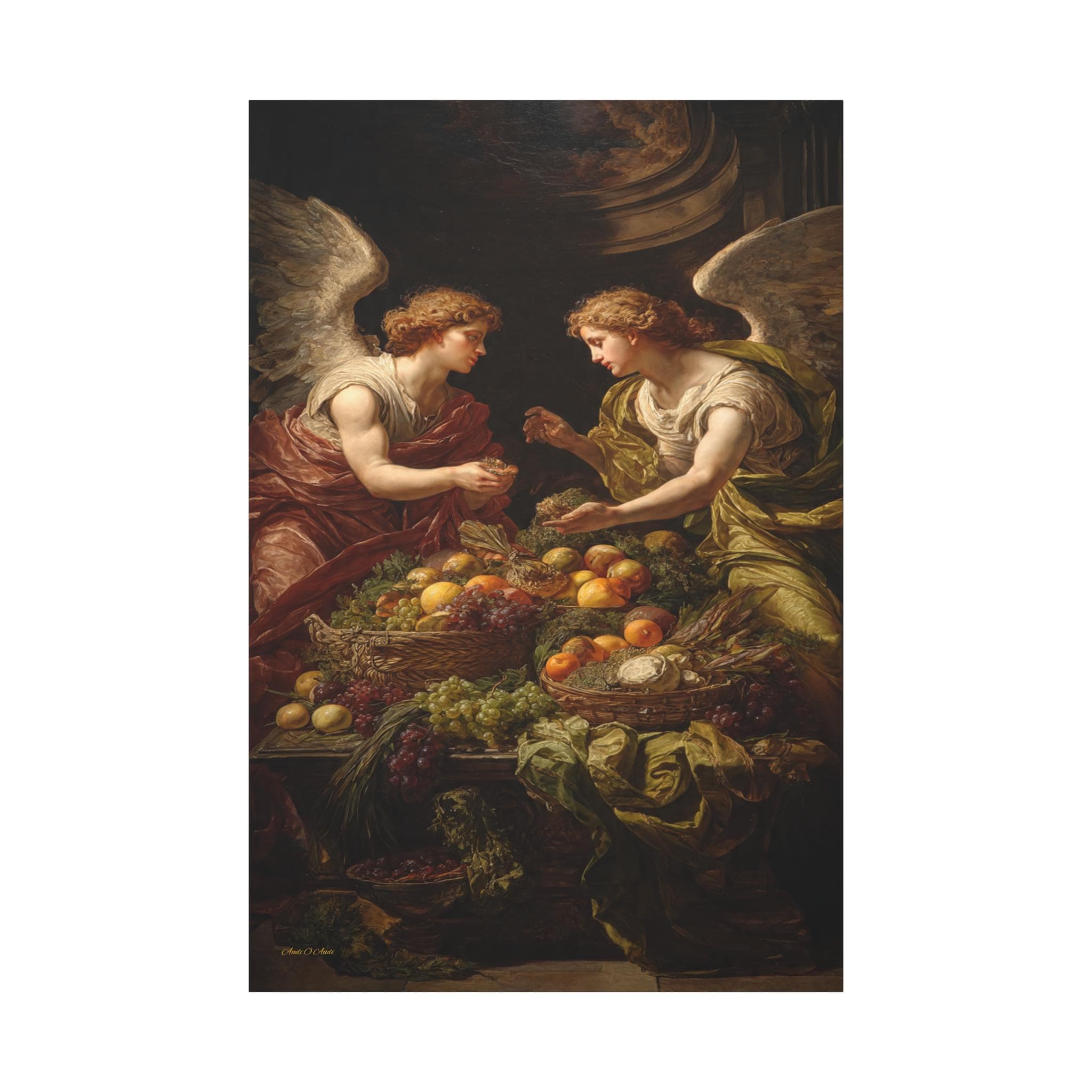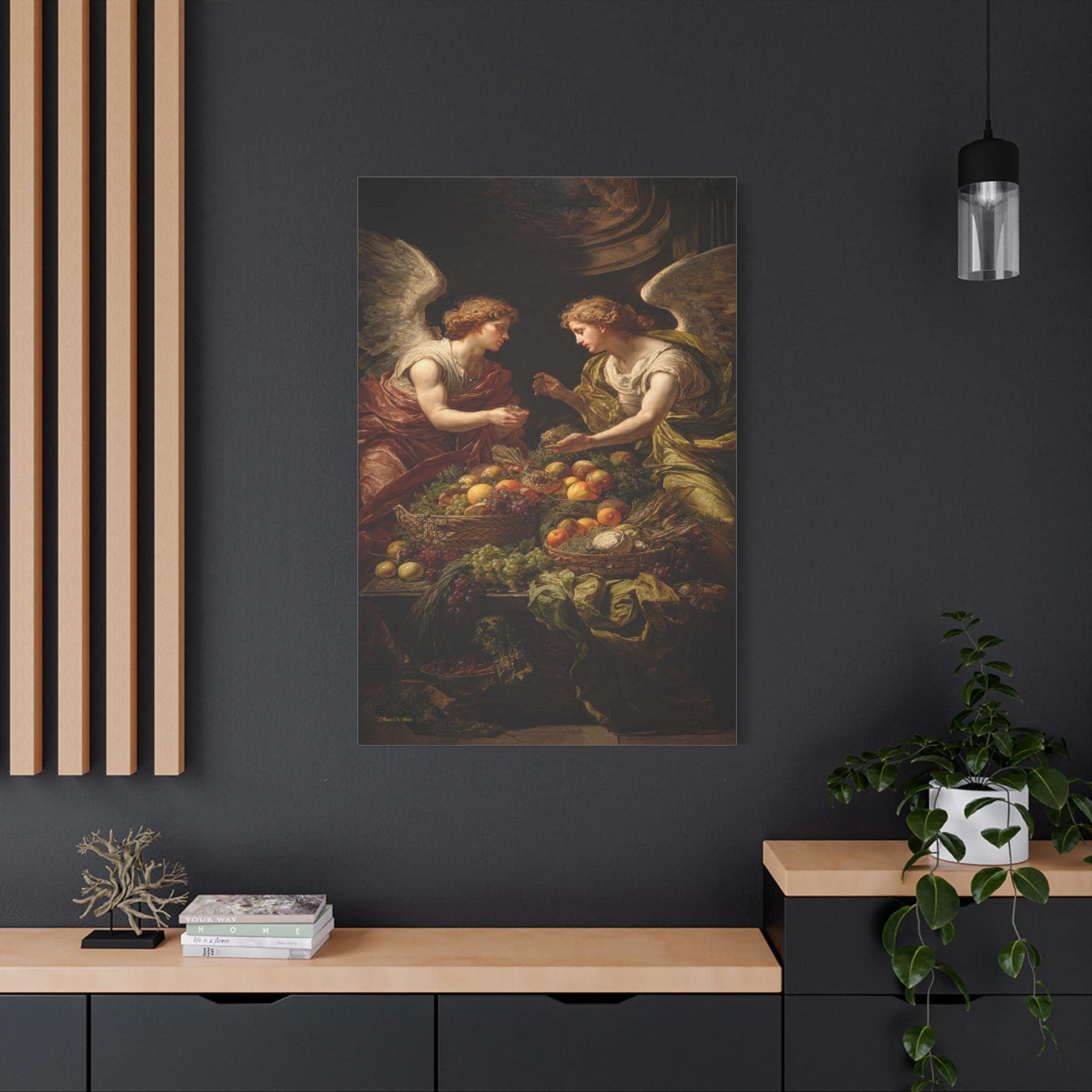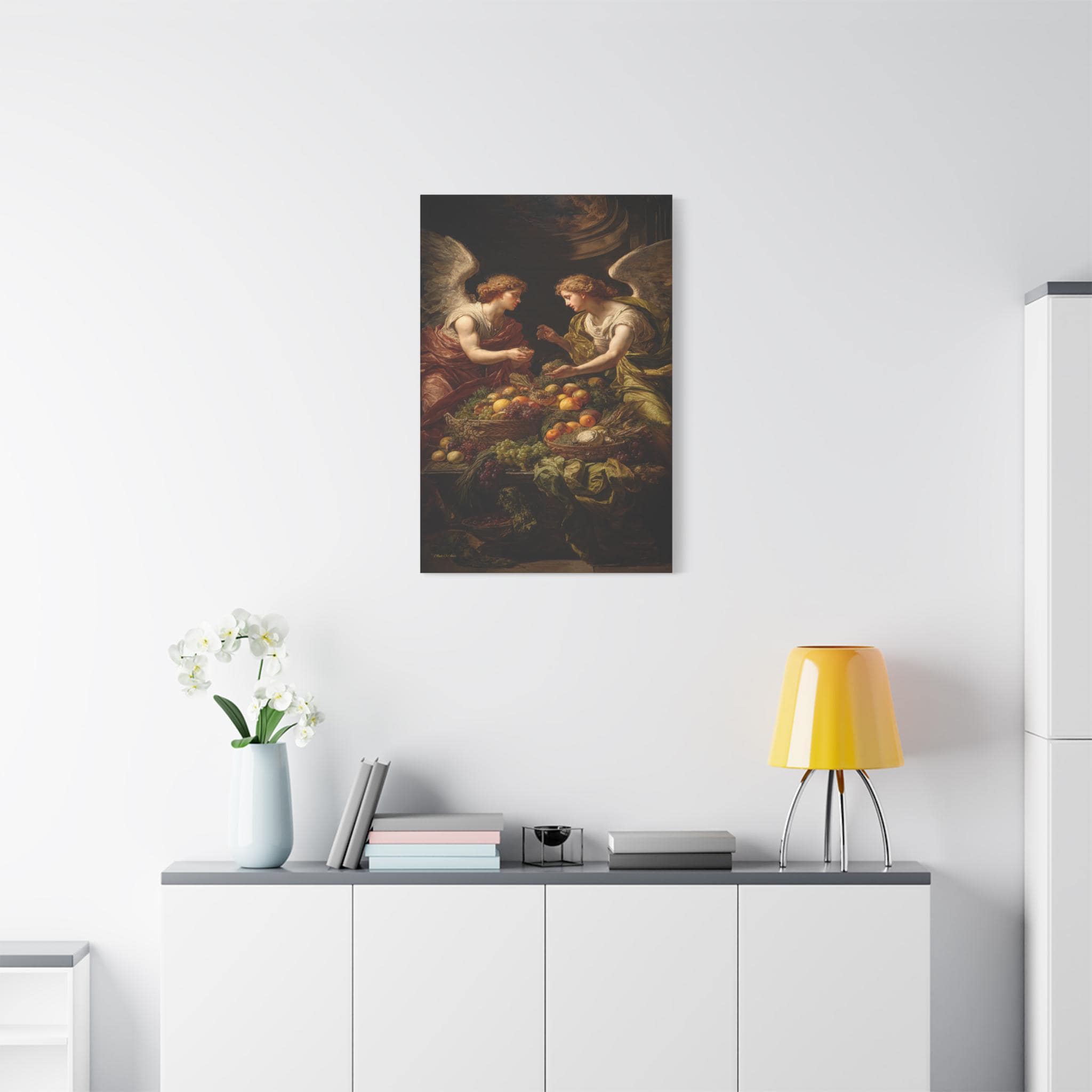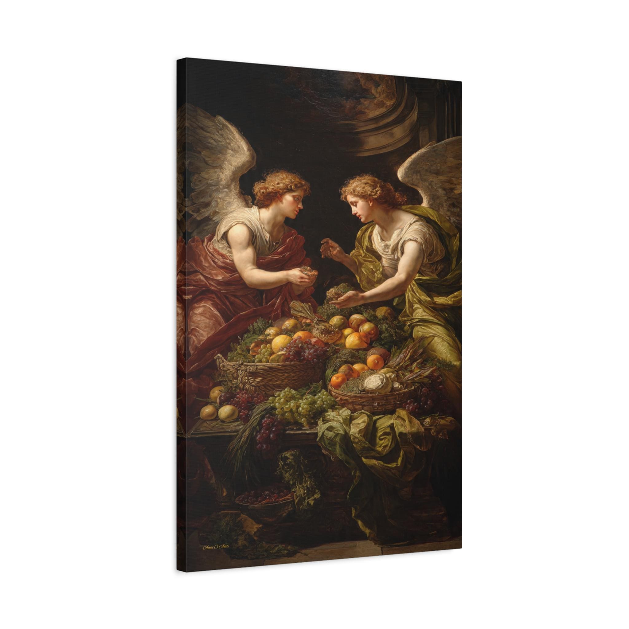 Bring the divine elegance, opulent drama, and classical beauty of a museum masterpiece into your home with this stunning Renaissance-style angel and harvest canvas print. This captivating vertical artwork features two graceful angels with magnificent wings, draped in rich crimson and olive silk robes. They lean together over an incredibly lavish, detailed feast of fresh fruits, grapes, and rich leafy greens, beautifully illuminated by dramatic, moody lighting.