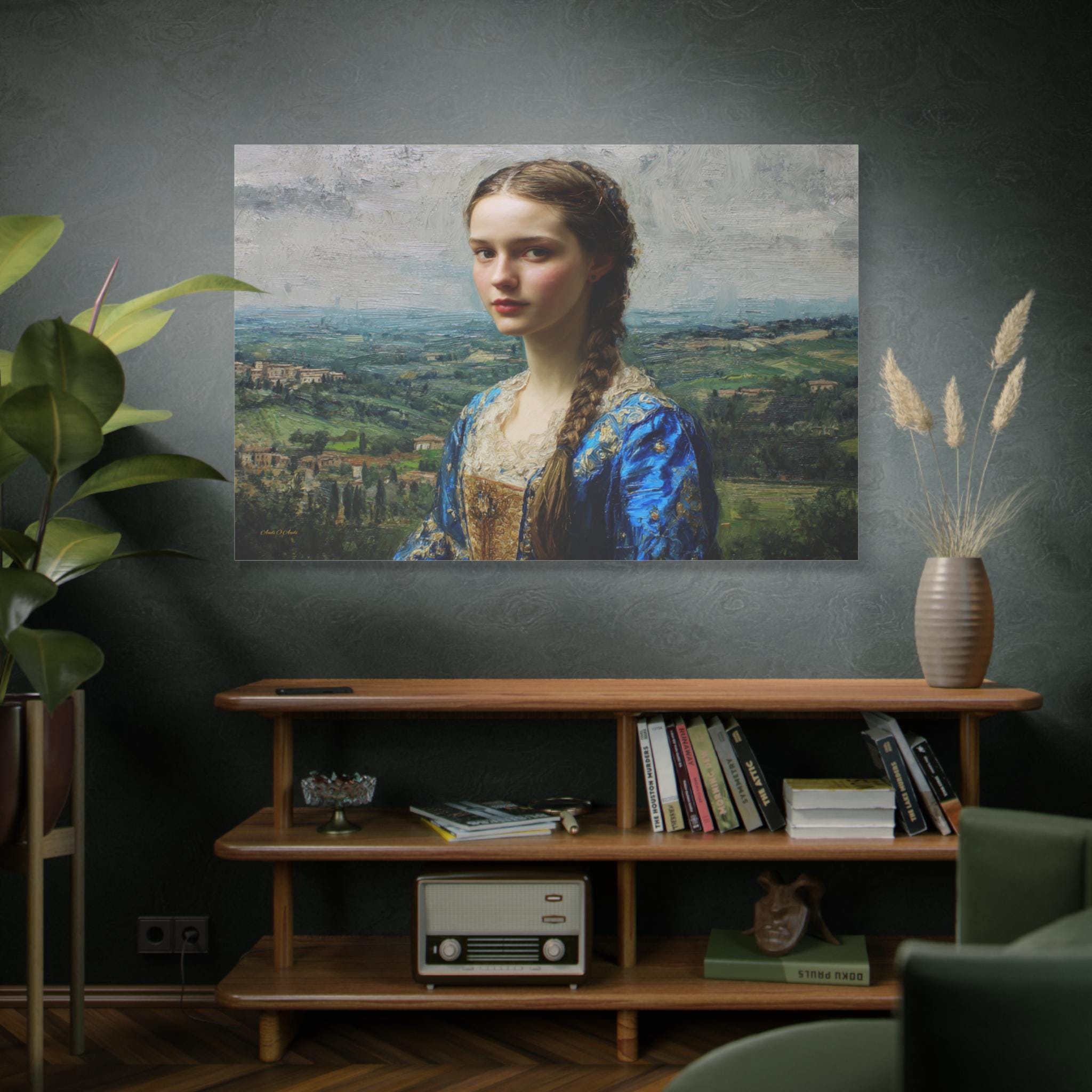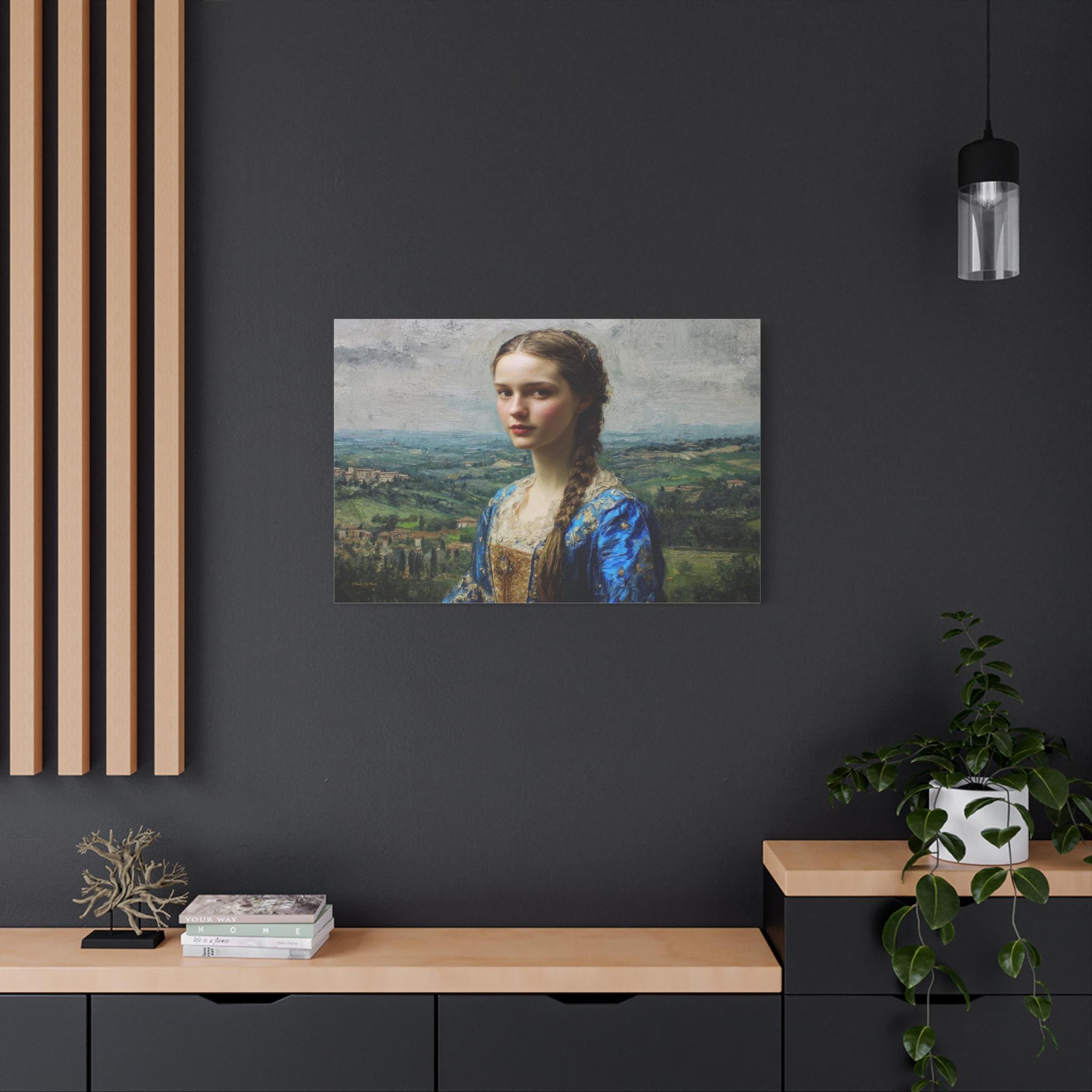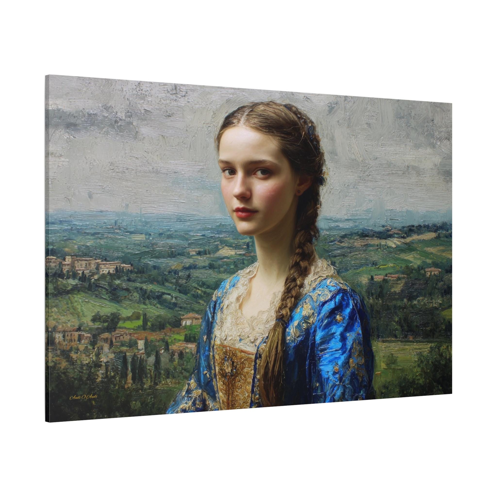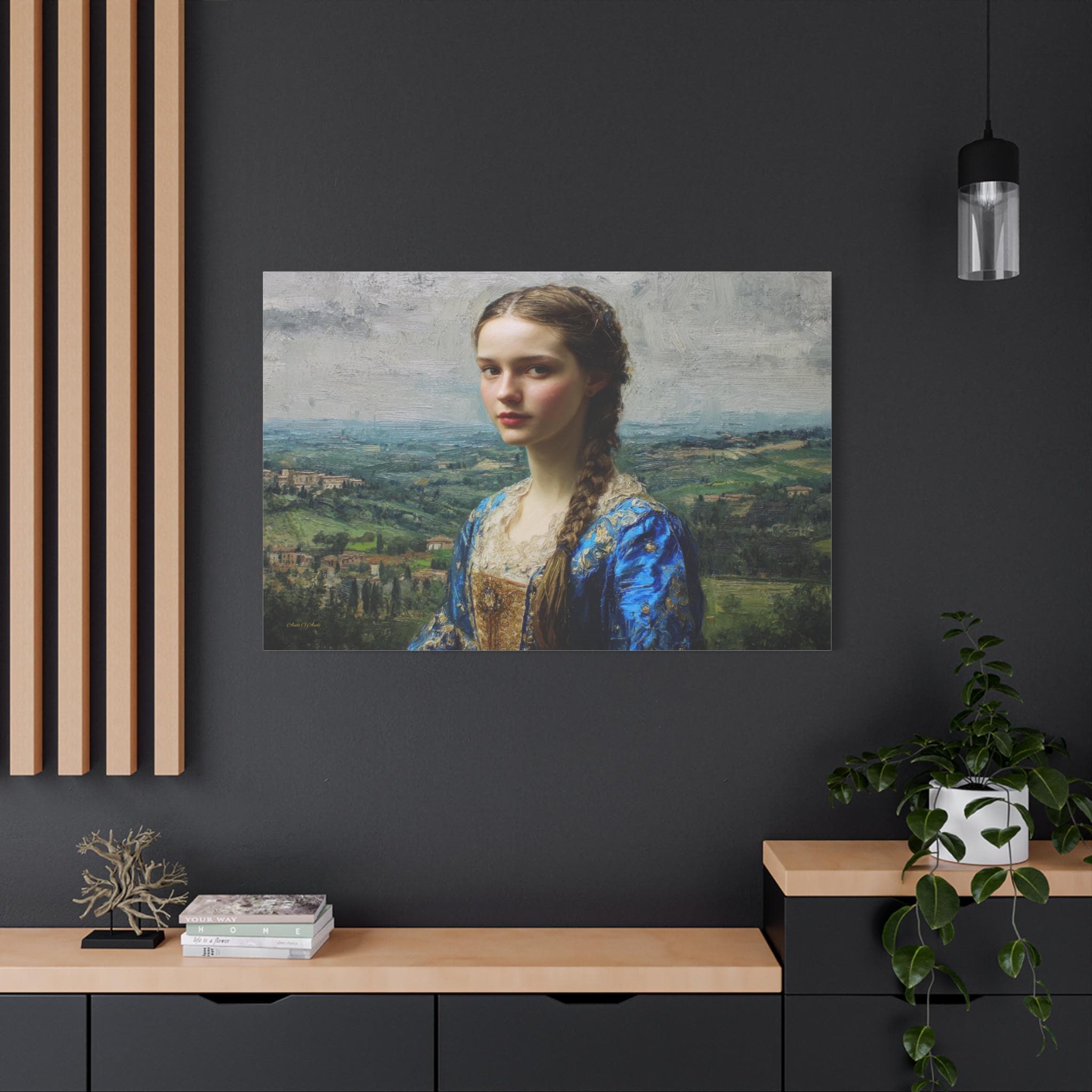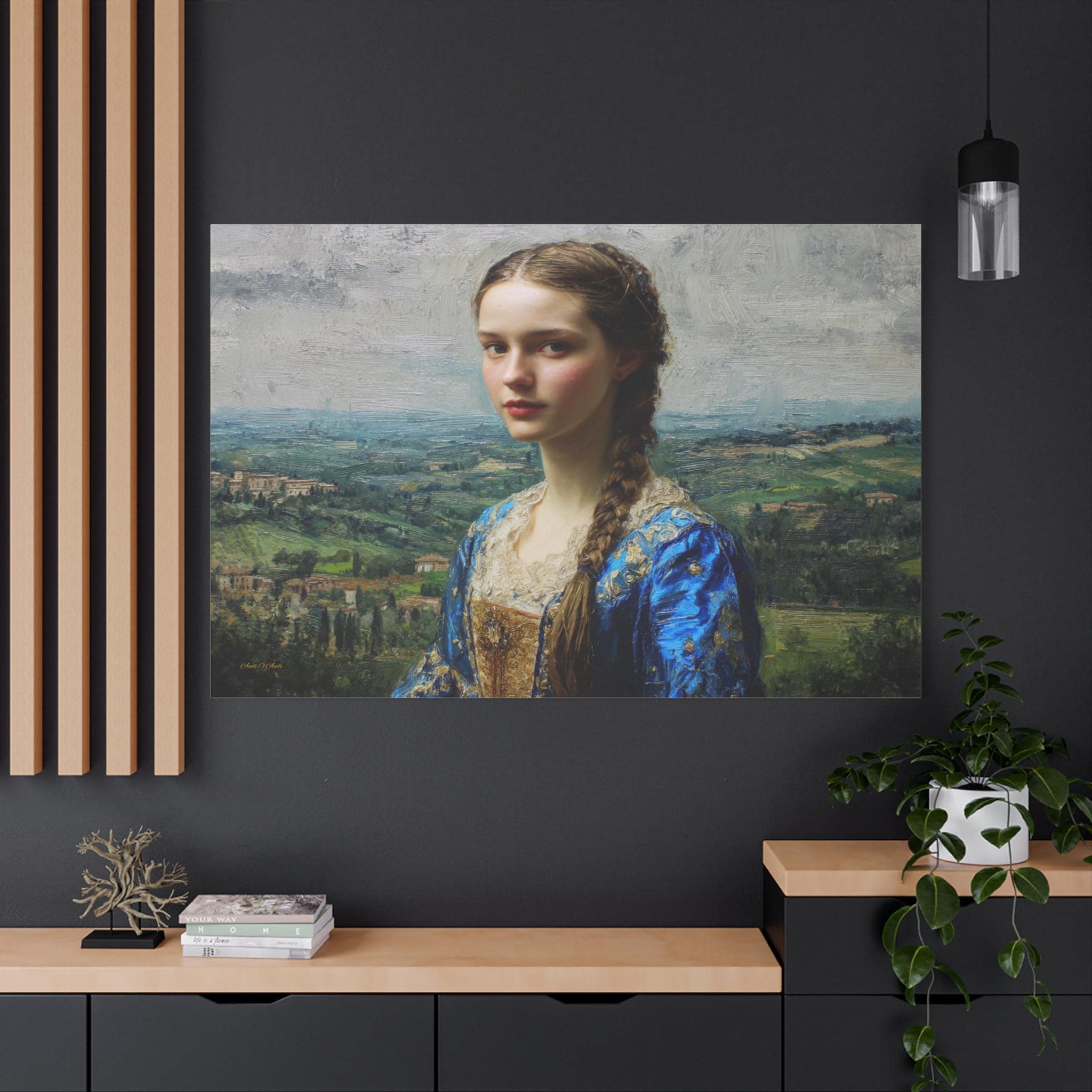 Bring the breathtaking elegance, quiet romance, and timeless beauty of classic fine art into your home with this stunning vintage portrait canvas print. This captivating artwork features the serene face of a beautiful young woman with a long woven braid, dressed in a richly detailed sapphire blue and gold gown. She is perfectly framed against a sweeping, impressionistic pastoral landscape of rolling green hills, distant villages, and a soft, cloudy sky reminiscent of the Tuscan countryside.