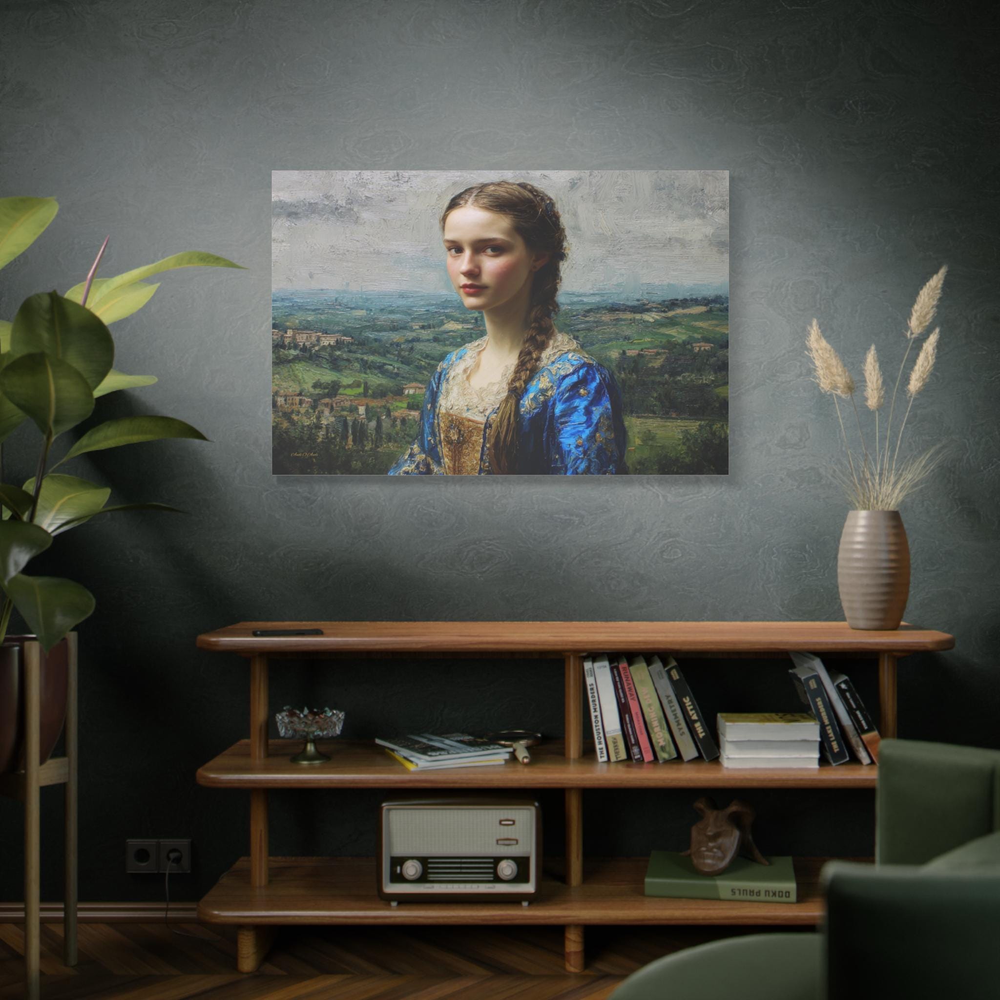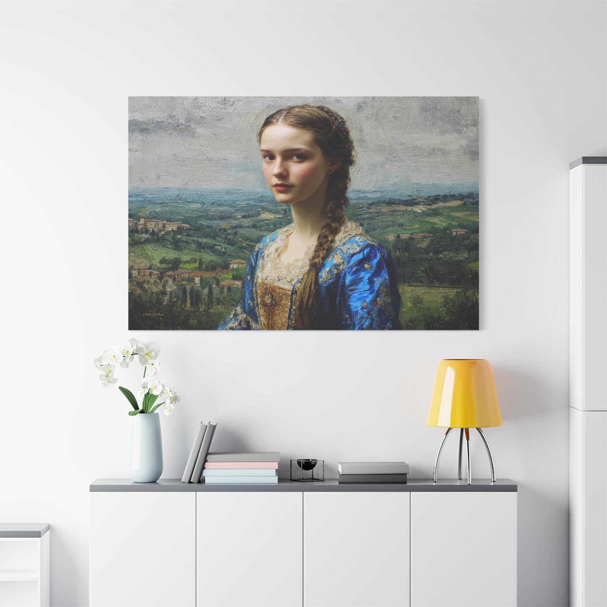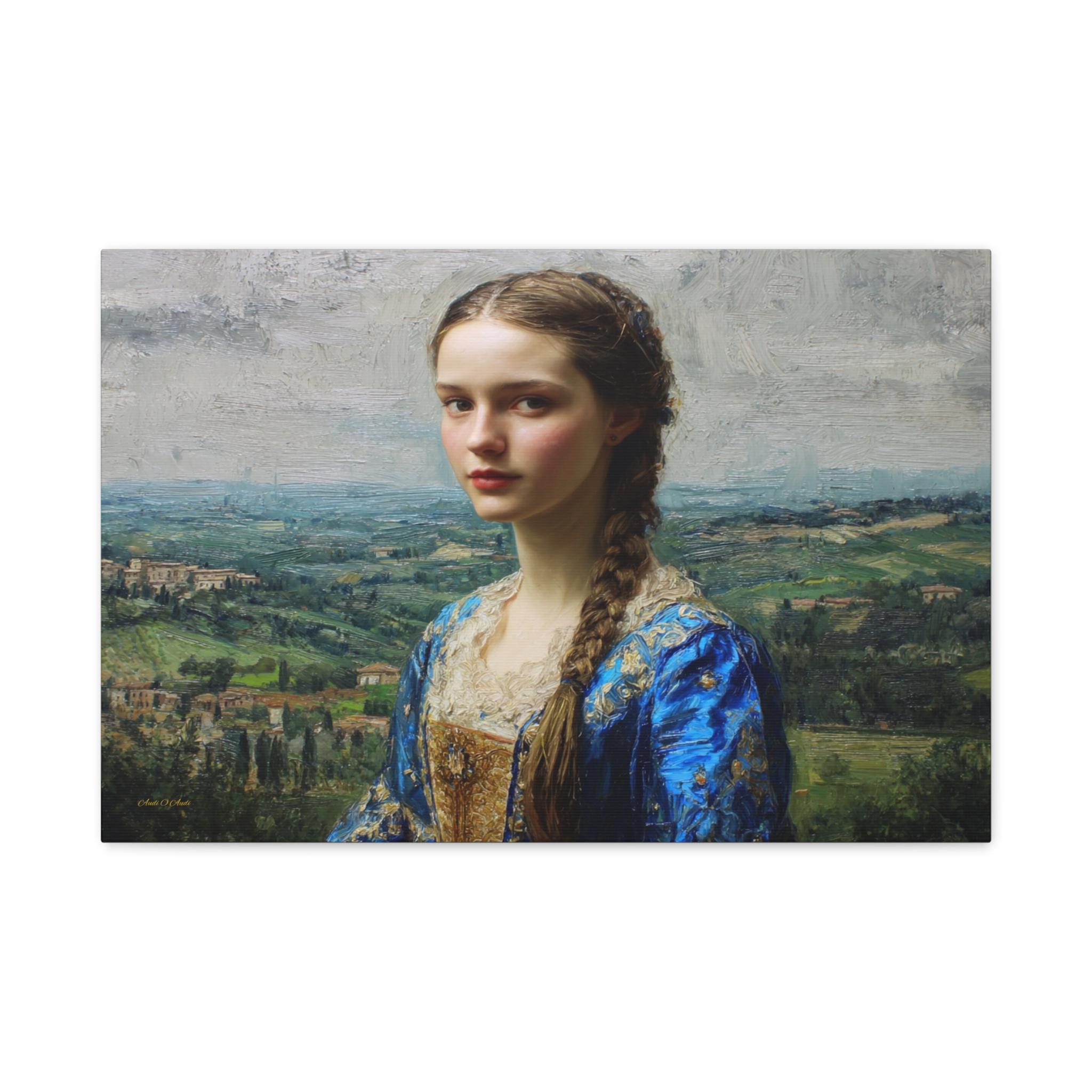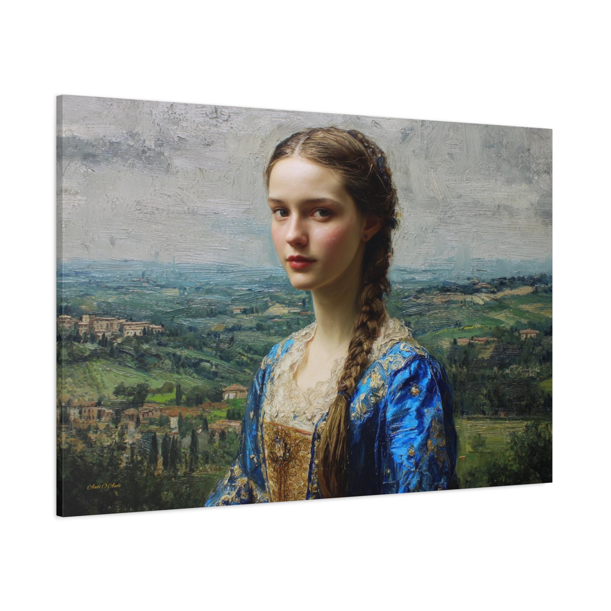 Bring the breathtaking elegance, quiet romance, and timeless beauty of classic fine art into your home with this stunning vintage portrait canvas print. This captivating artwork features the serene face of a beautiful young woman with a long woven braid, dressed in a richly detailed sapphire blue and gold gown. She is perfectly framed against a sweeping, impressionistic pastoral landscape of rolling green hills, distant villages, and a soft, cloudy sky reminiscent of the Tuscan countryside.