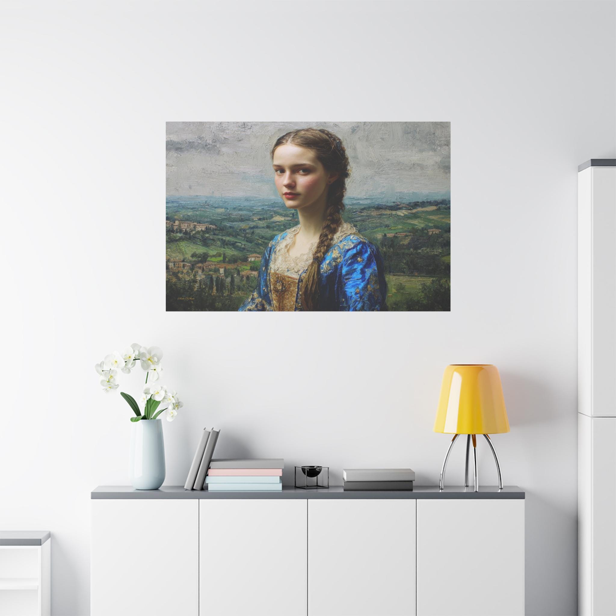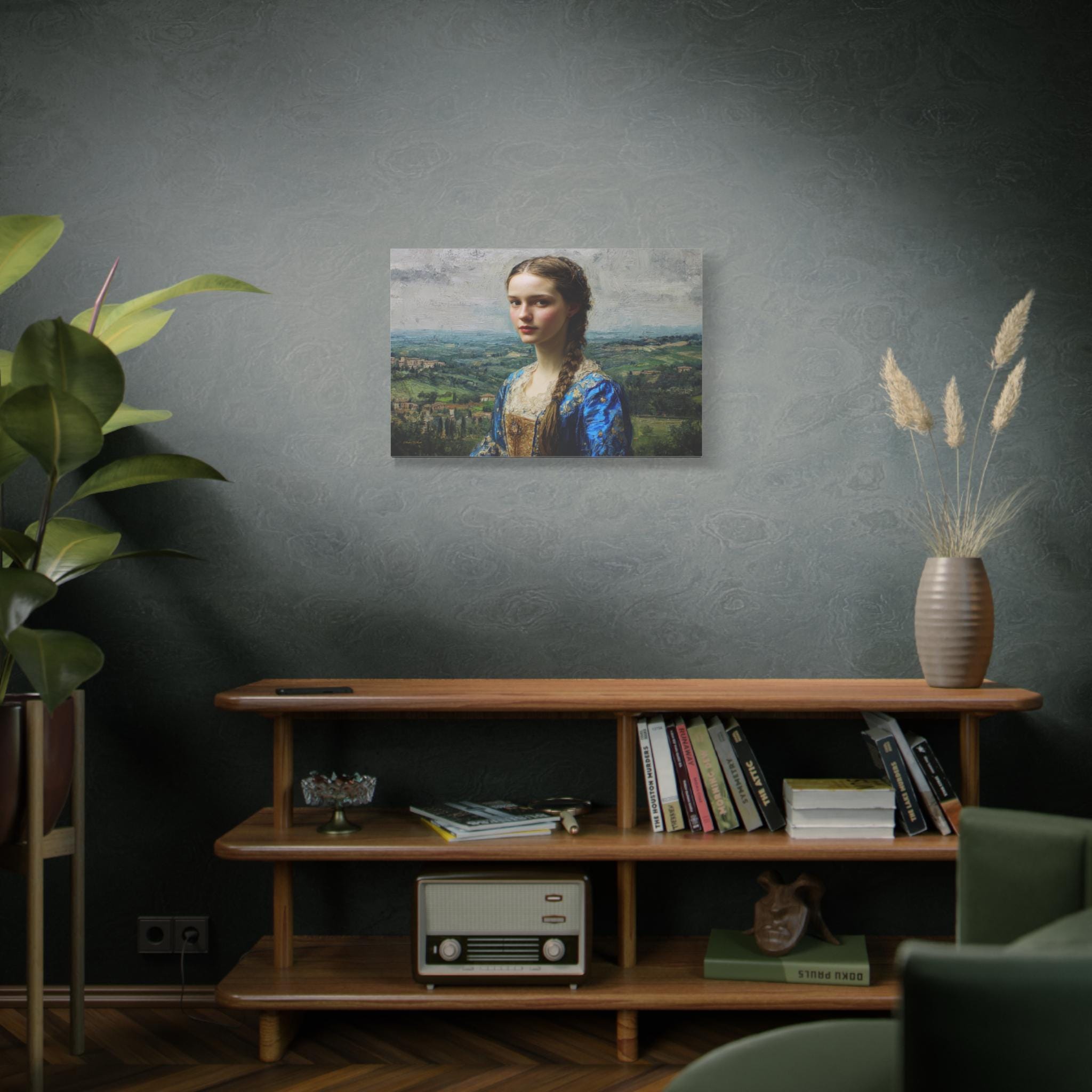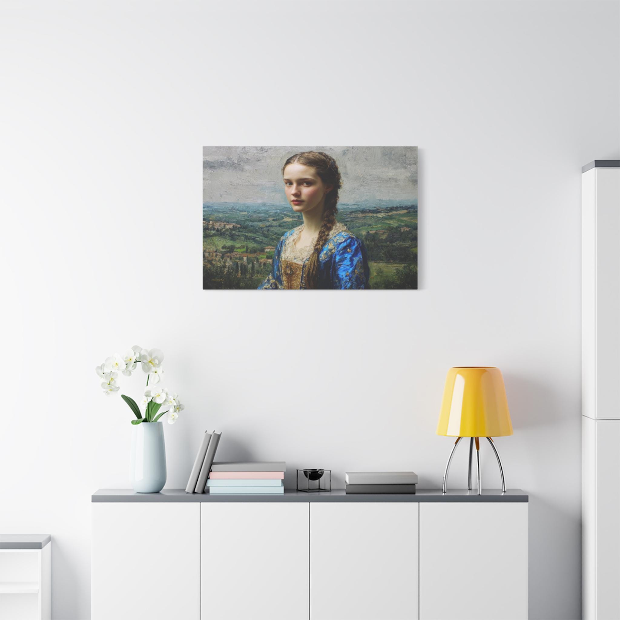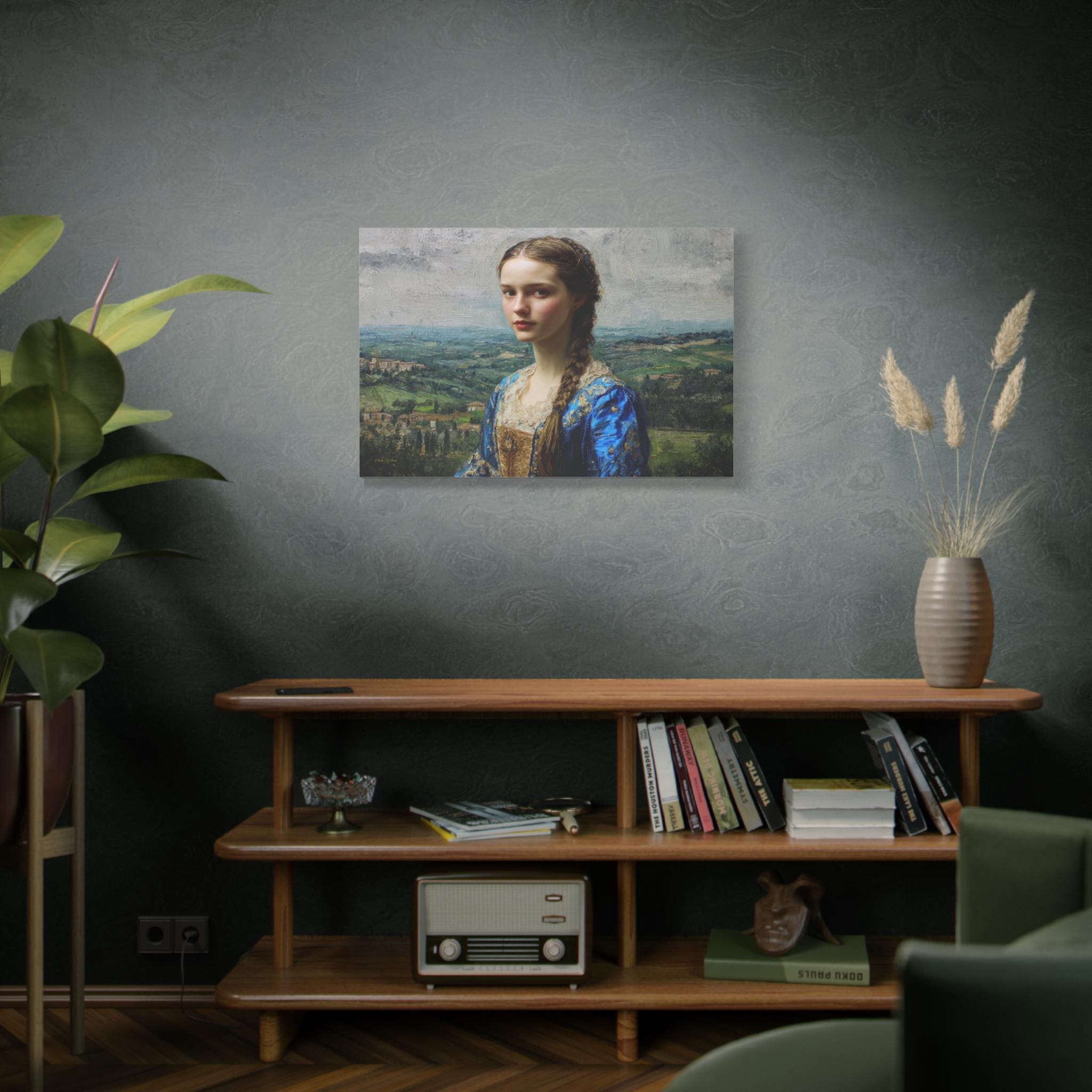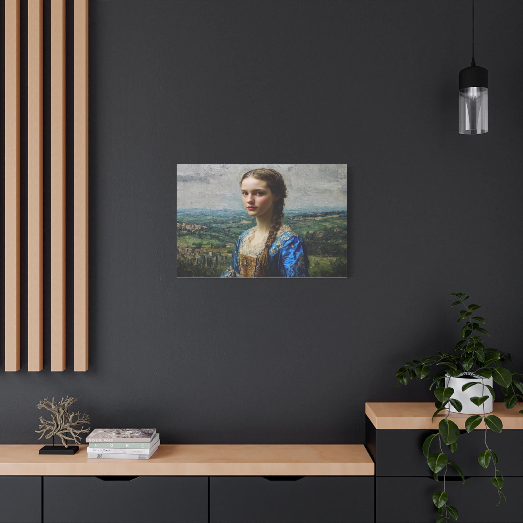 Bring the breathtaking elegance, quiet romance, and timeless beauty of classic fine art into your home with this stunning vintage portrait canvas print. This captivating artwork features the serene face of a beautiful young woman with a long woven braid, dressed in a richly detailed sapphire blue and gold gown. She is perfectly framed against a sweeping, impressionistic pastoral landscape of rolling green hills, distant villages, and a soft, cloudy sky reminiscent of the Tuscan countryside.