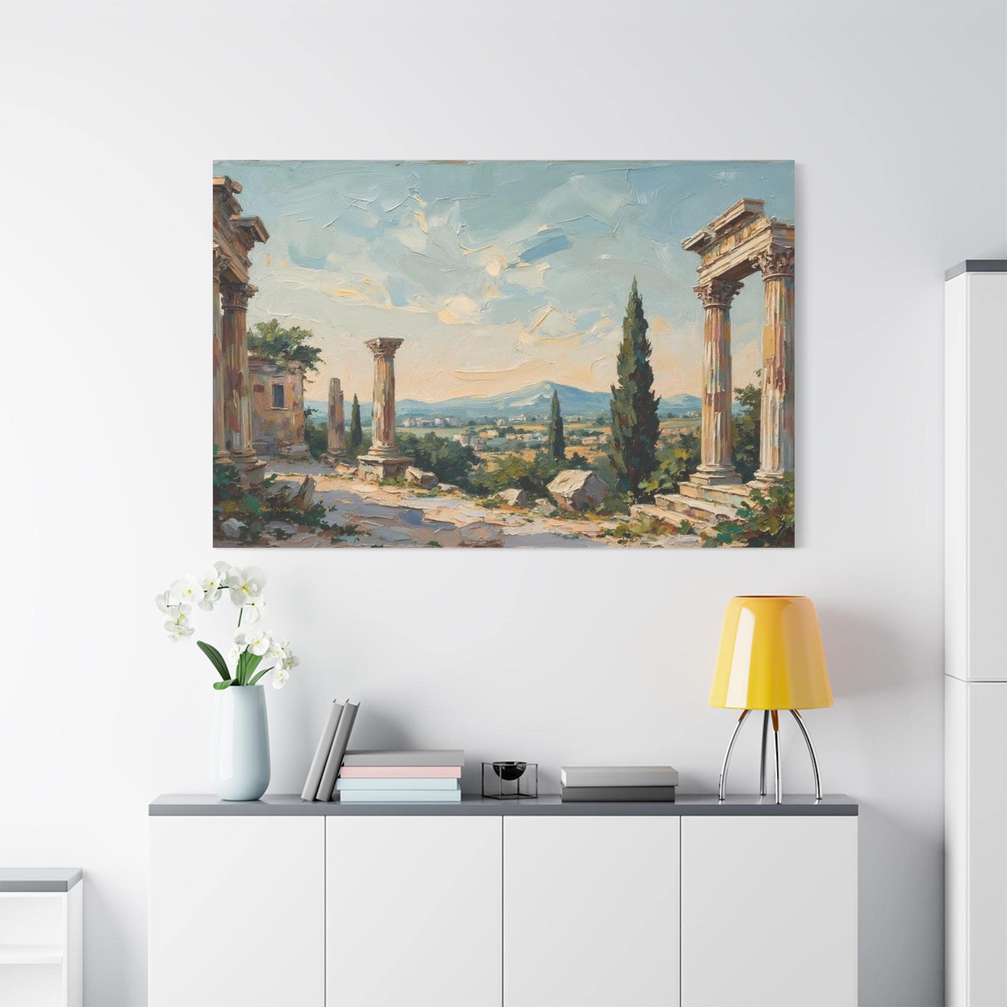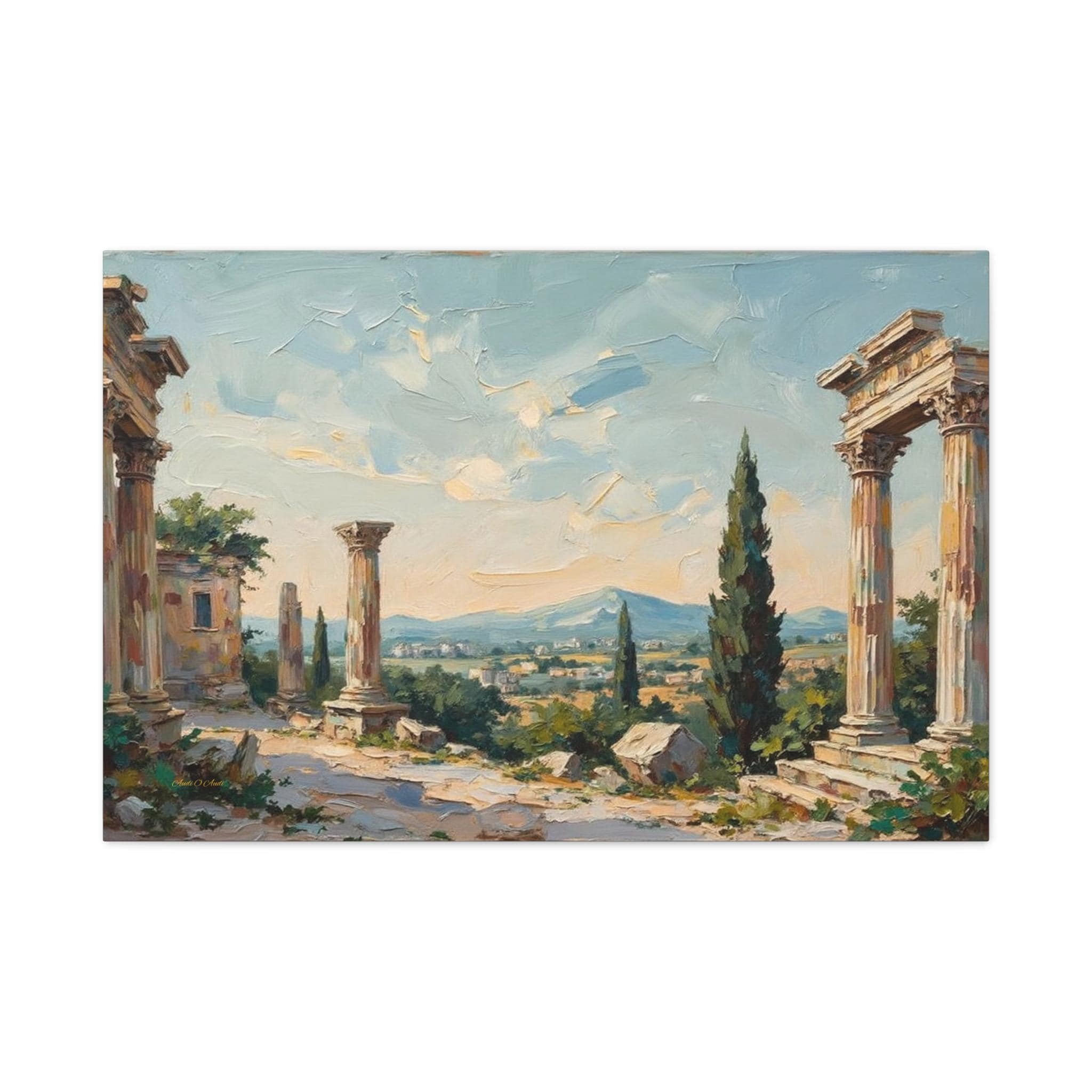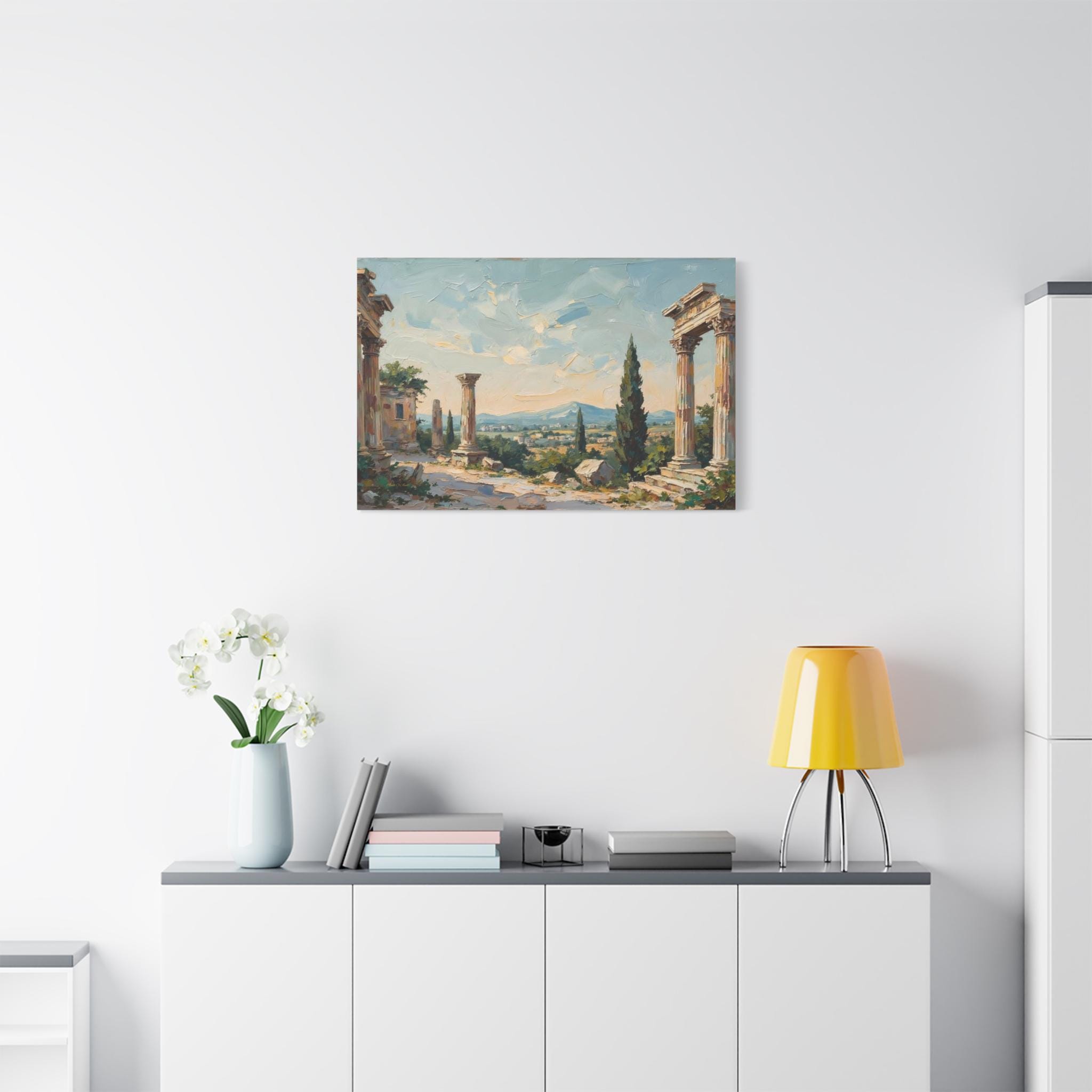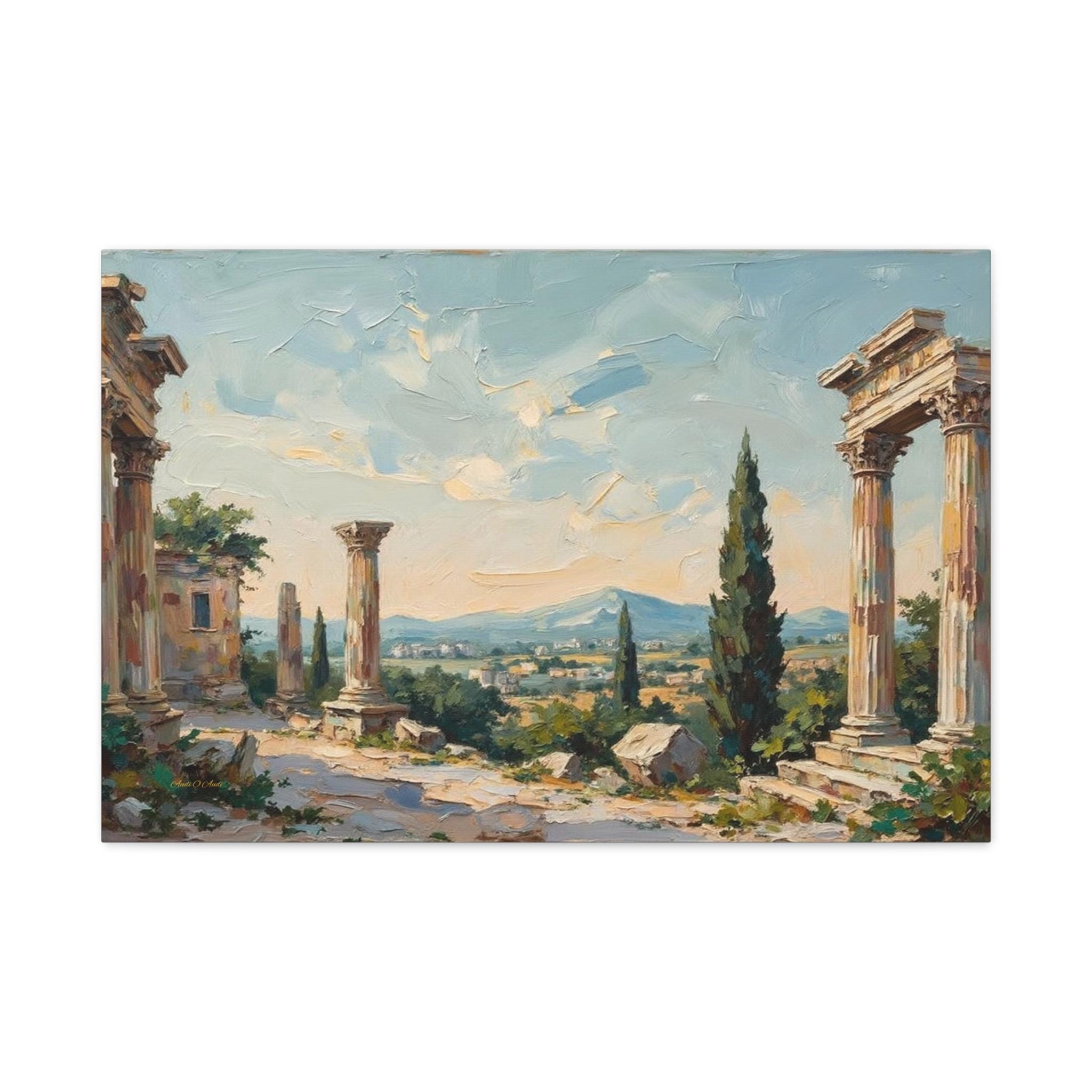 Bring the timeless elegance, historical grandeur, and sun-drenched romance of the ancient Mediterranean into your home with this stunning classical ruins landscape canvas print. This captivating horizontal artwork features the majestic remnants of ancient stone columns, beautifully framed by lush green cypress trees and overlooking a sweeping, picturesque valley with distant, soft blue mountains.