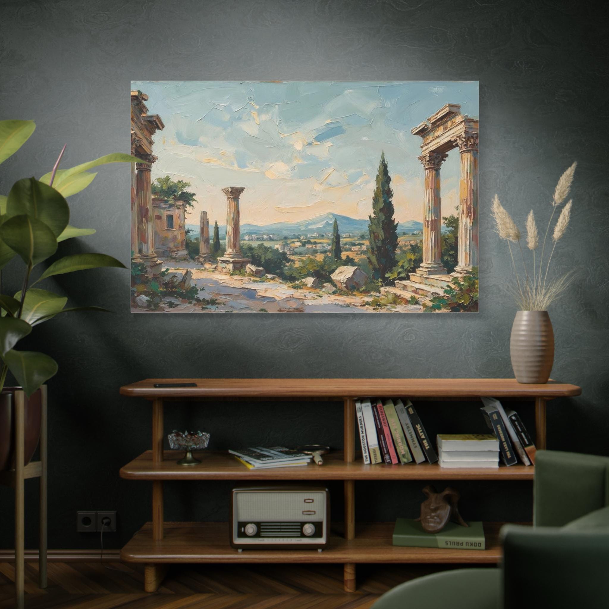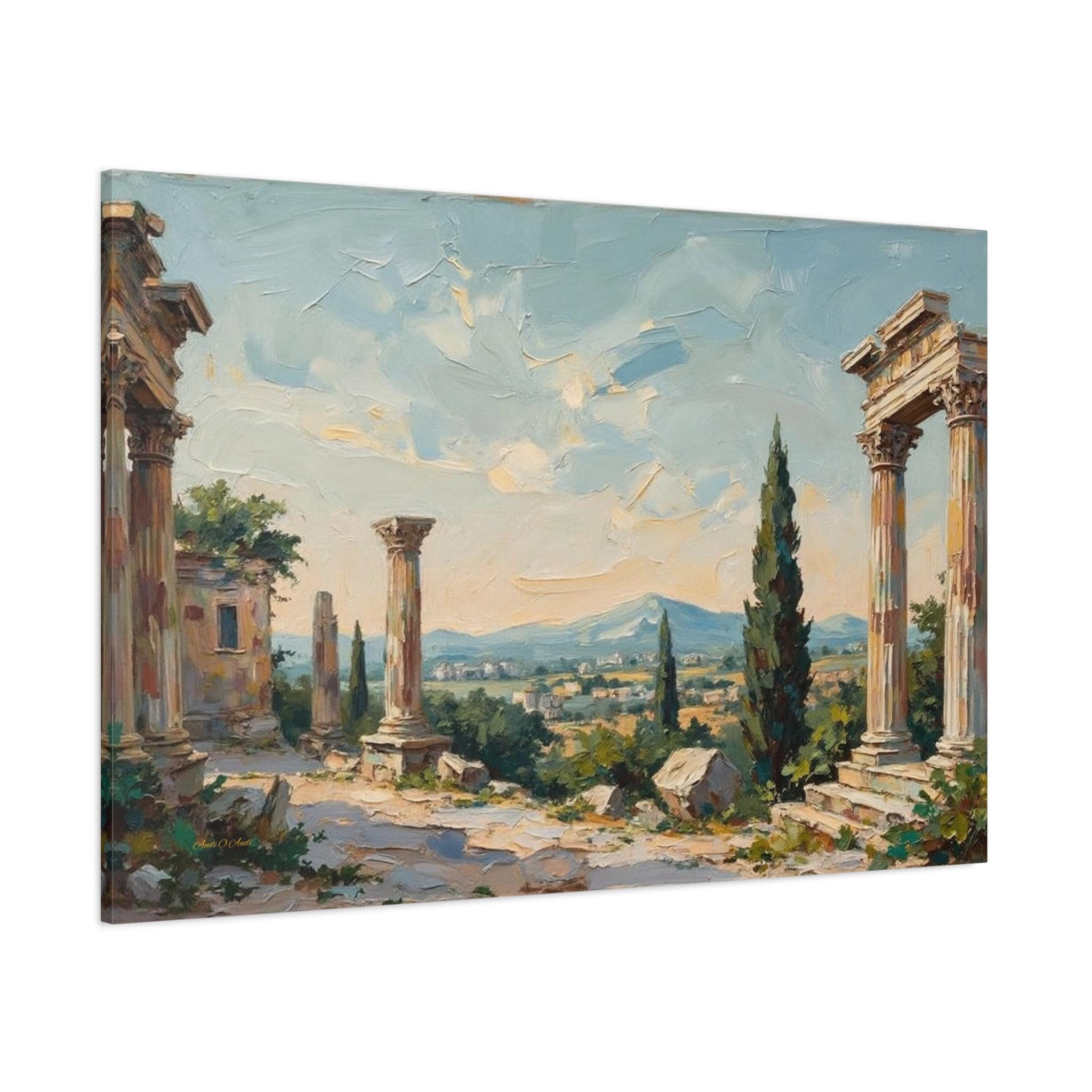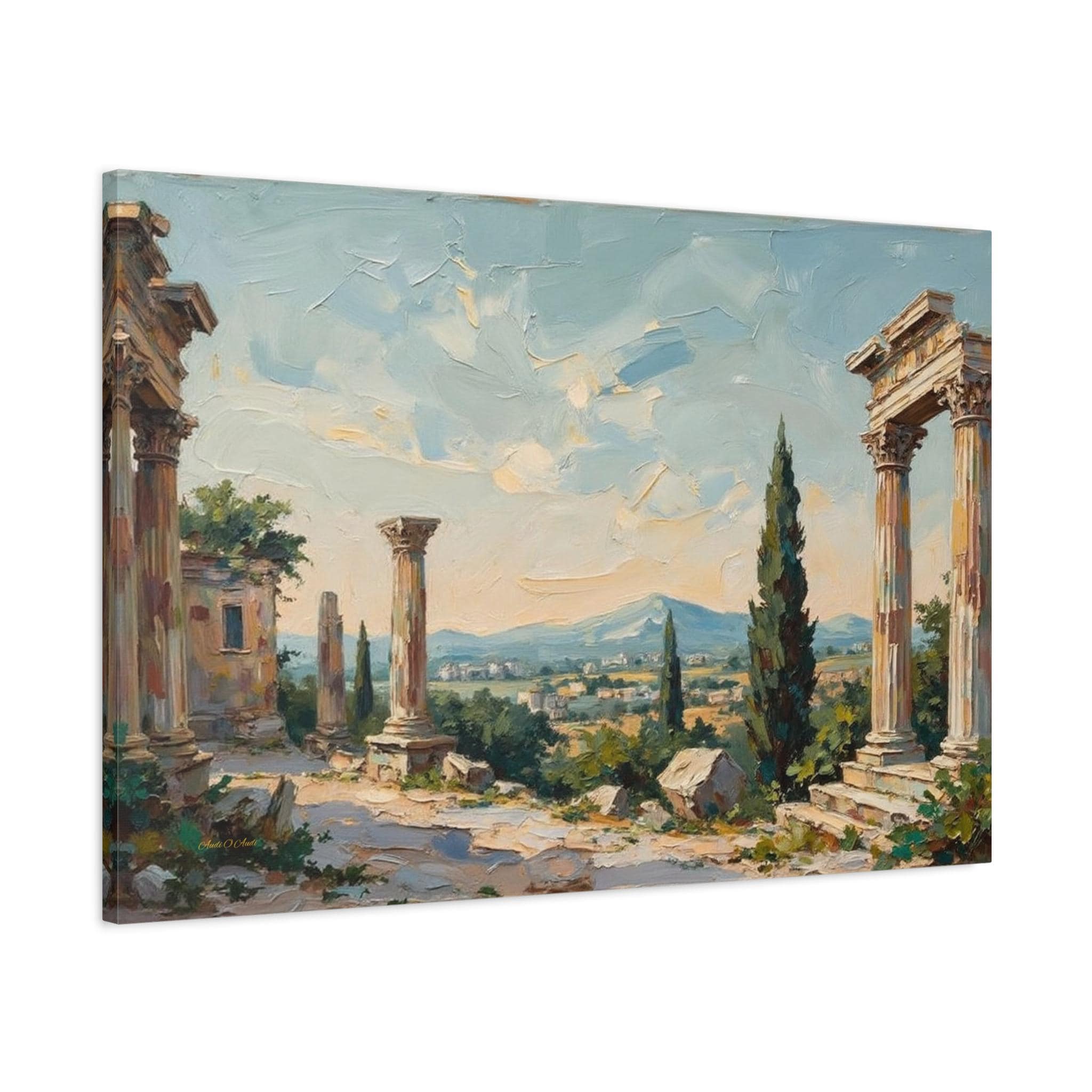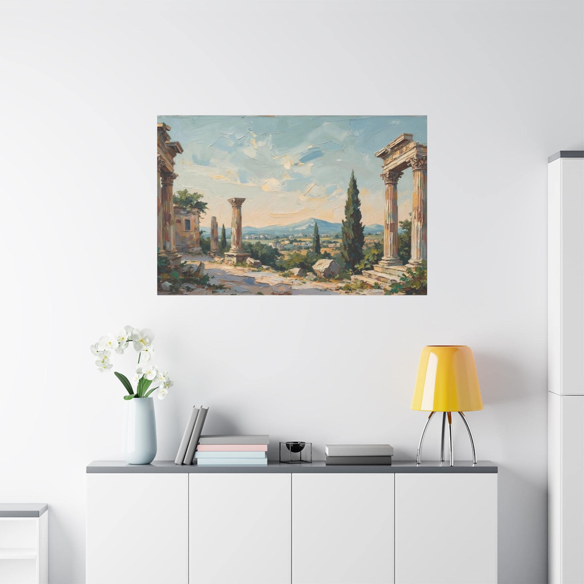 Bring the timeless elegance, historical grandeur, and sun-drenched romance of the ancient Mediterranean into your home with this stunning classical ruins landscape canvas print. This captivating horizontal artwork features the majestic remnants of ancient stone columns, beautifully framed by lush green cypress trees and overlooking a sweeping, picturesque valley with distant, soft blue mountains.