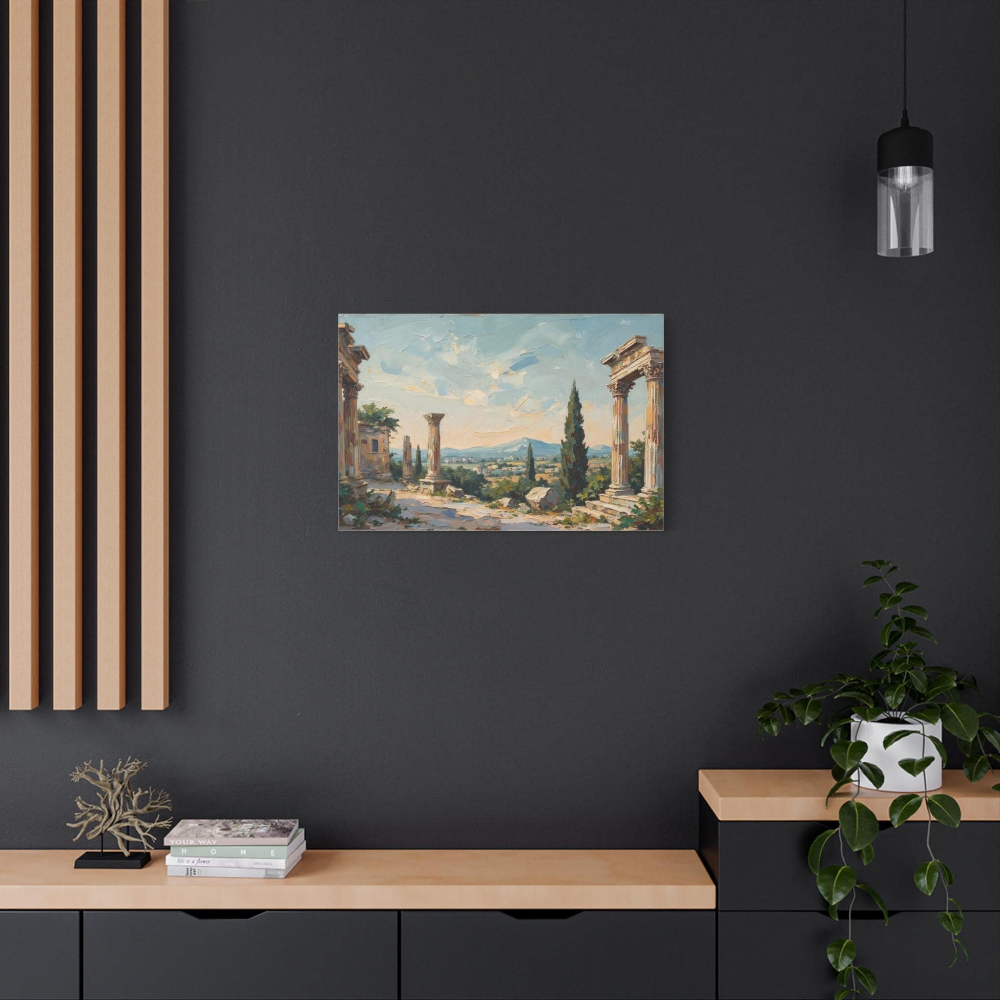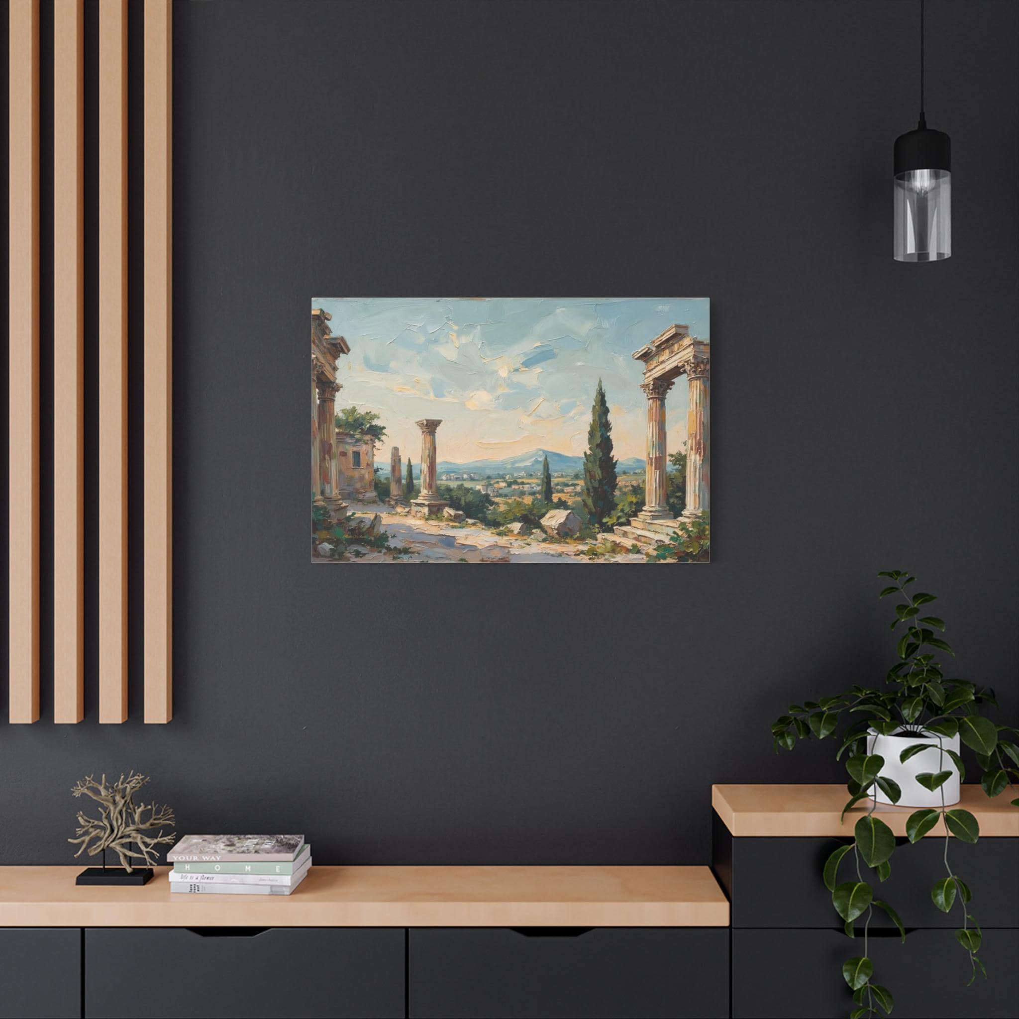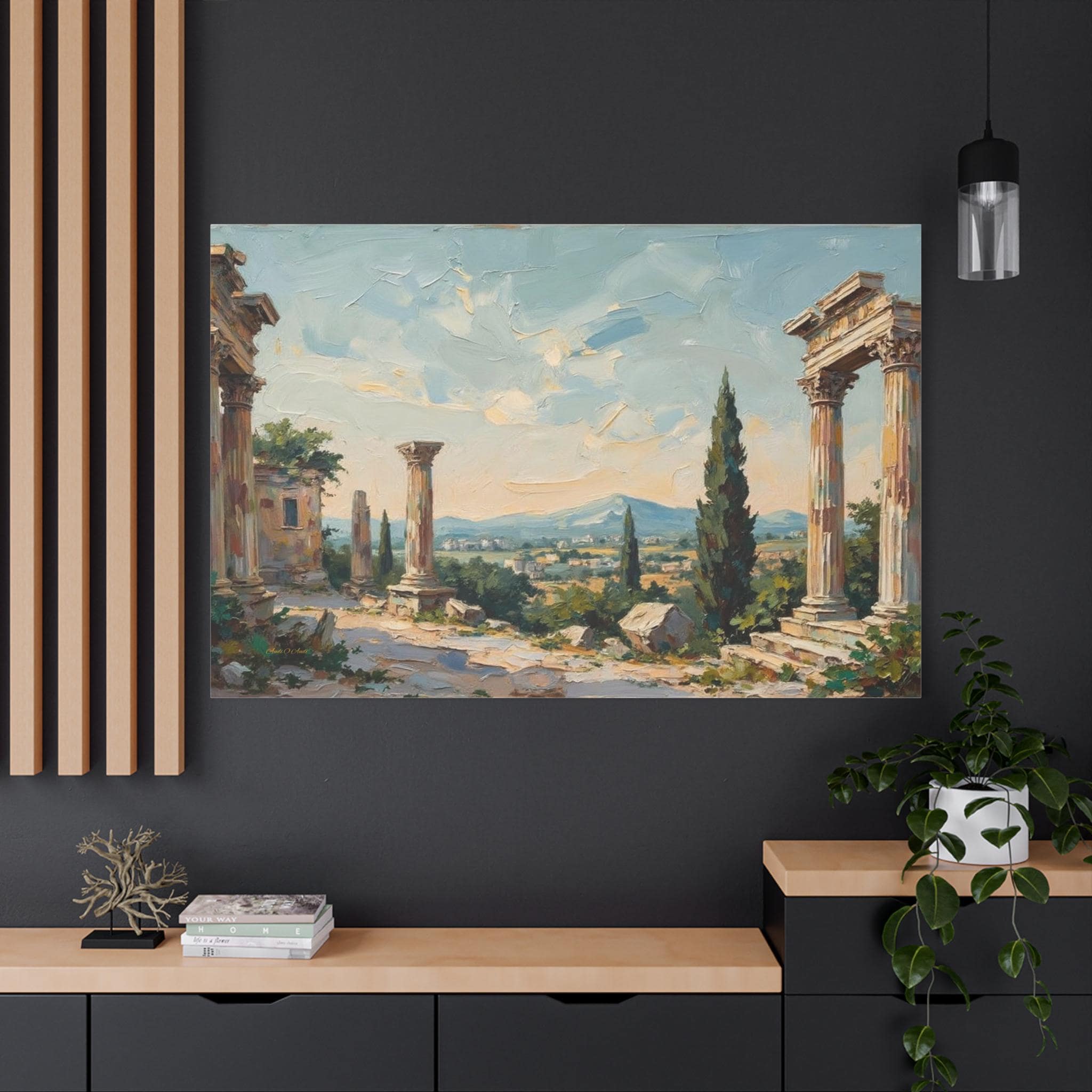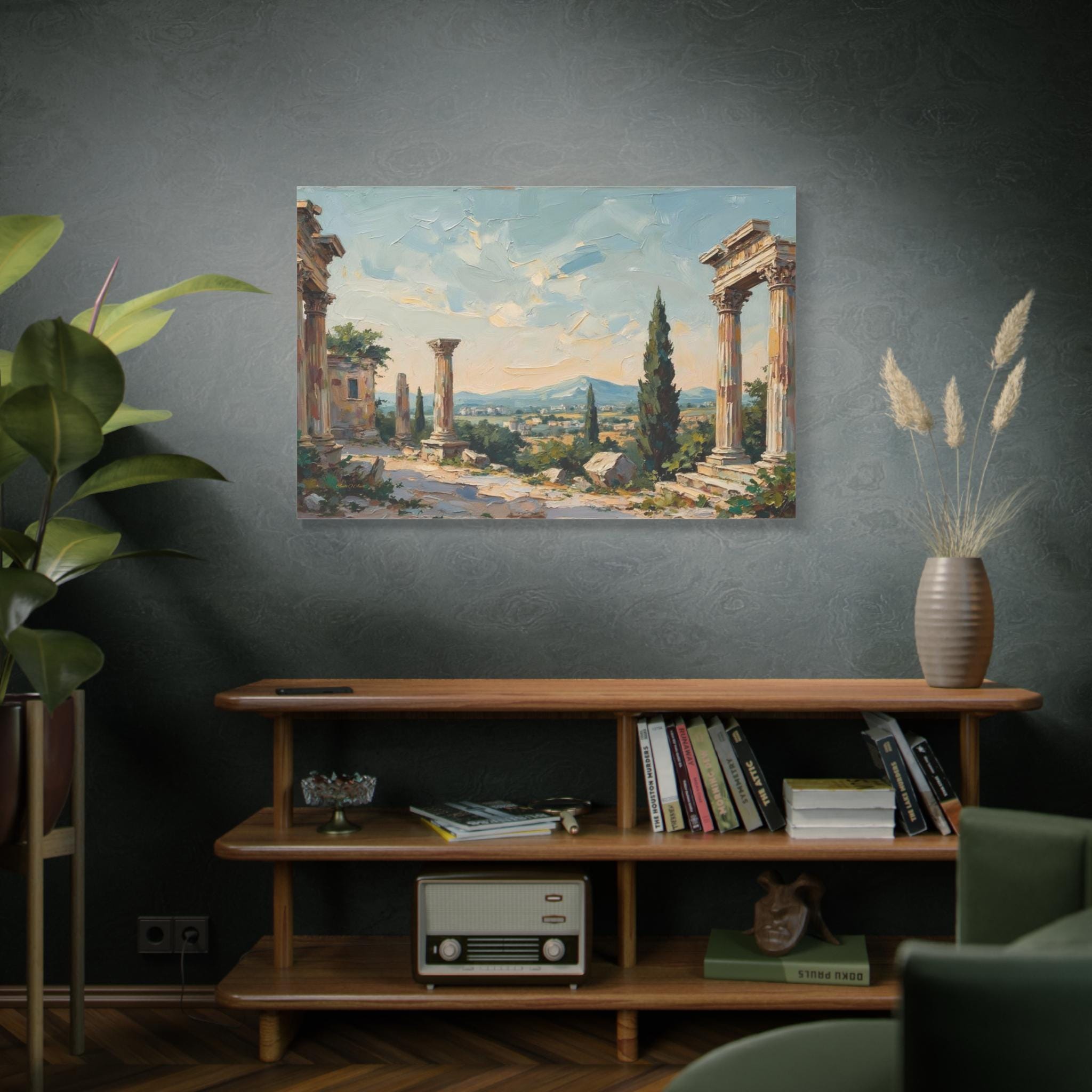 Bring the timeless elegance, historical grandeur, and sun-drenched romance of the ancient Mediterranean into your home with this stunning classical ruins landscape canvas print. This captivating horizontal artwork features the majestic remnants of ancient stone columns, beautifully framed by lush green cypress trees and overlooking a sweeping, picturesque valley with distant, soft blue mountains.