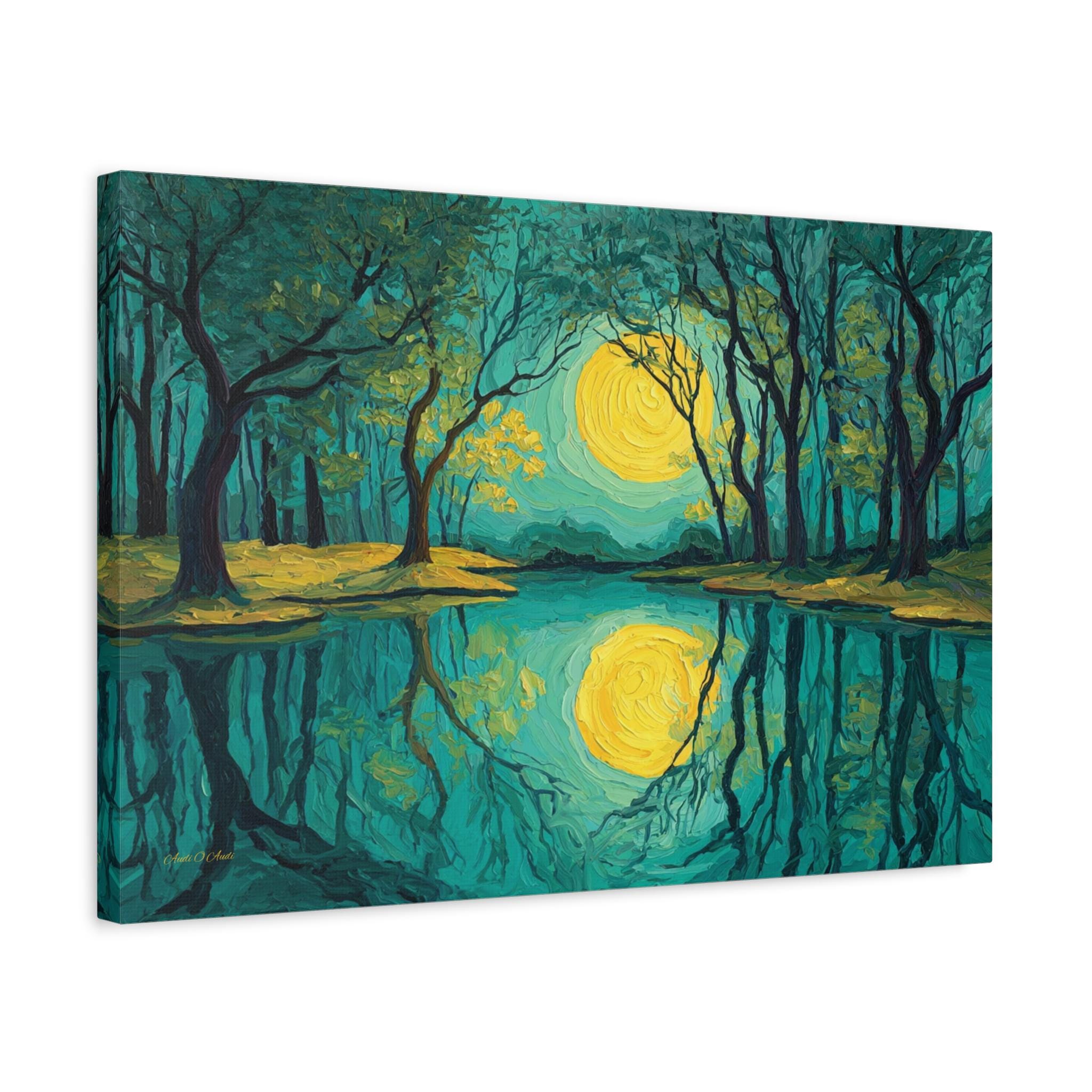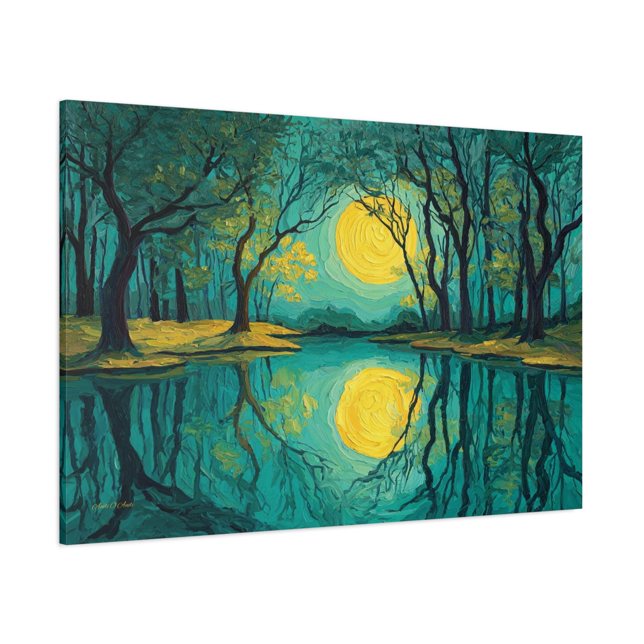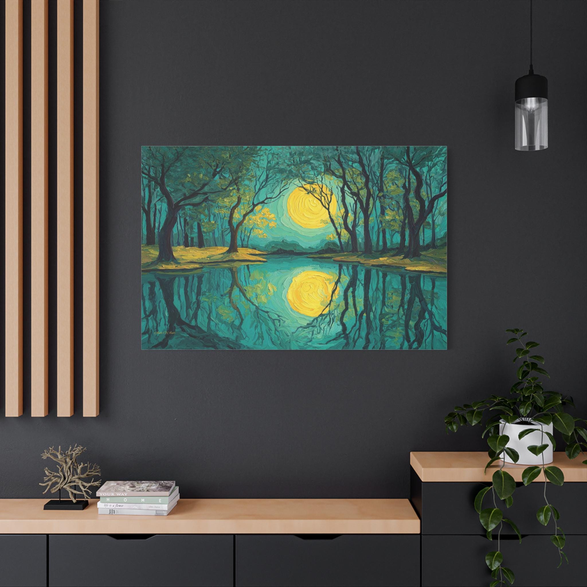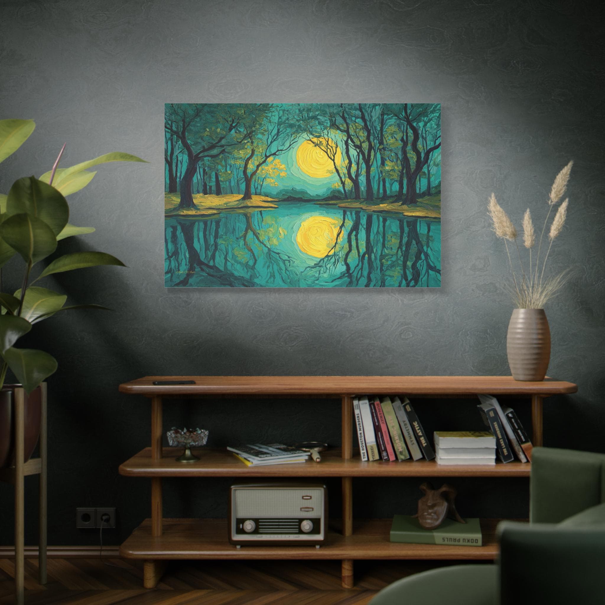 Bring breathtaking color, dreamlike magic, and expressive artistic energy into your home with this stunning mystical forest landscape canvas print. This captivating horizontal artwork features a serene, glassy river winding through a dense forest of silhouetted trees. A brilliant, swirling golden moon—or sun—glows in the vivid teal sky, casting a perfect, radiant reflection on the tranquil water below.