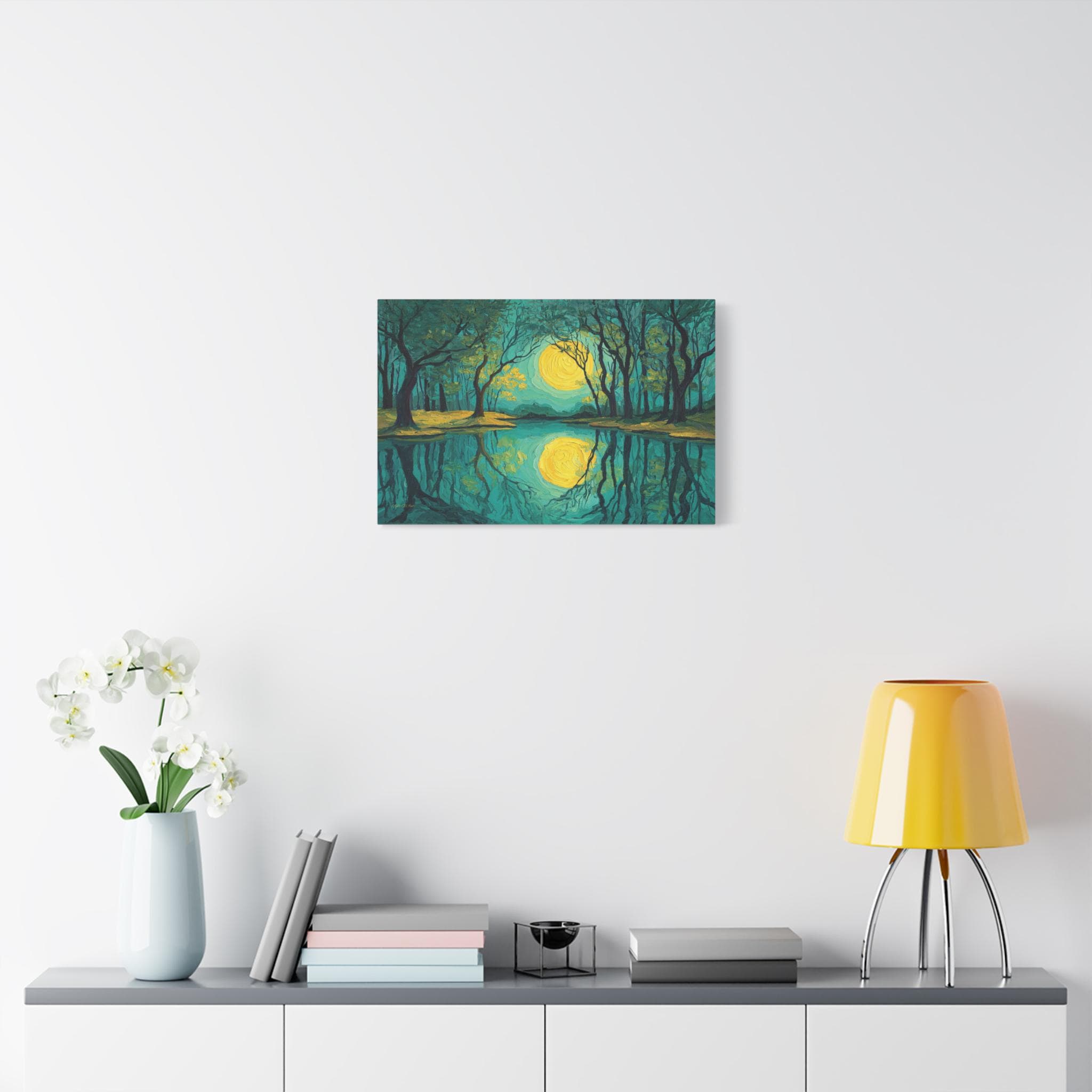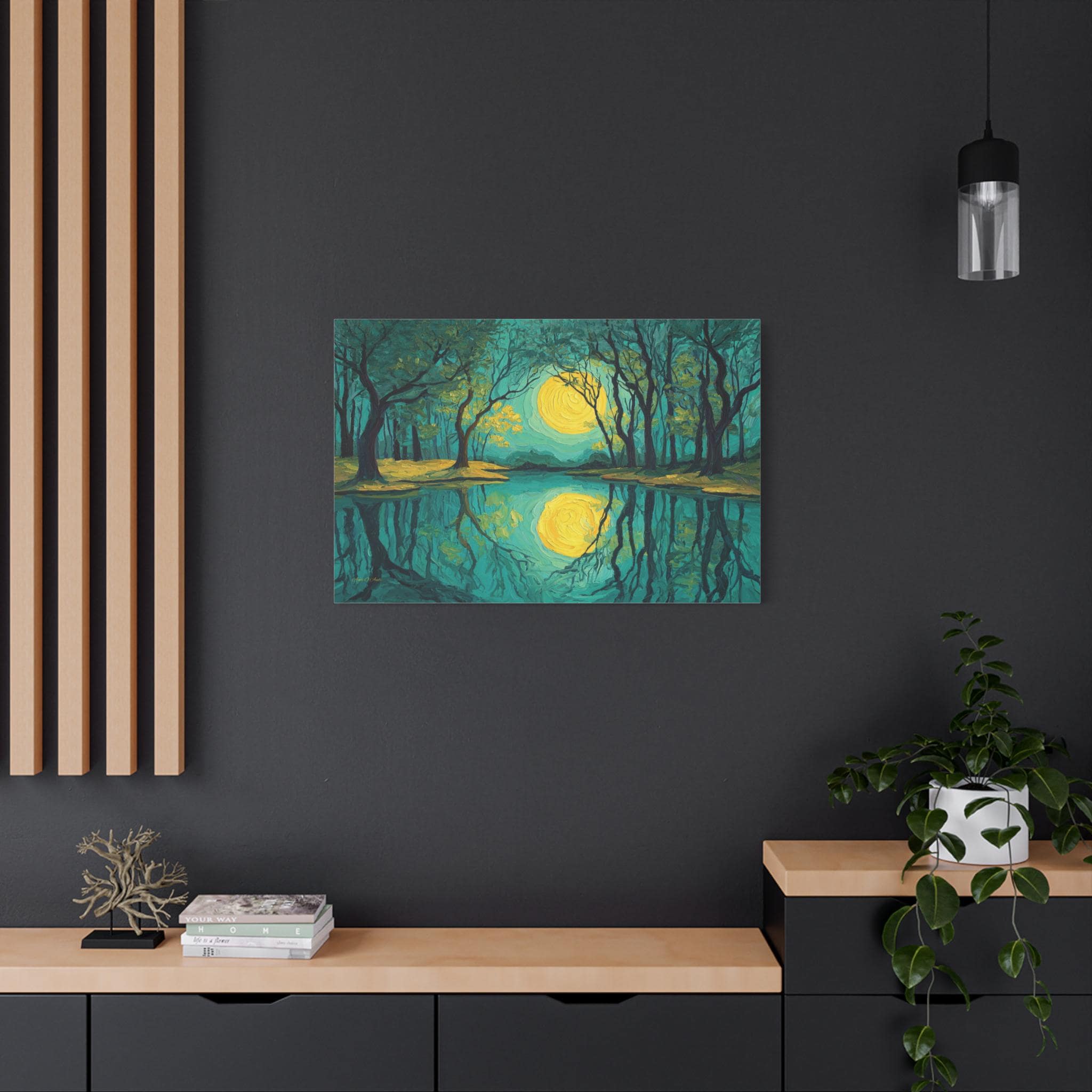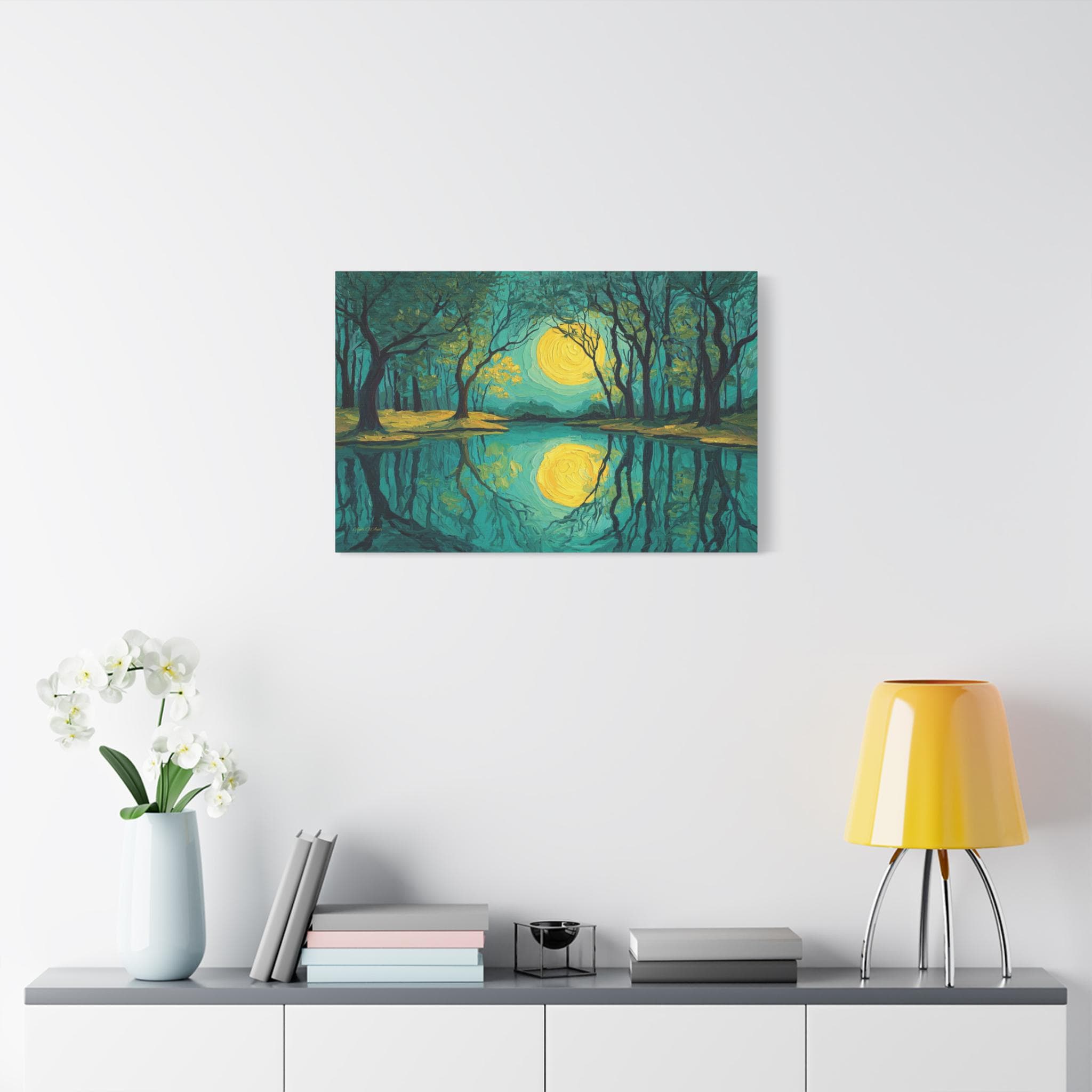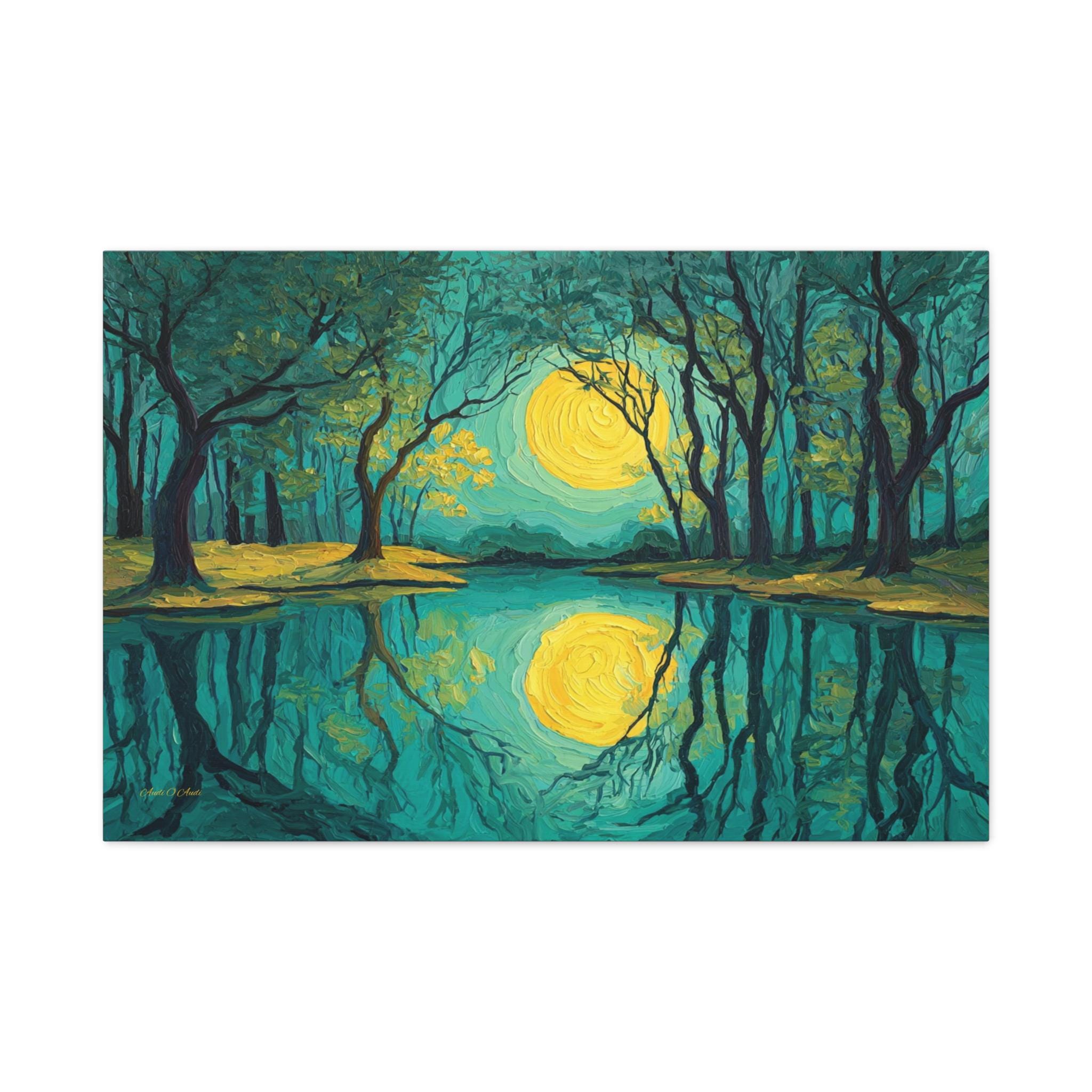 Bring breathtaking color, dreamlike magic, and expressive artistic energy into your home with this stunning mystical forest landscape canvas print. This captivating horizontal artwork features a serene, glassy river winding through a dense forest of silhouetted trees. A brilliant, swirling golden moon—or sun—glows in the vivid teal sky, casting a perfect, radiant reflection on the tranquil water below.