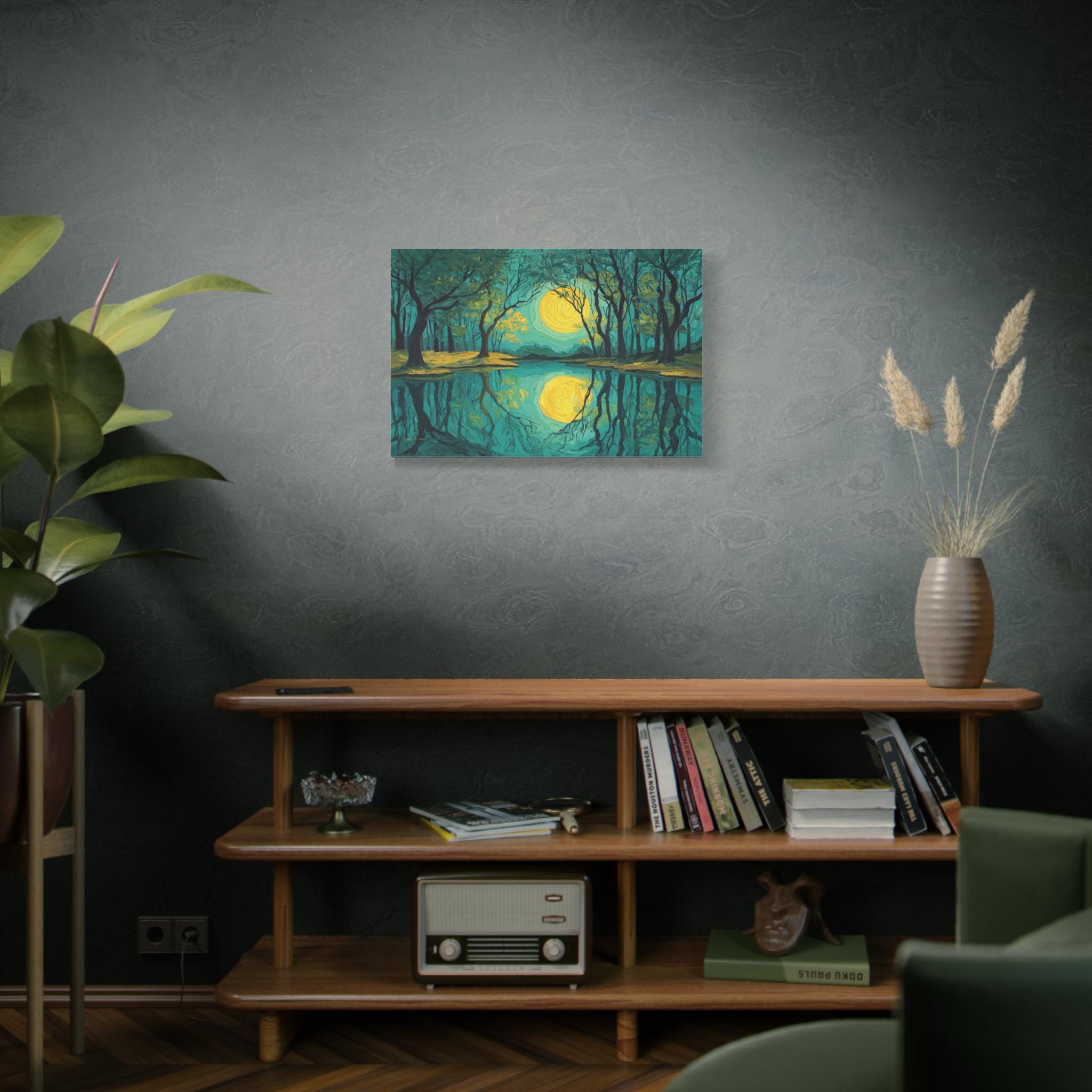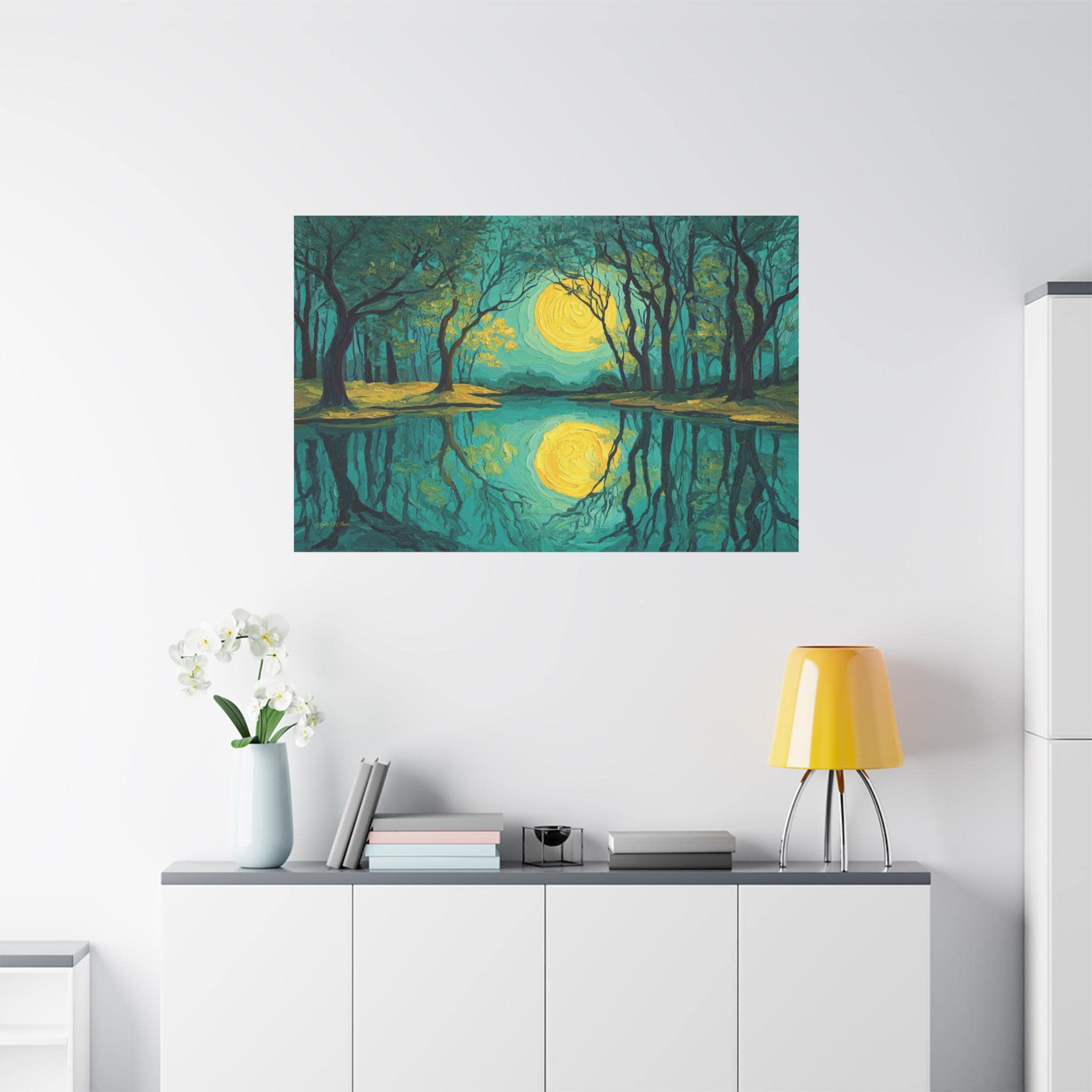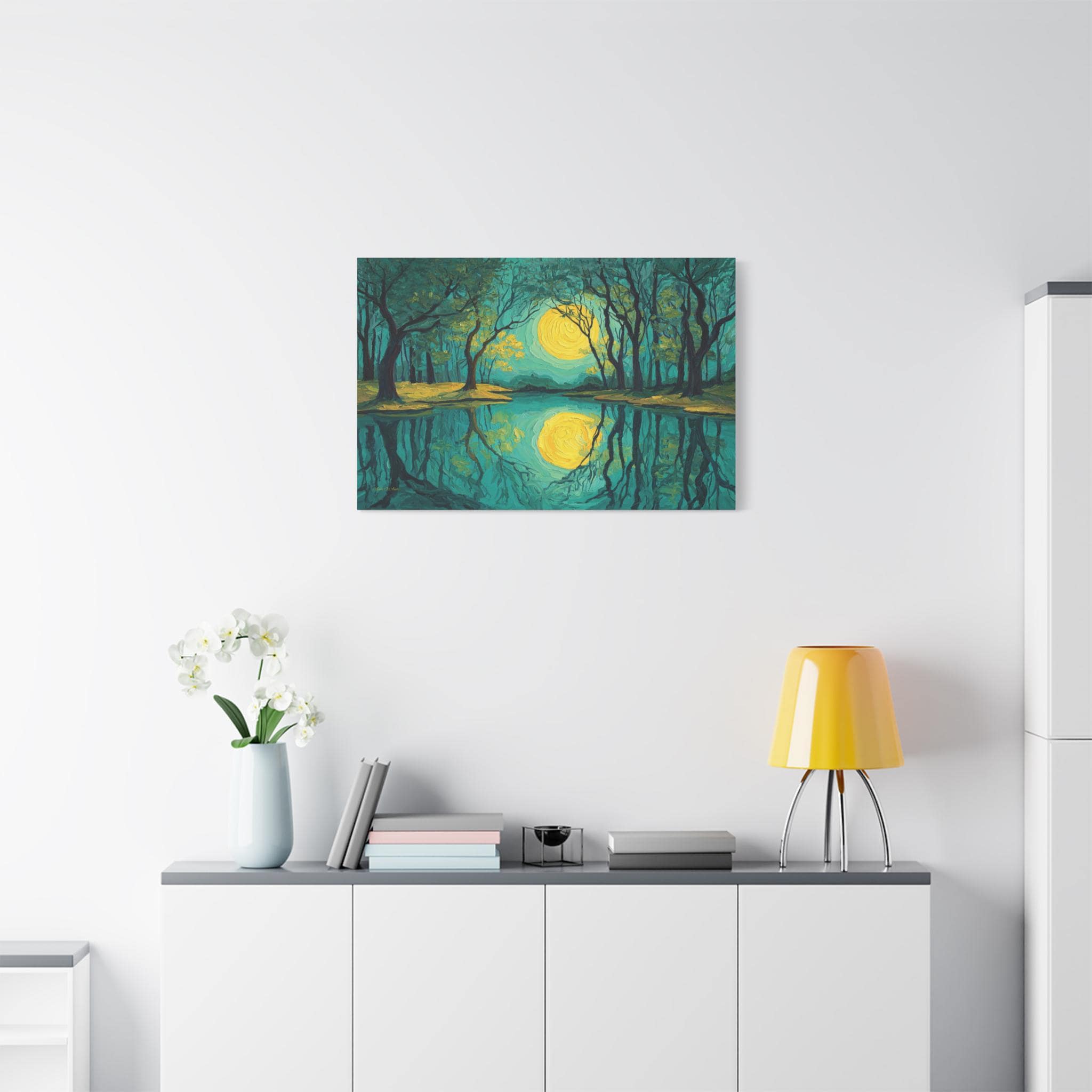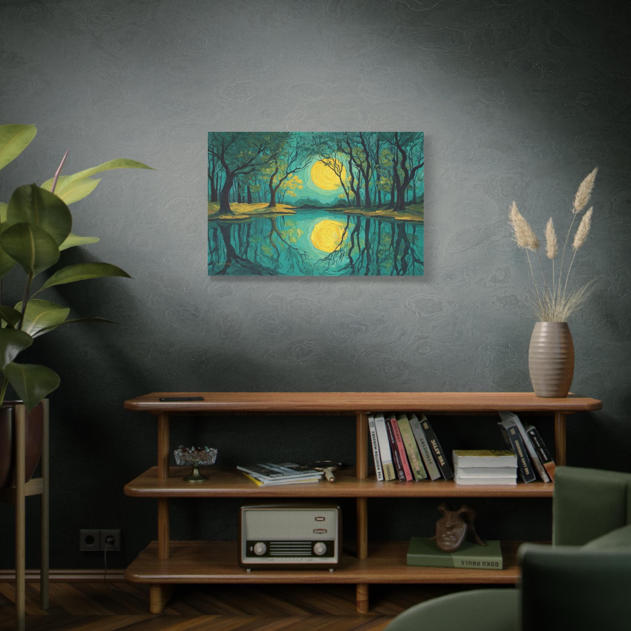 Bring breathtaking color, dreamlike magic, and expressive artistic energy into your home with this stunning mystical forest landscape canvas print. This captivating horizontal artwork features a serene, glassy river winding through a dense forest of silhouetted trees. A brilliant, swirling golden moon—or sun—glows in the vivid teal sky, casting a perfect, radiant reflection on the tranquil water below.