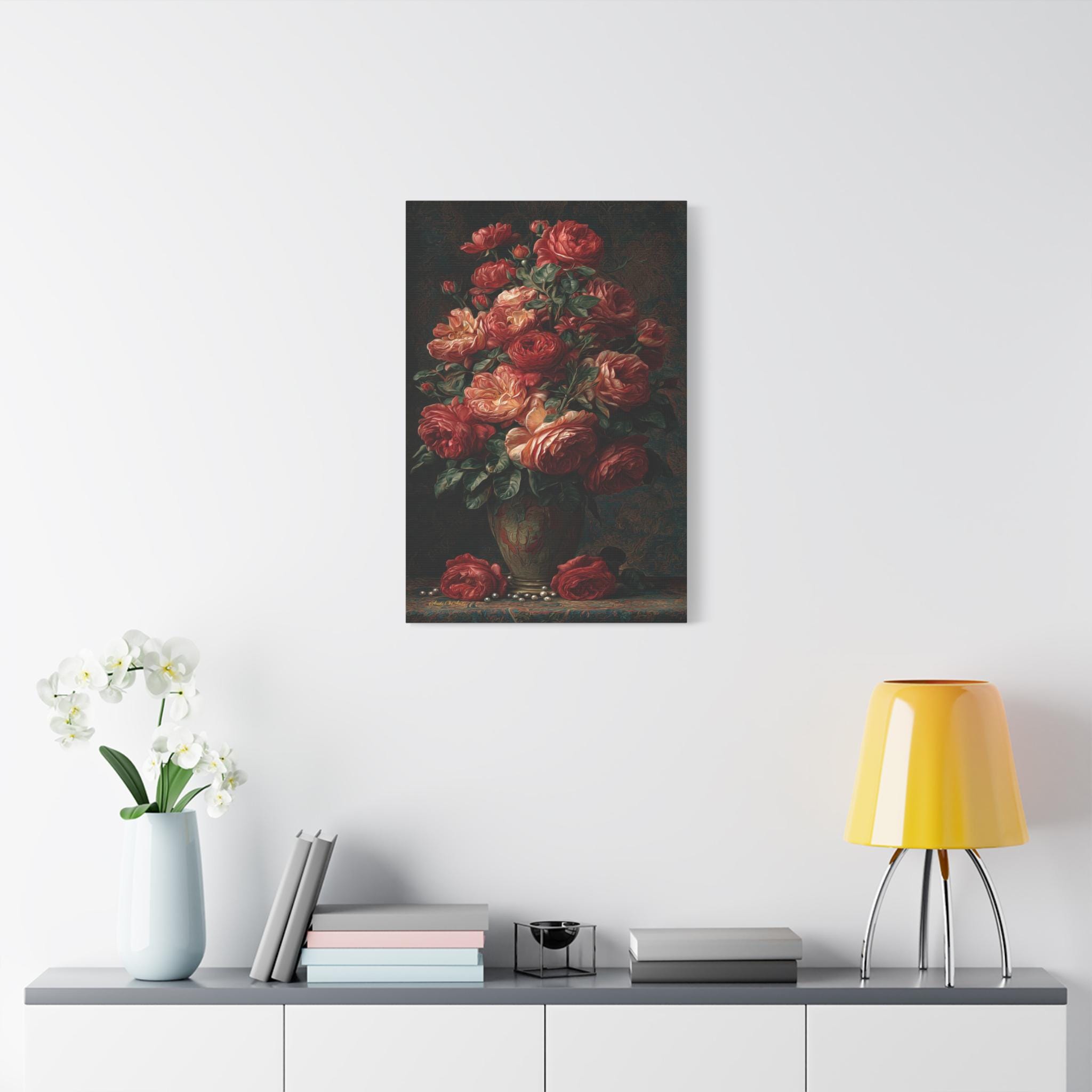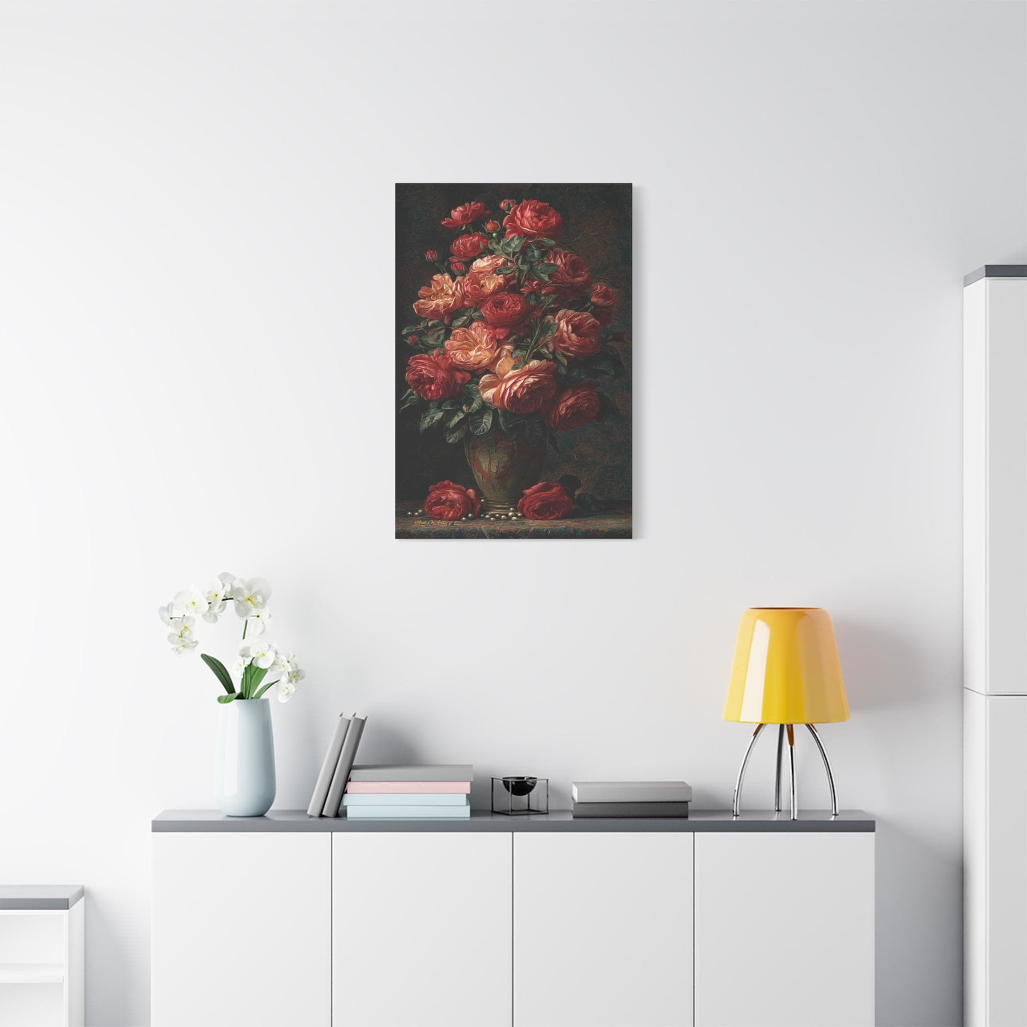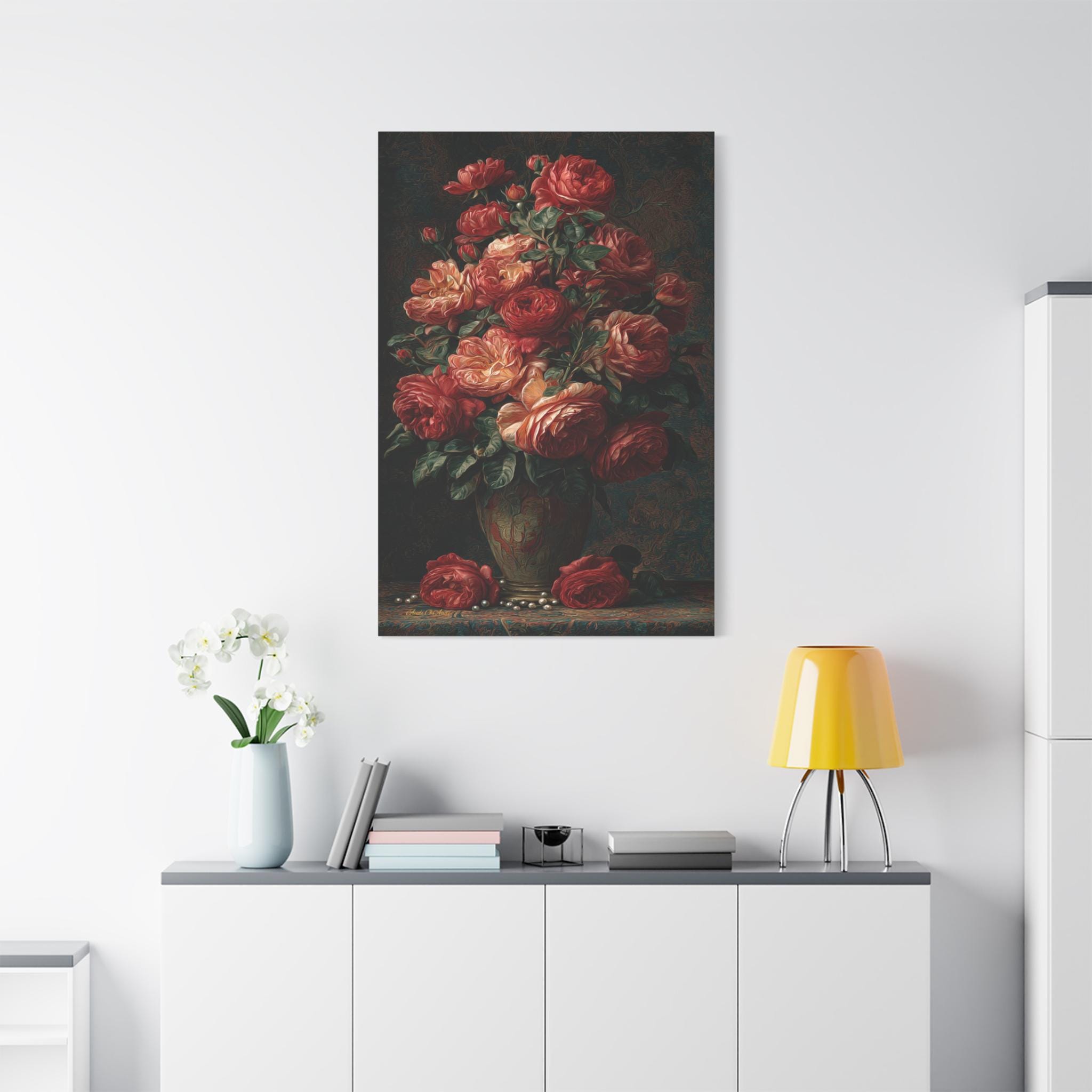Bring luxurious elegance, dark romance, and breathtaking artistic texture into your home with this stunning moody floral still life canvas print. This captivating vertical artwork features an opulent, towering bouquet of lush crimson, red, and warm apricot roses resting in a classic vase. The scene is brought to life with incredibly rich, swirling, heavily textured "brushstrokes" that cover the dark, tapestry-like background, the fallen blooms, and the delicate scattered pearls resting on the table below.