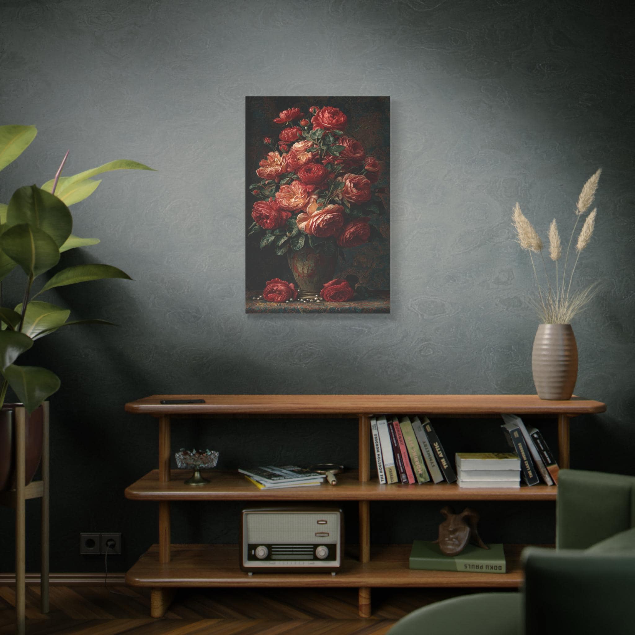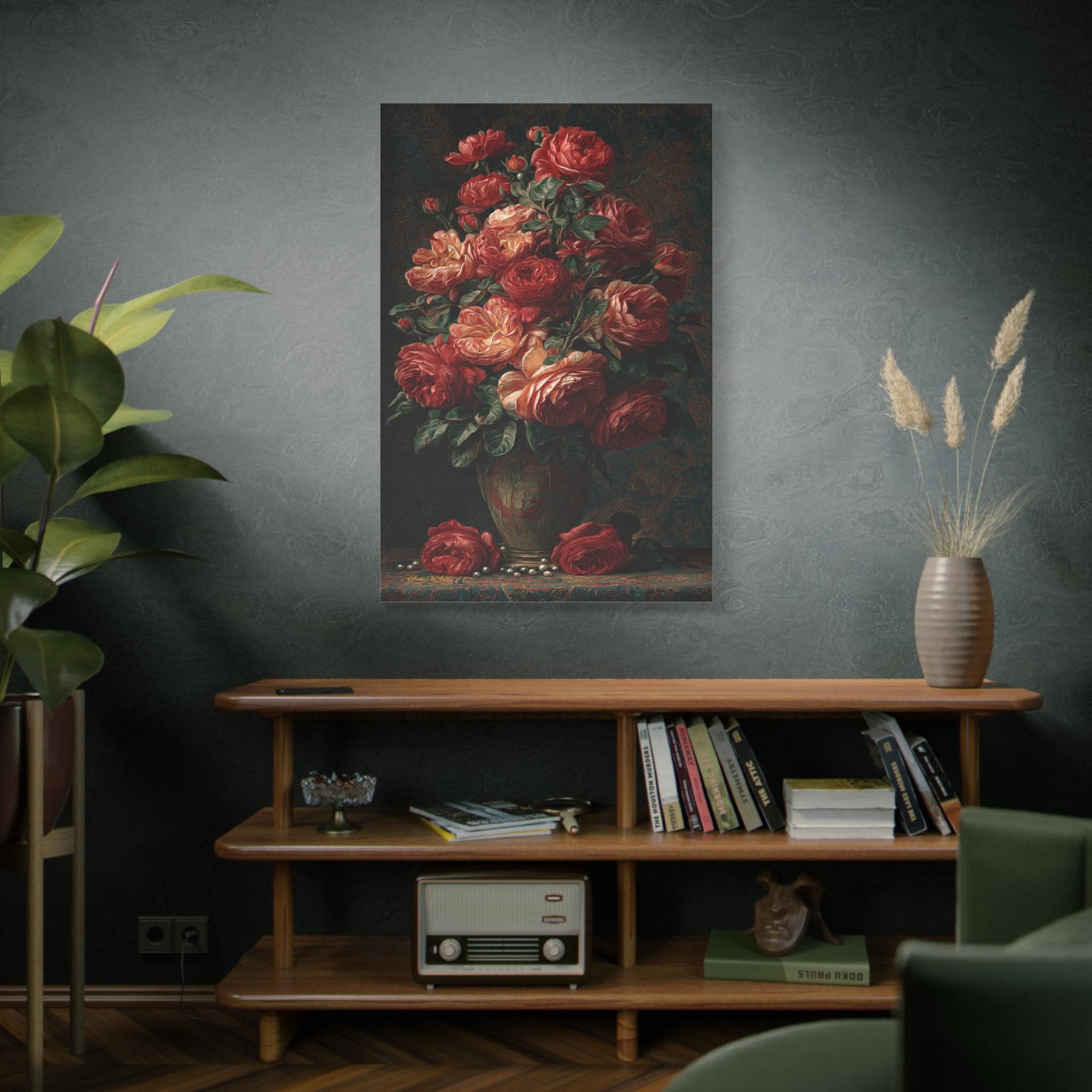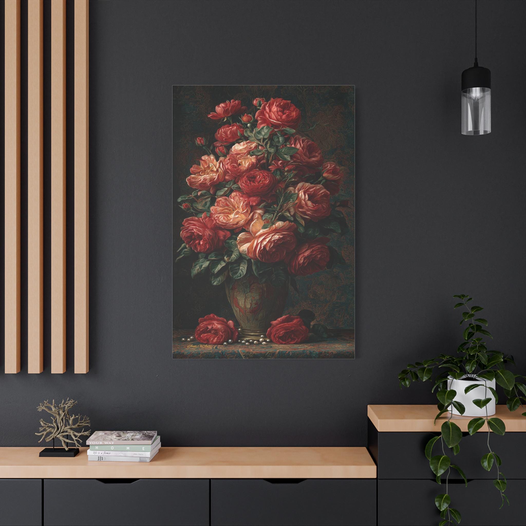 (Tip: Moody, highly textured floral still lifes add incredible sophistication and a pop of romantic color to dark rooms! A larger 24" x 36" or 30" x 40" size makes a massive, luxurious impact centered perfectly above a velvet bed frame, a fireplace mantle, or a dining room credenza.)